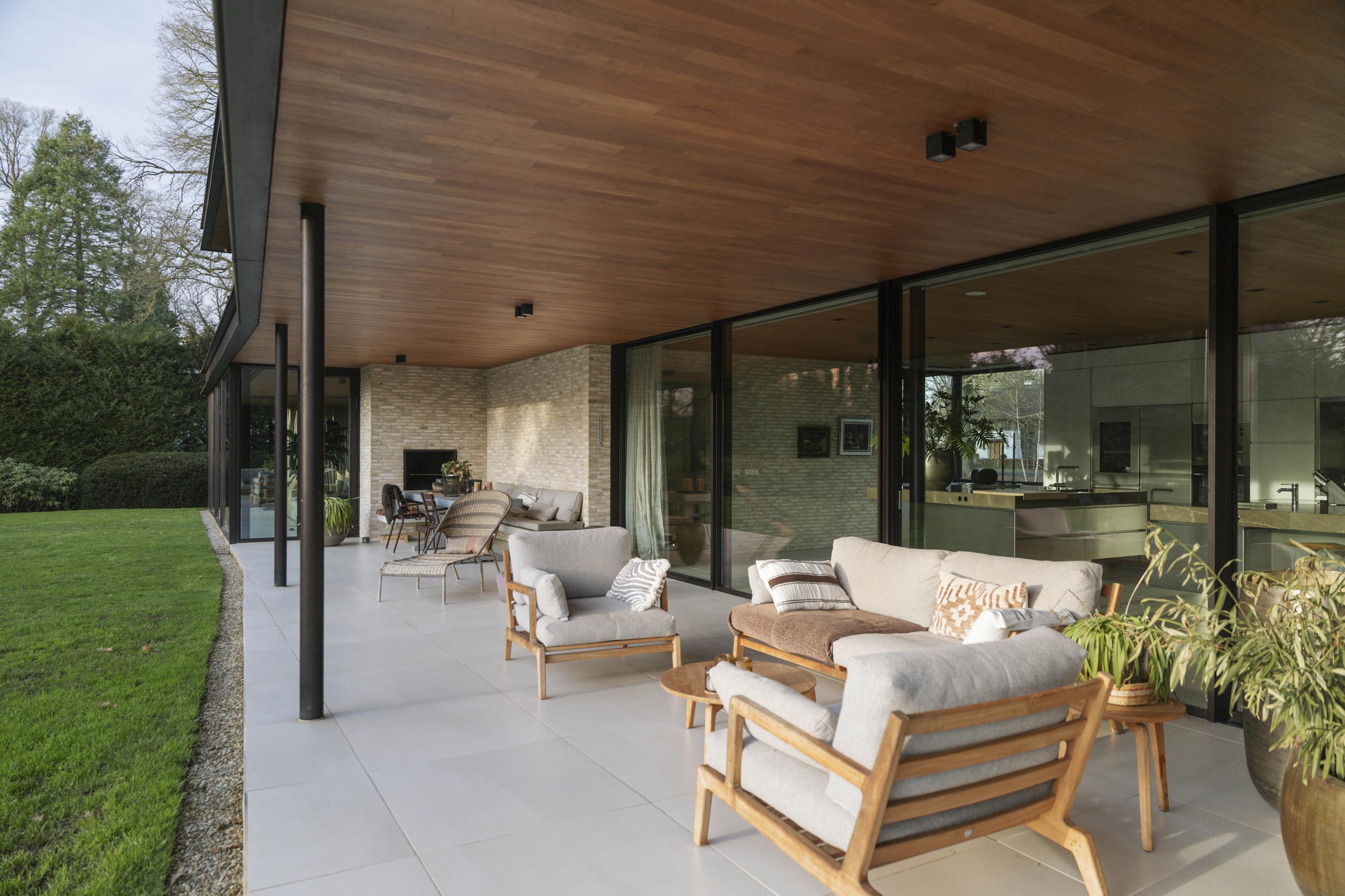 De leefkeuken (88 m²) vormt het hart van de woning. Vanuit deze ruimte is het uitzicht zowel aan de voor- als achterzijde indrukwekkend. Plafondhoge ramen en schuifpuien verbinden de keuken direct met het overdekte terras, dat is ingericht met een zit- en eetgedeelte en een buitenhaard van Metalfire. Het terras is de favoriete plek van het gezin; in de winter is het een zonnige plek door de lage lichtinval en in de zomer is het aangename loungeplek in de schaduw en luwte. Dankzij de overkapping en de buitenhaard is dit een plek waar het grootste deel van het jaar comfortabel kan worden verbleven.