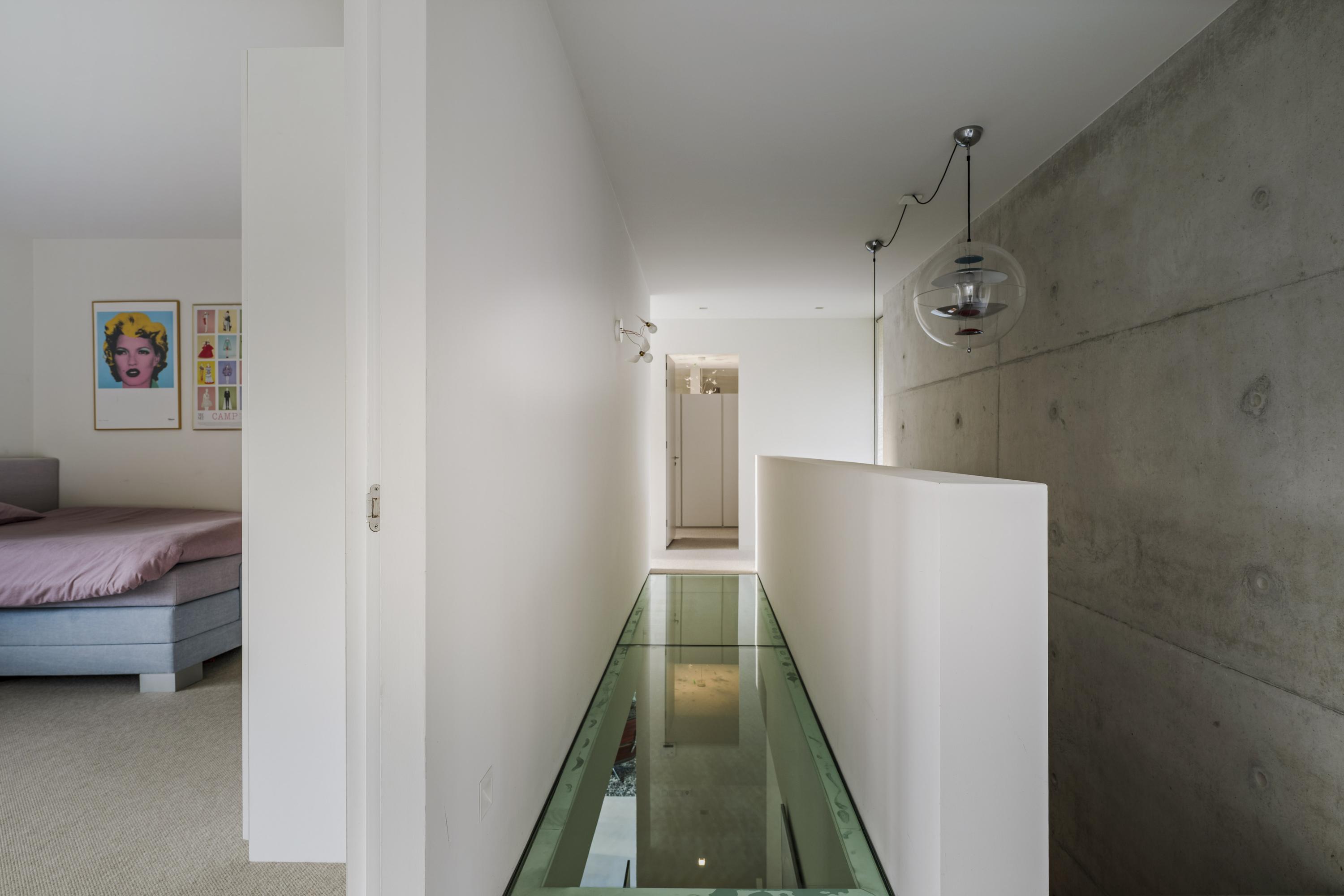 Tussen de leefkeuken en de living bevindt zich het trappenhuis, dat toegang geeft tot zowel de bovenverdieping als het souterrain.