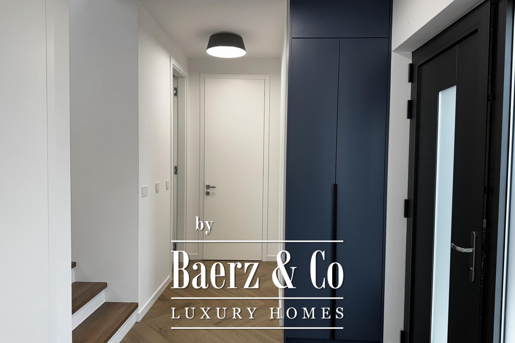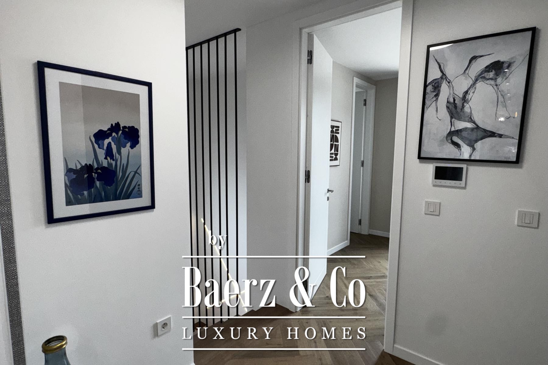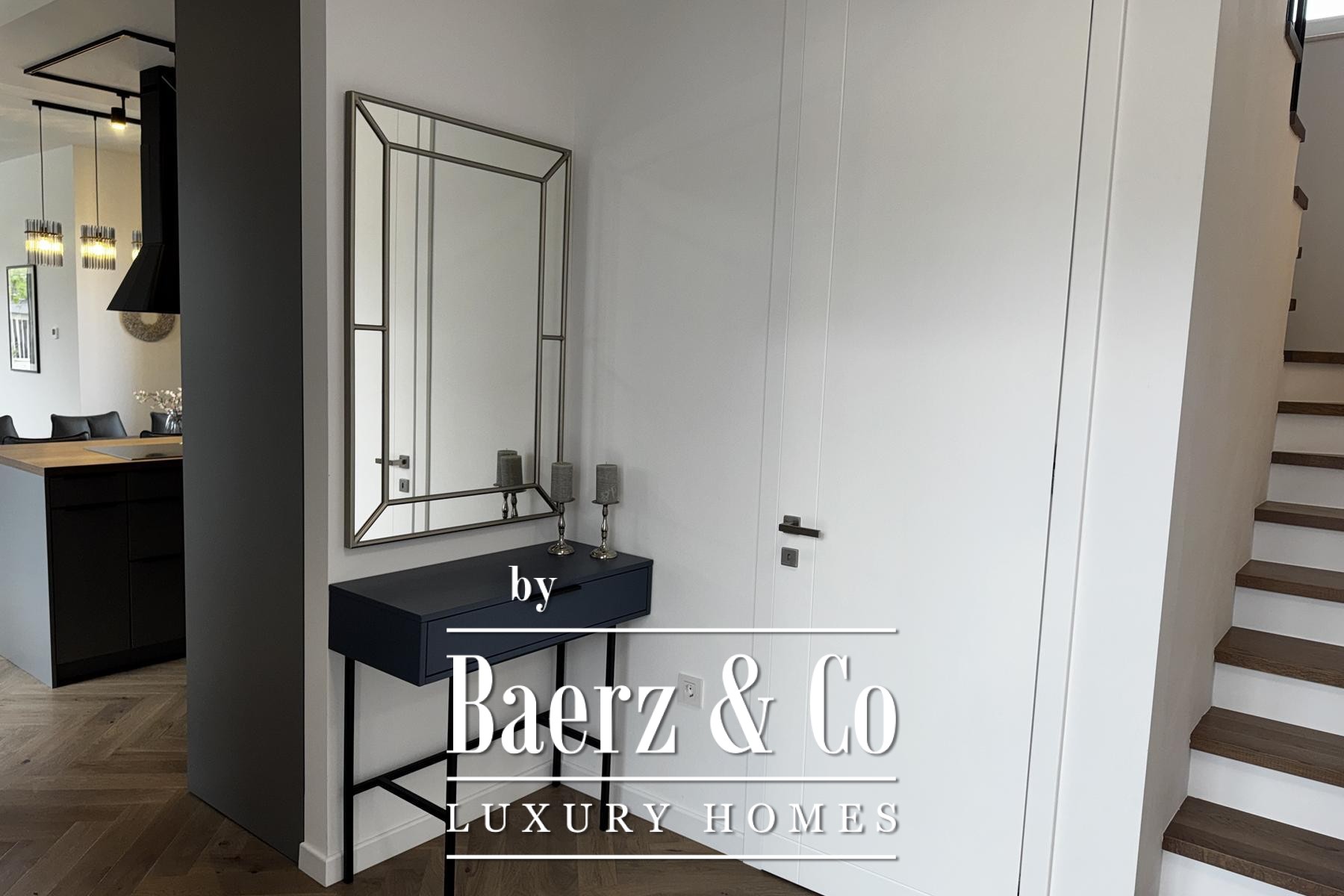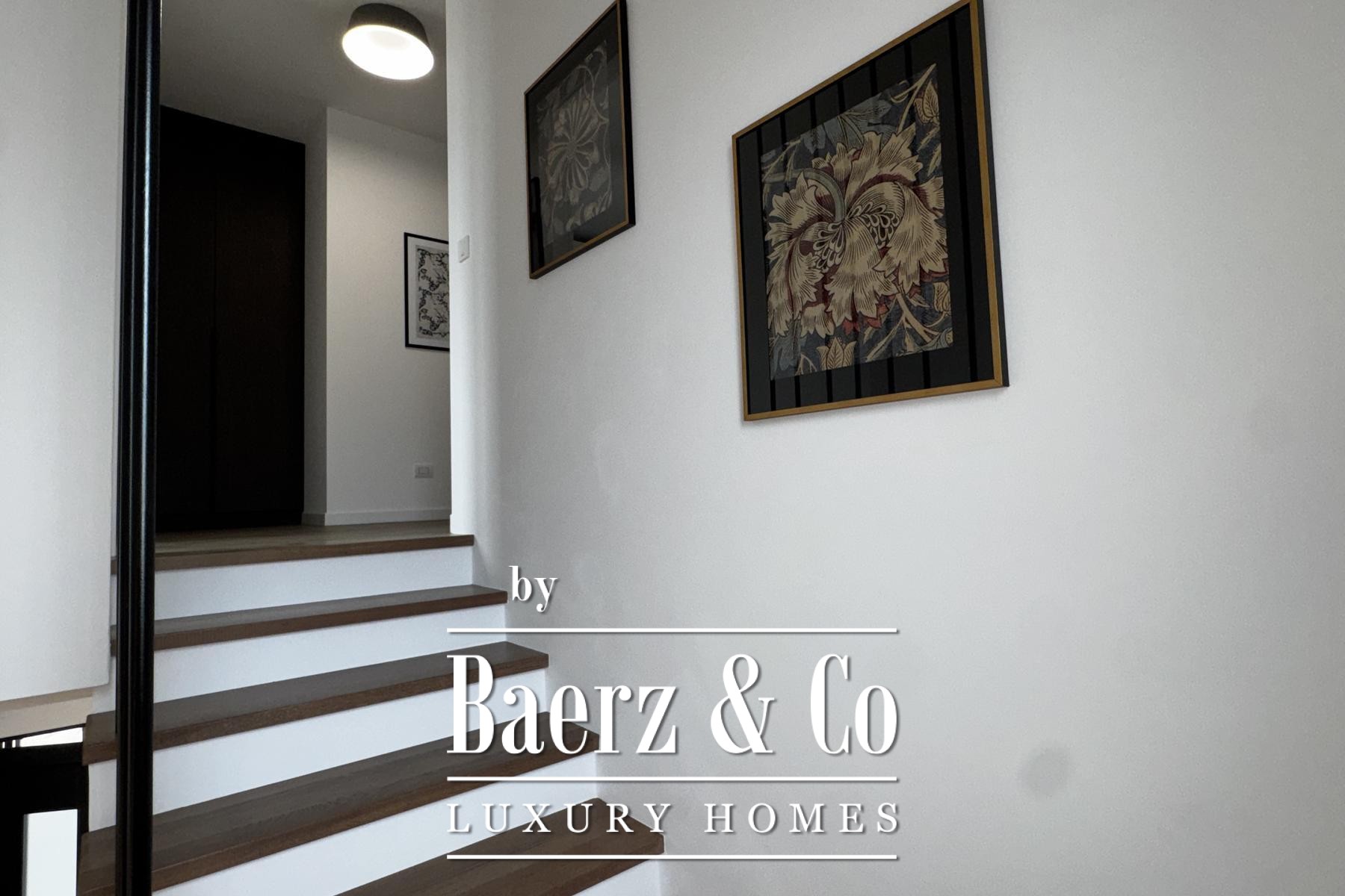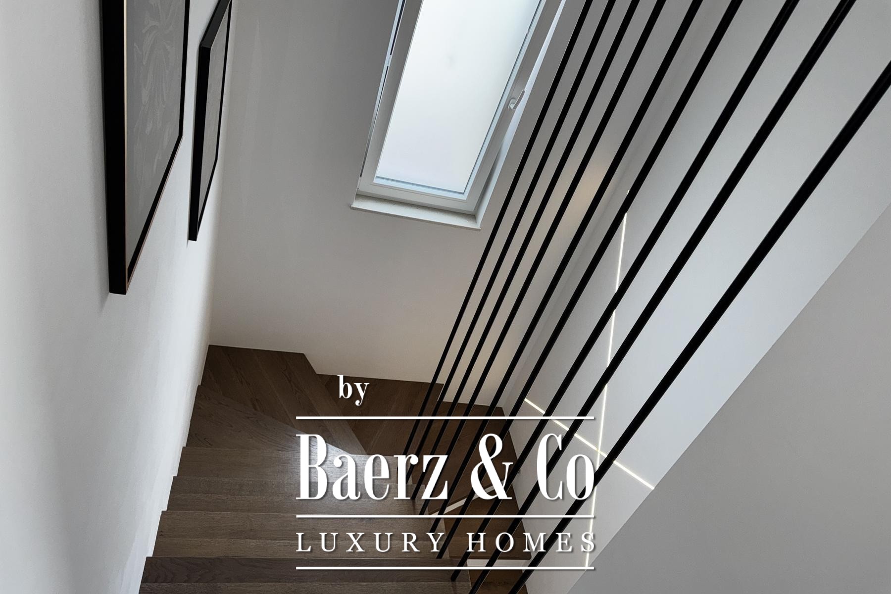 Övre våningen rymmer tre sovrum, däribland en mastersvit med walk-in-closet och en sekundär svit med privat badrum och terrassutgång. Planeringen ger en genomtänkt balans mellan integritet och ljusinsläpp. Materialvalen håller hög klass: trelagersparkett, massiva trappor i trä, dörrar från golv till tak samt kvalitativa ytskikt skapar en atmosfär av diskret elegans.