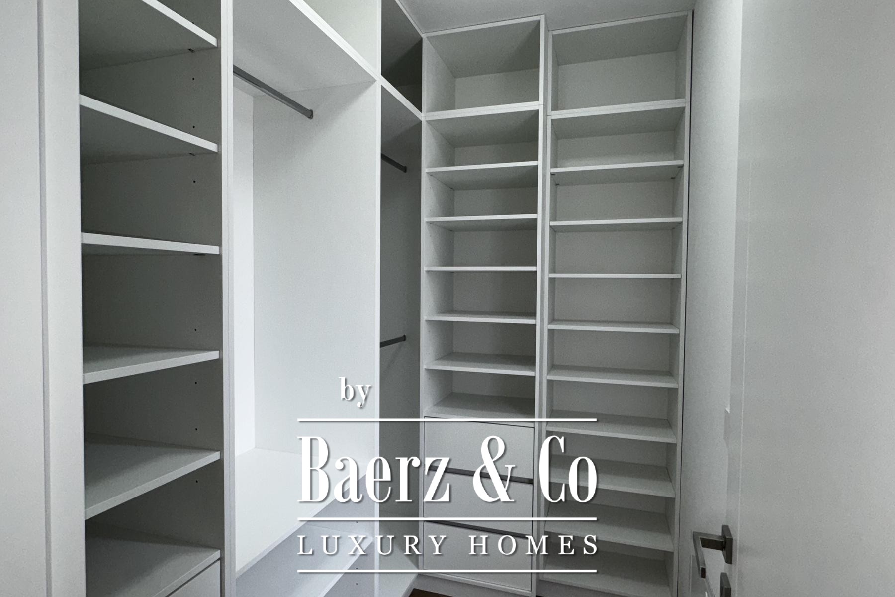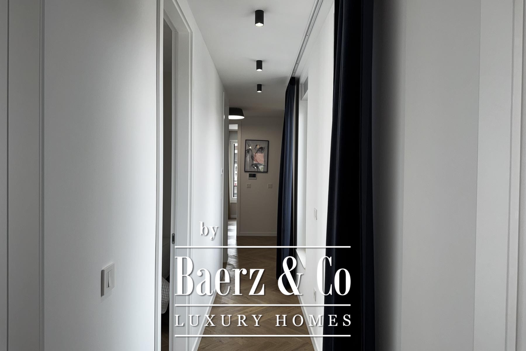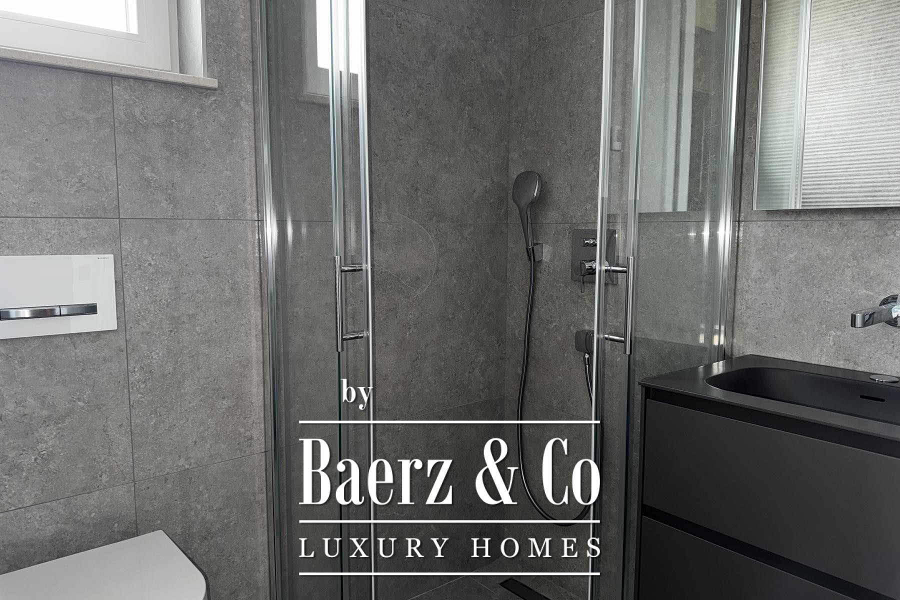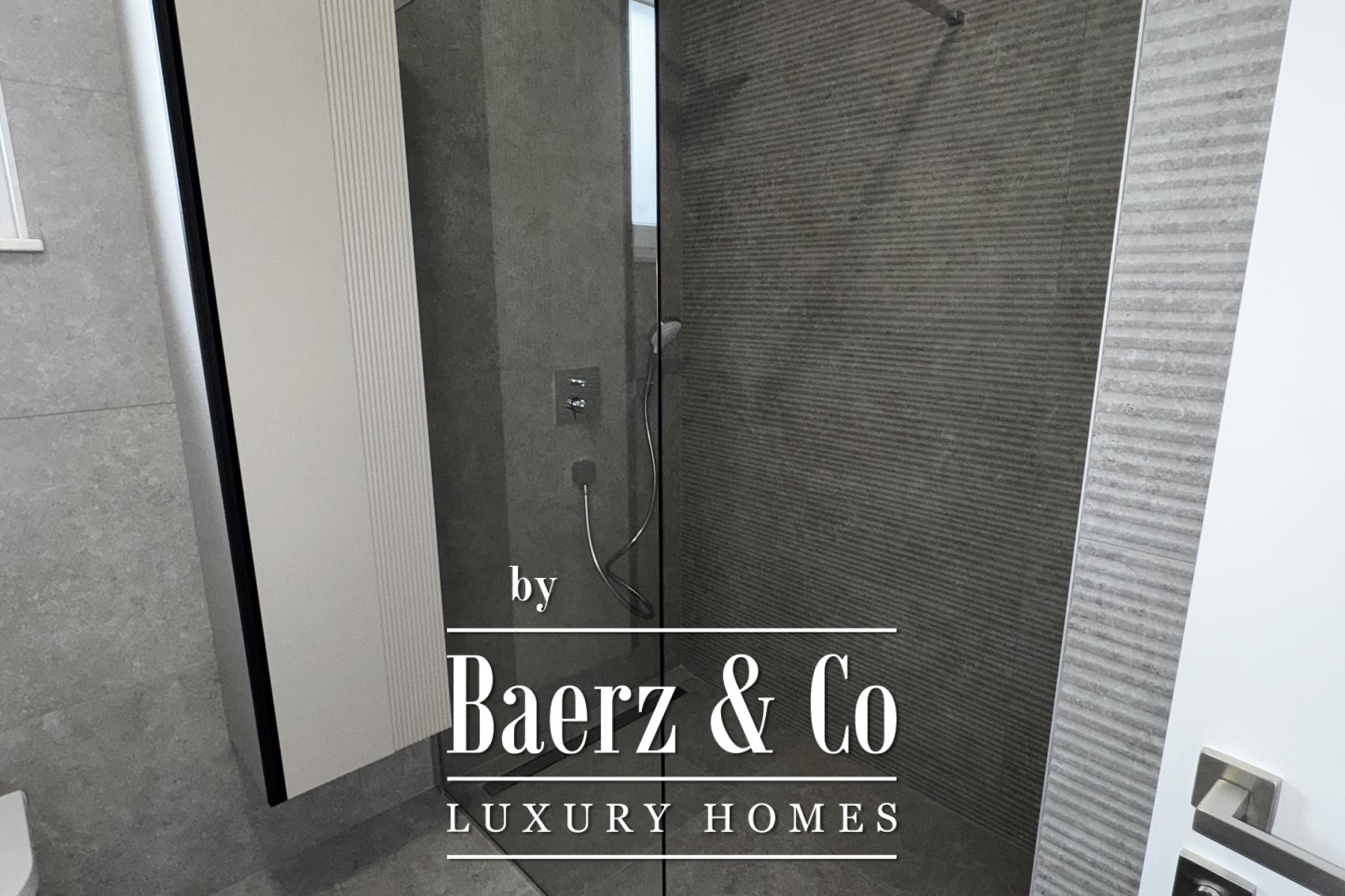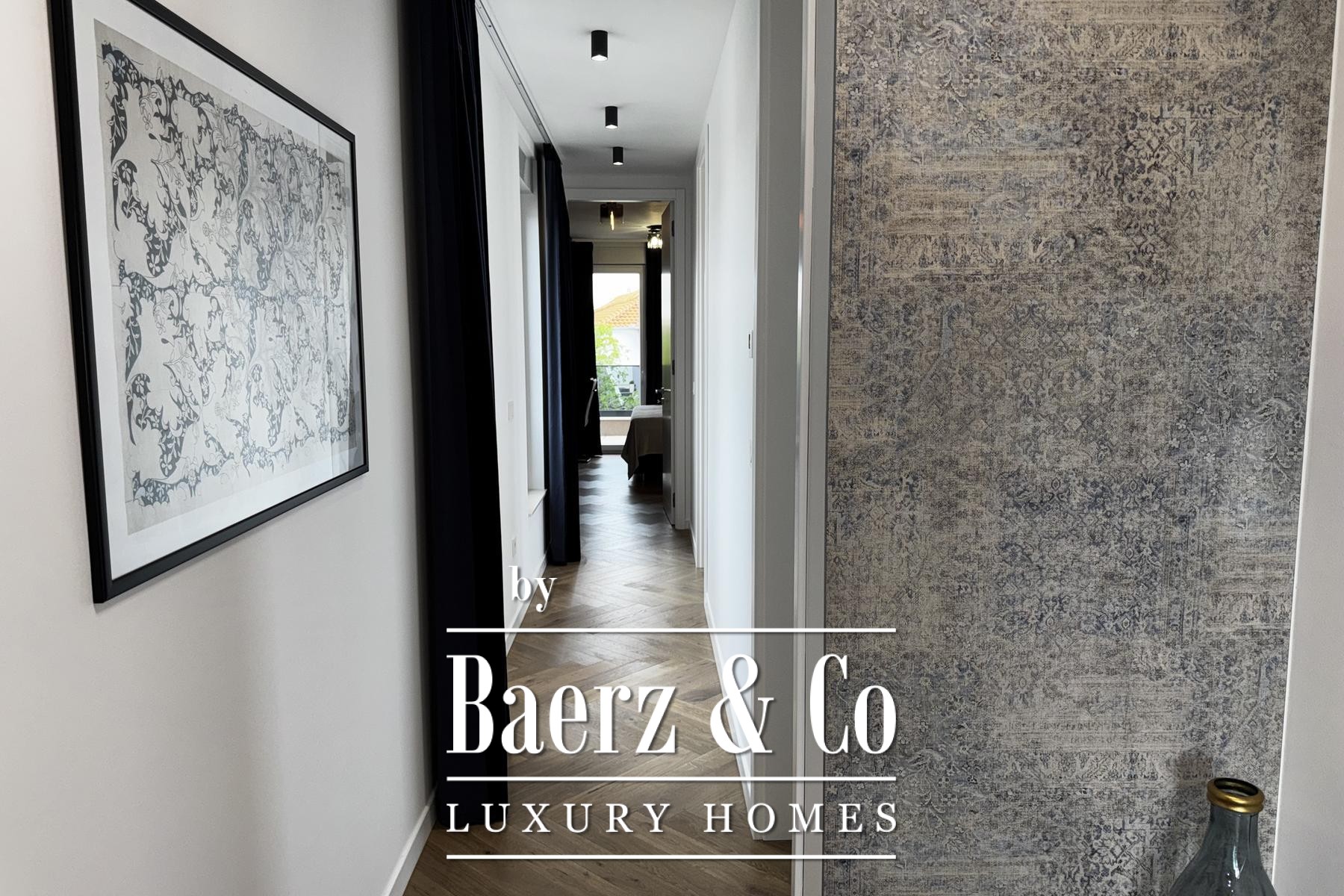 Övre våningen rymmer tre sovrum, däribland en mastersvit med walk-in-closet och en sekundär svit med privat badrum och terrassutgång. Planeringen ger en genomtänkt balans mellan integritet och ljusinsläpp. Materialvalen håller hög klass: trelagersparkett, massiva trappor i trä, dörrar från golv till tak samt kvalitativa ytskikt skapar en atmosfär av diskret elegans.