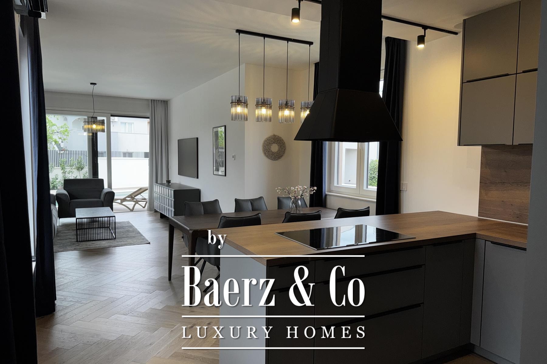 Villan är fördelad över två plan, med ett öppet kök och matplats samt ett rymligt vardagsrum som leder ut till en anlagd trädgård med uppvärmd pool och utedusch. På entréplanet finns även en gästtoalett med tvättmöjligheter, förråd samt direktaccess till garage. Nyckelordet lyxvilla Vodice fångar perfekt denna bostads karaktär och förenar tidlös design med intelligent styrsystem.