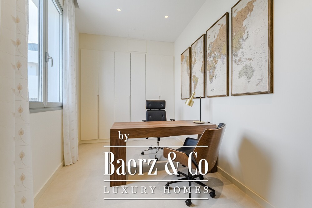 五间套房卧室均设有独立卫浴和充足的嵌入式衣柜,分布于同一层,确保舒适、私密与便利的通行。挑高天花板与大片窗户引入充沛自然光线,专属书房为远程办公营造静谧环境。厨房现代雅致、设备齐全,巧妙融入居家日常与高雅宴请之中。