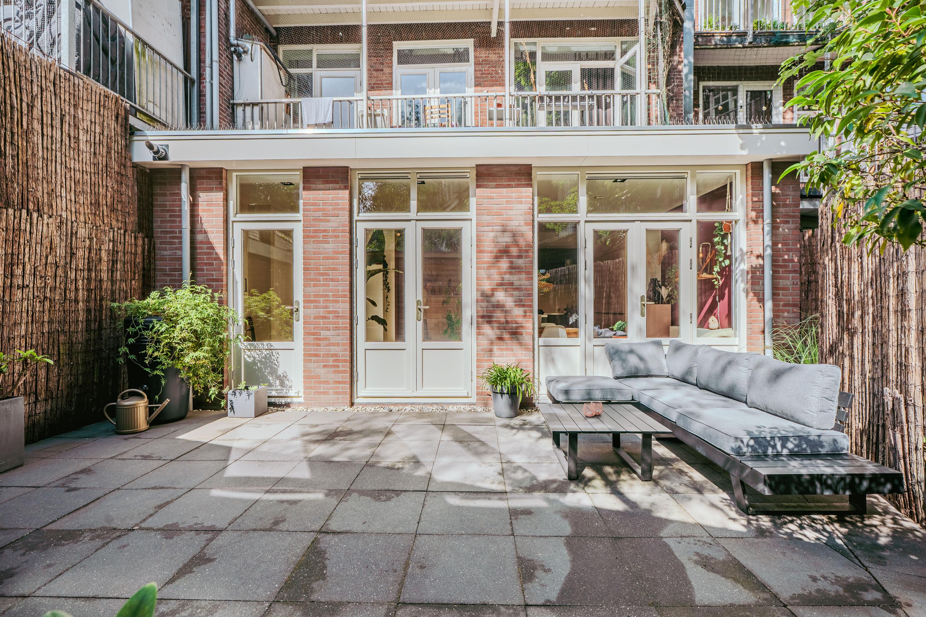 Via de hal bereikt u de ruime en lichte woonkamer, evenals de eerste goed bemeten slaapkamer aan de voorzijde van de woning. In de hal bevinden zich bovendien praktische inbouwkasten voor extra bergruimte. De woonkamer strekt zich uit tot aan de achterzijde van het appartement en profiteert van een prachtige lichtinval, mede dankzij de 2,5 meter diepe uitbouw, de grote raampartijen en de openslaande deuren naar de tuin. Indien gewenst kan hier eenvoudig een derde slaapkamer worden gerealiseerd. De zonnige achtertuin van circa 38 m² is gelegen op het zuiden en biedt uitzonderlijk veel privacy. Bovendien beschikt de tuin over een handige schuur met overkapping, ideaal voor extra opslag of fietsen. De moderne open keuken vormt het hart van de woning en is uitgerust met een 5-pits gasfornuis met afzuigkap, combi-oven, vaatwasser, koel-vriescombinatie, een extra vriezer, een Quooker en tot slot plintverwarming. Tevens beschikt de keuken over een karakteristiek eiland waaraan je gezellig hoog zit. Ook de wasmachine en droger zijn fraai weggewerkt achter een kast. De tweede royale slaapkamer bevindt zich eveneens aan de voorzijde en biedt voldoende ruimte voor een king-size bed en een ruime kastenwand. Centraal in het appartement treft u de stijlvolle badkamer, voorzien van een ligbad, dubbele wastafel met meubel en een inloopdouche. Aangrenzend bevindt zich nog een separaat toilet met fonteintje.