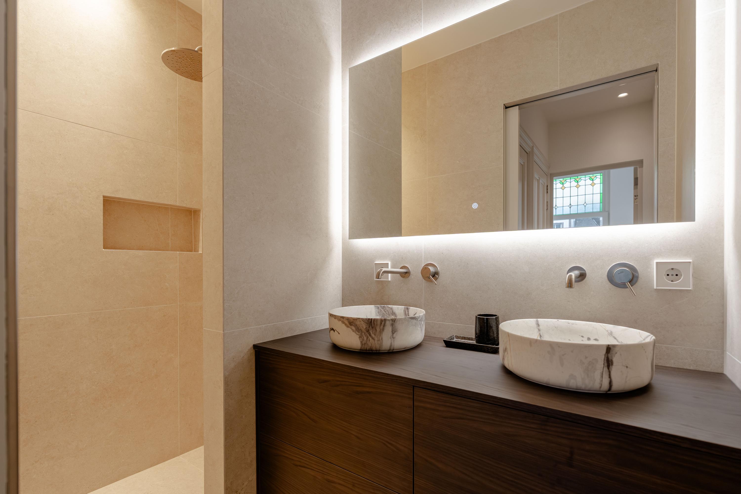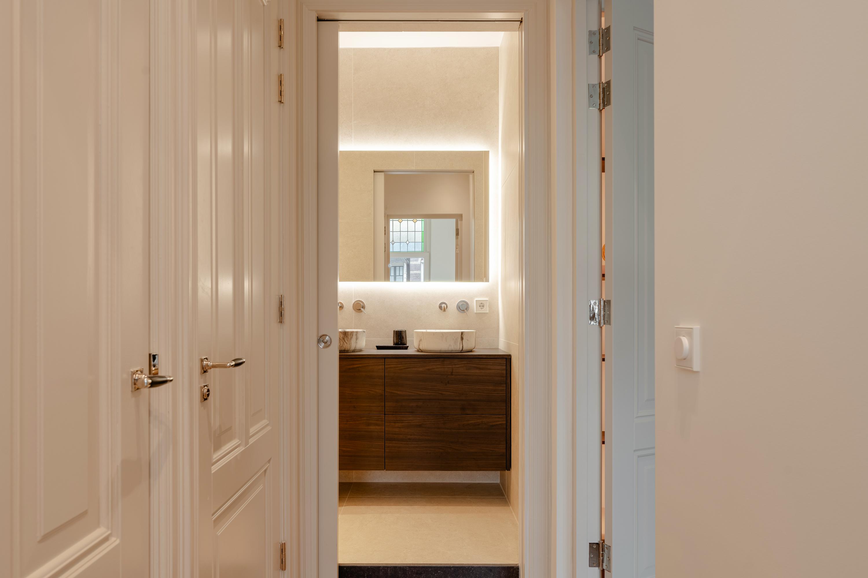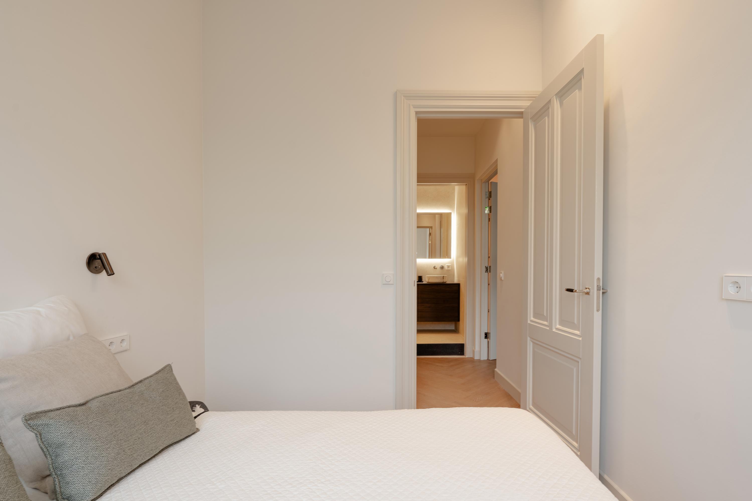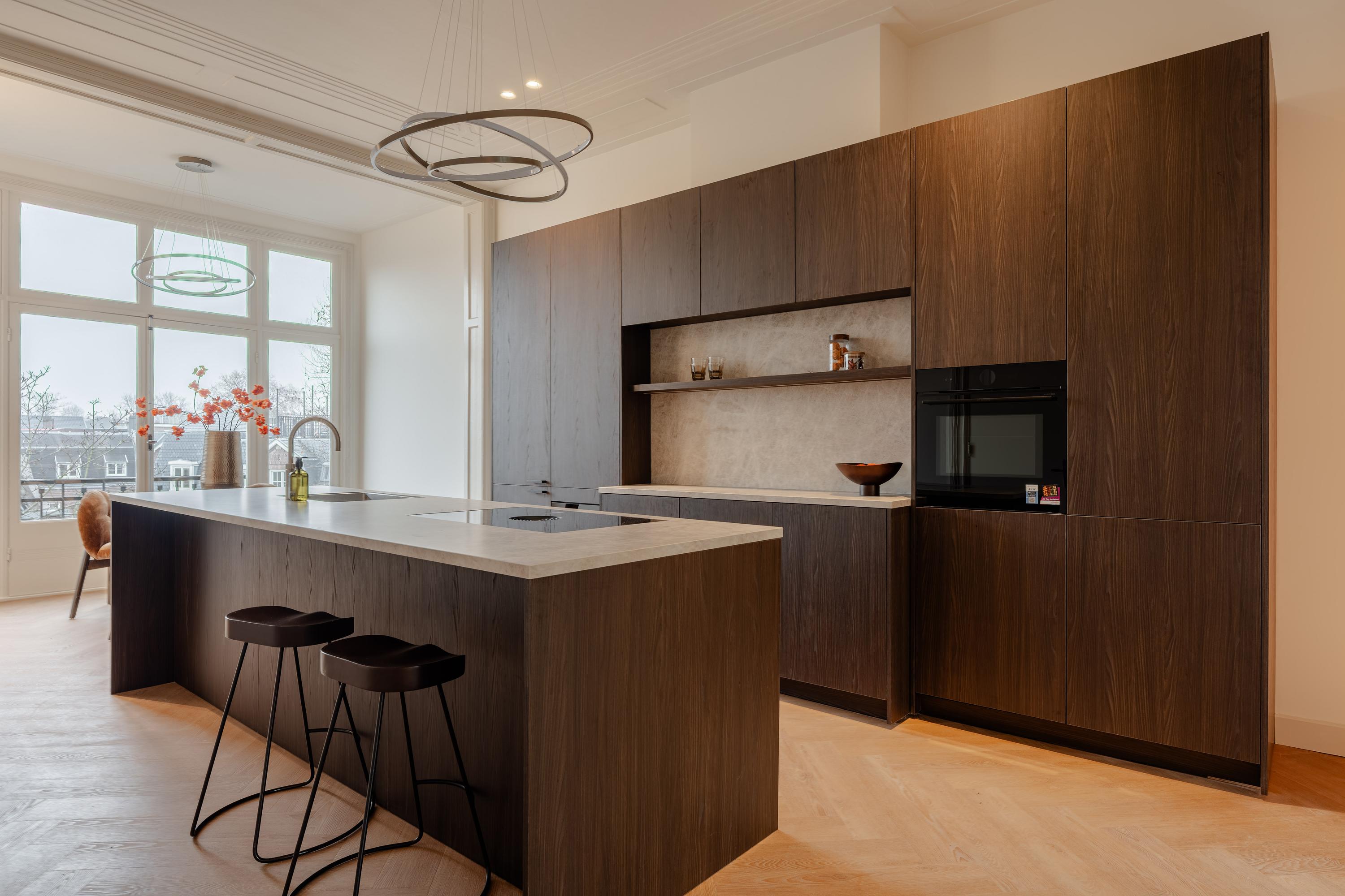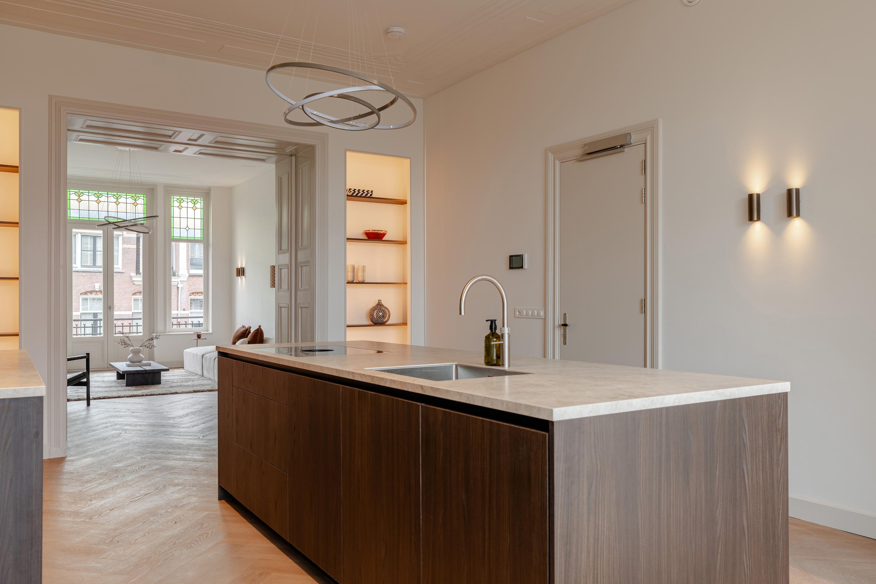 起居室层高3.28米,通往朝前的阳台,并通过优雅的推拉门与定制厨房及餐区连通。专属橱柜巧妙隐藏收纳空间,厨房岛台配备感应炉与Quooker热水龙头,成为日常起居与待客的核心。全屋均设地暖,辅以高效隔热和双层玻璃,确保物业获得A级能源标签。