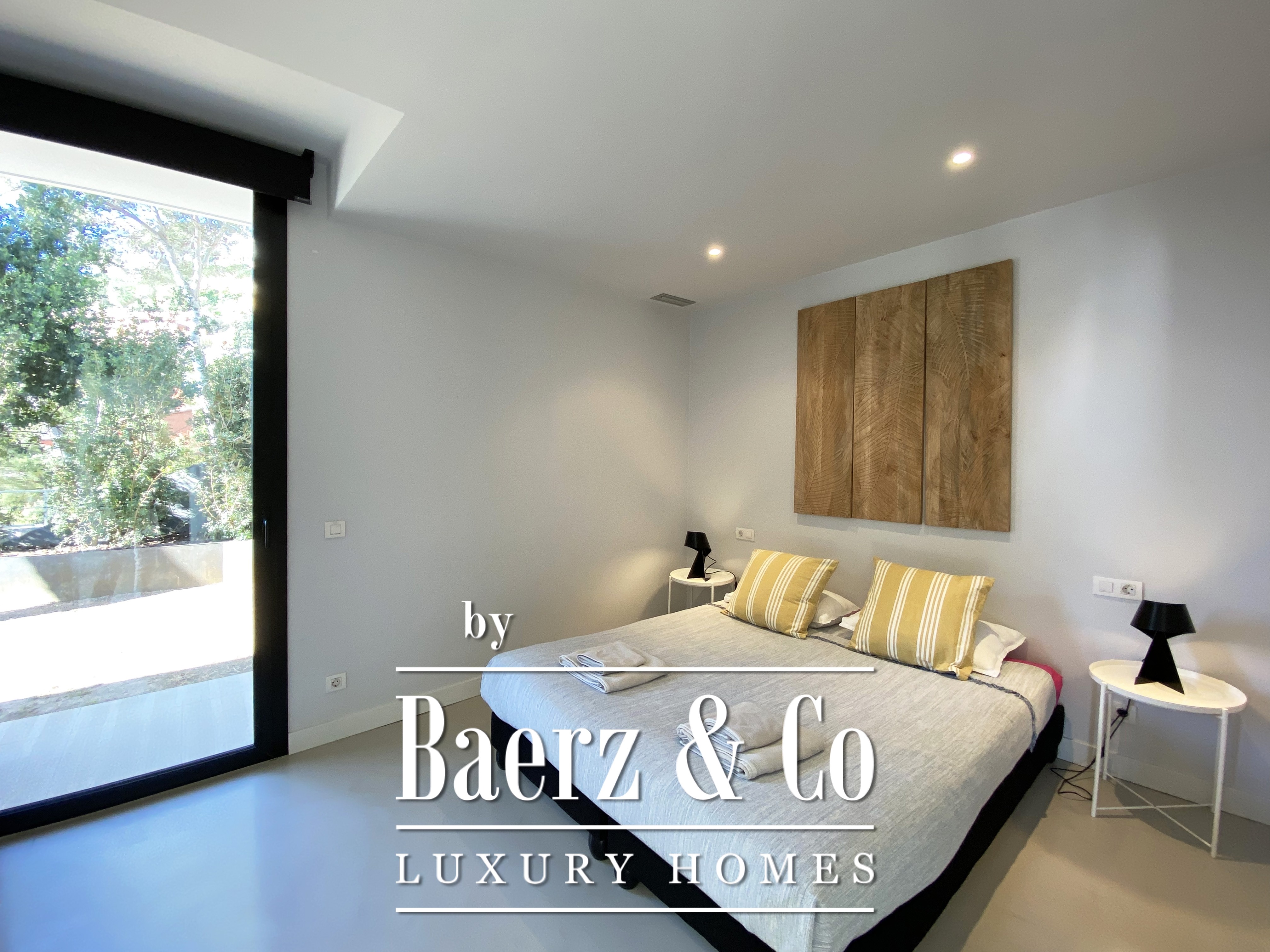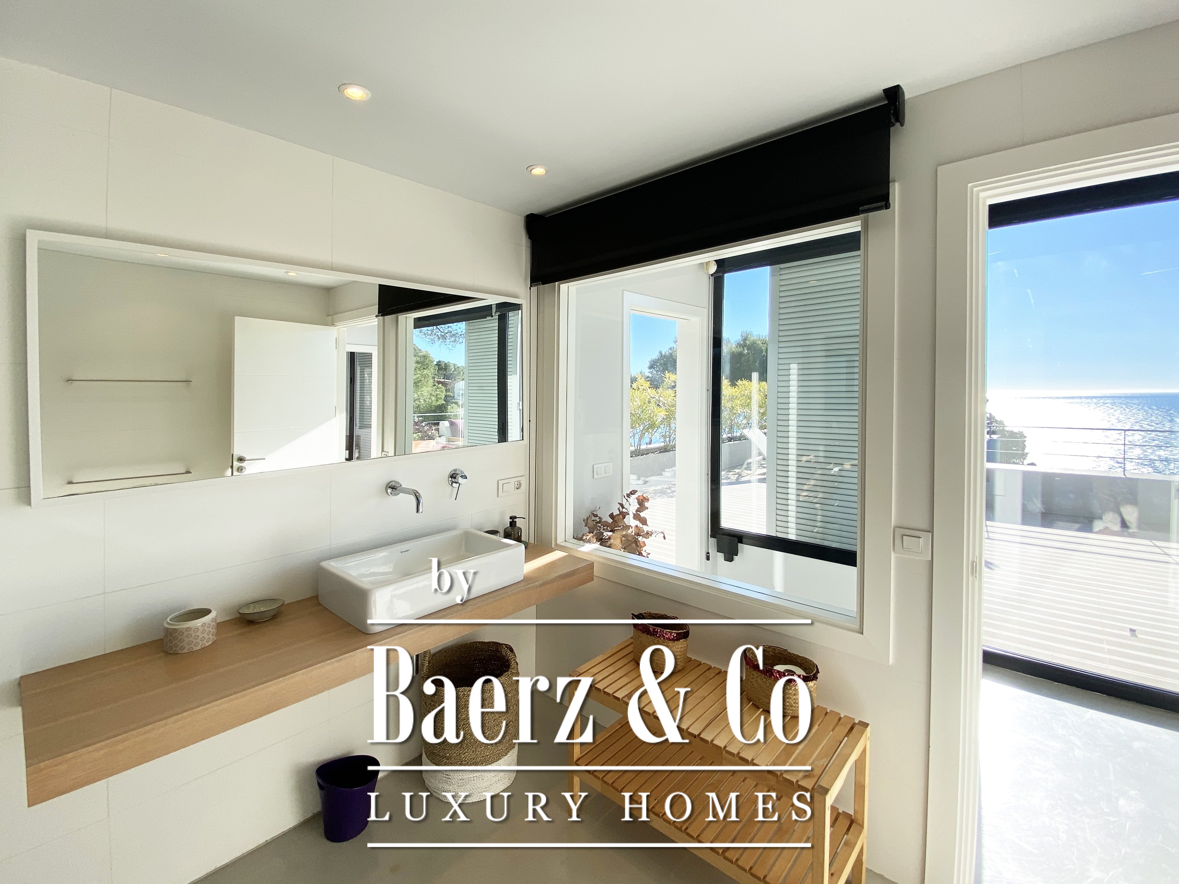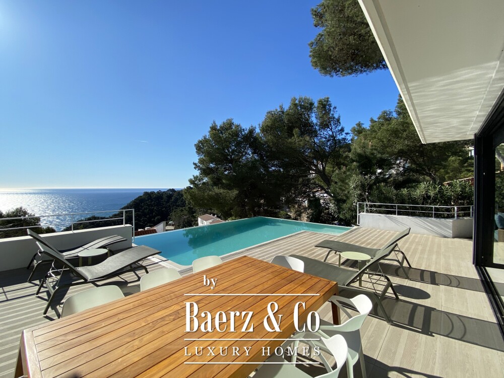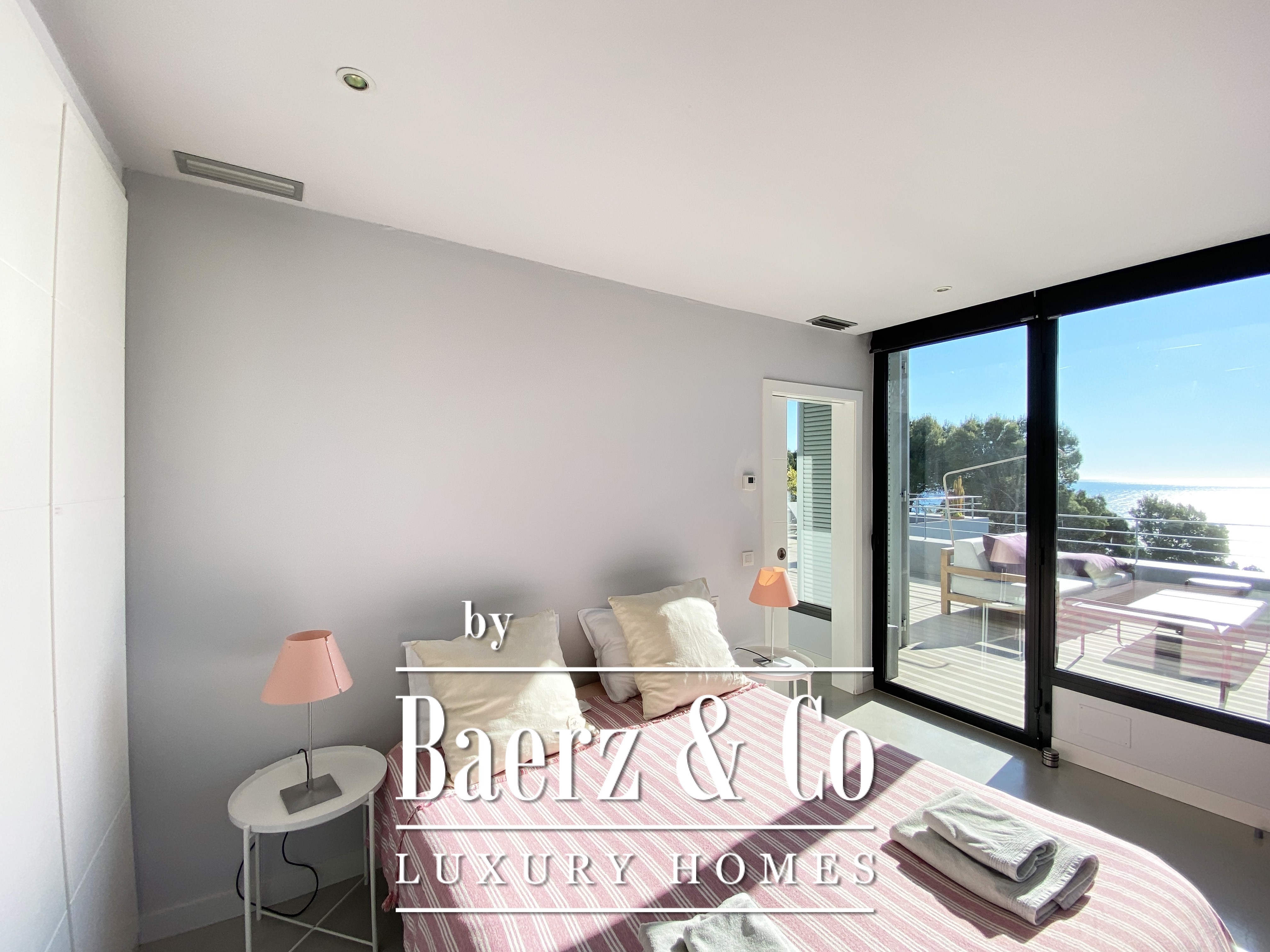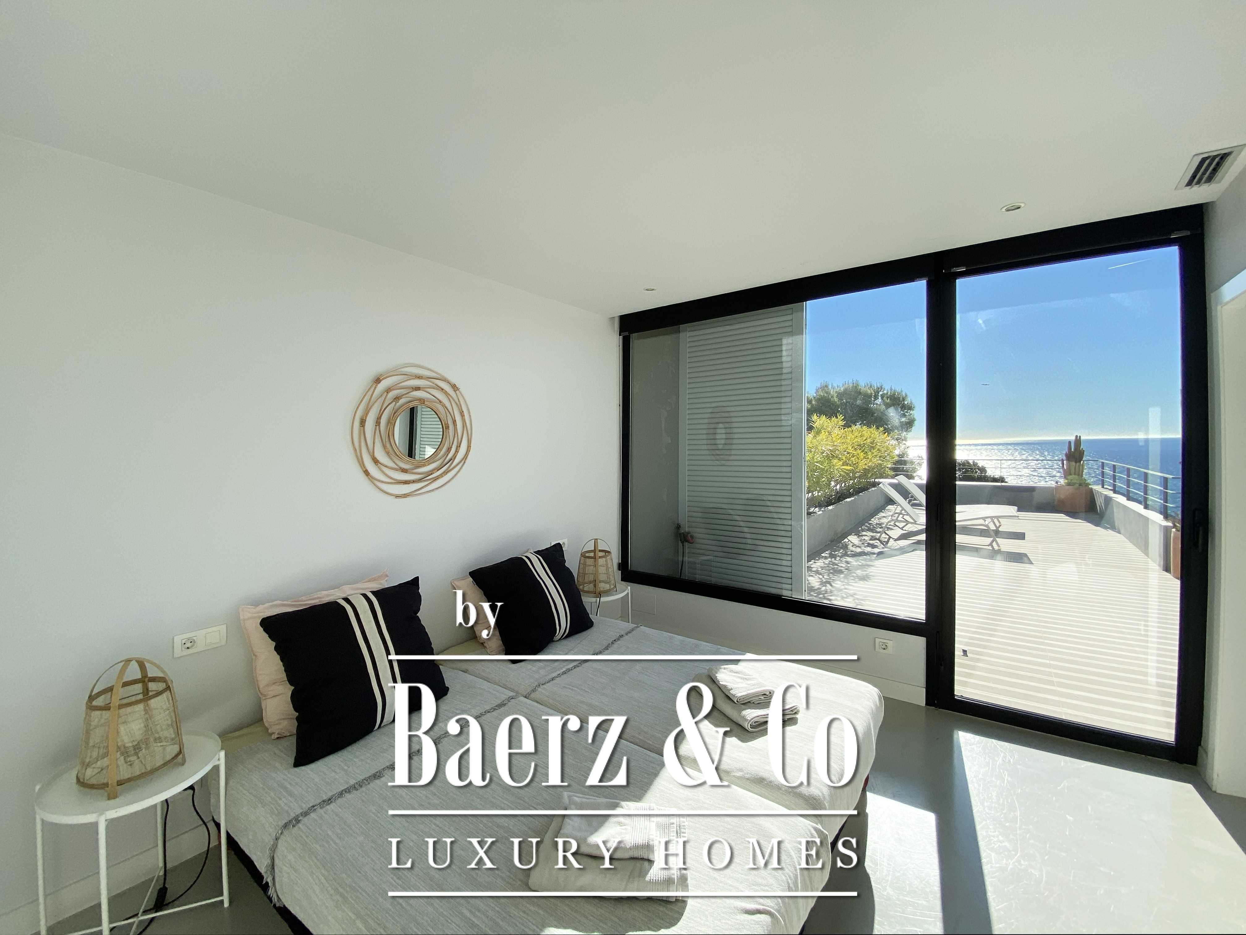 下层布局包括两间双人卧室与一间浴室,每一空间均注重舒适与和谐。楼上还有两间双人卧室共用一间浴室,并均通向 50 m² 露台,享有无敌海景。