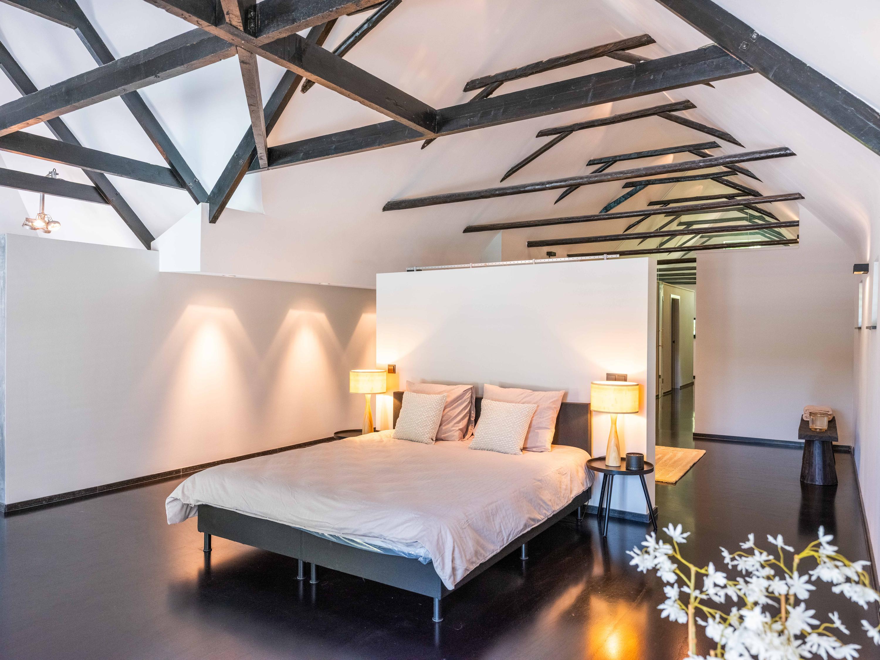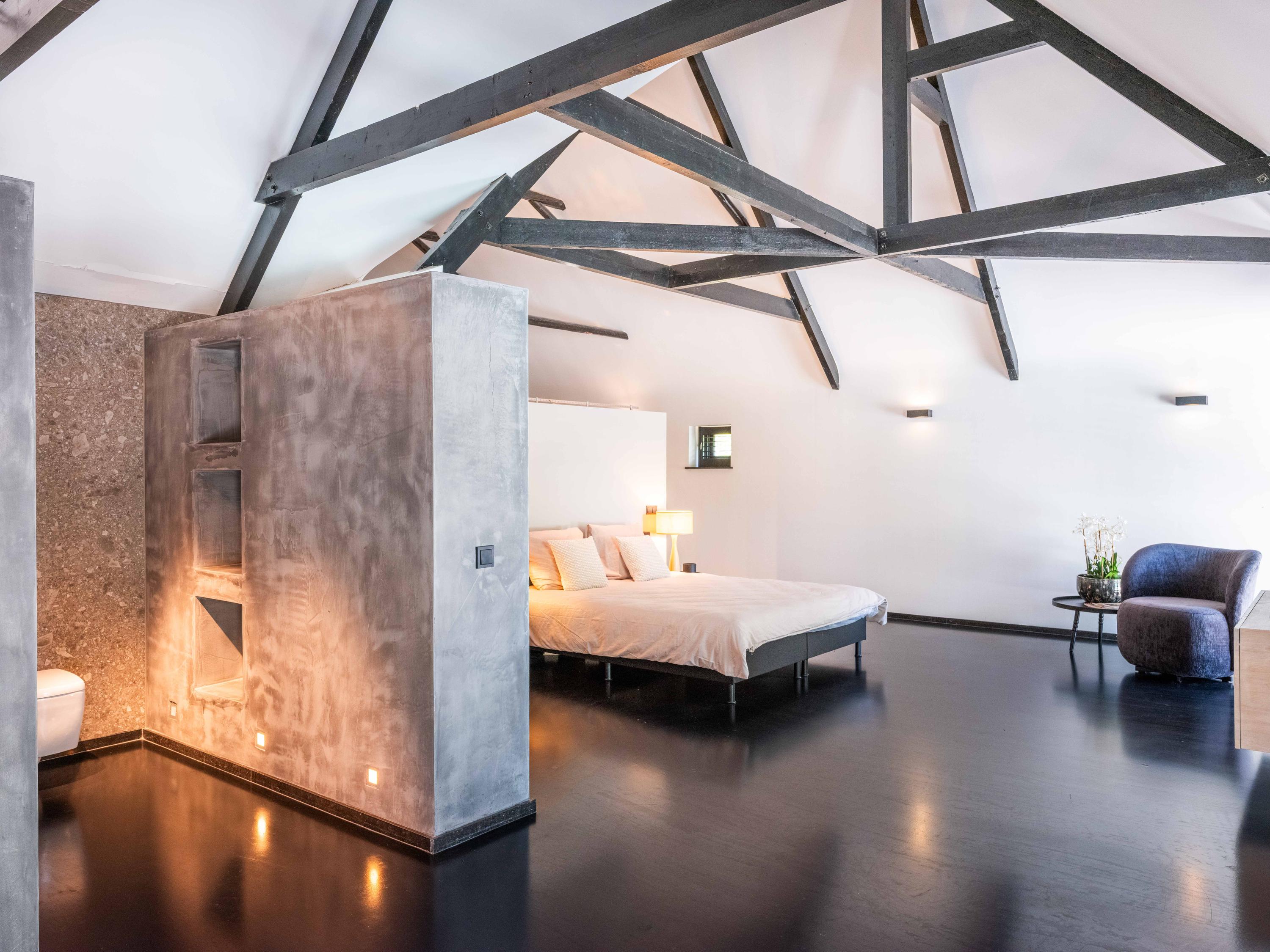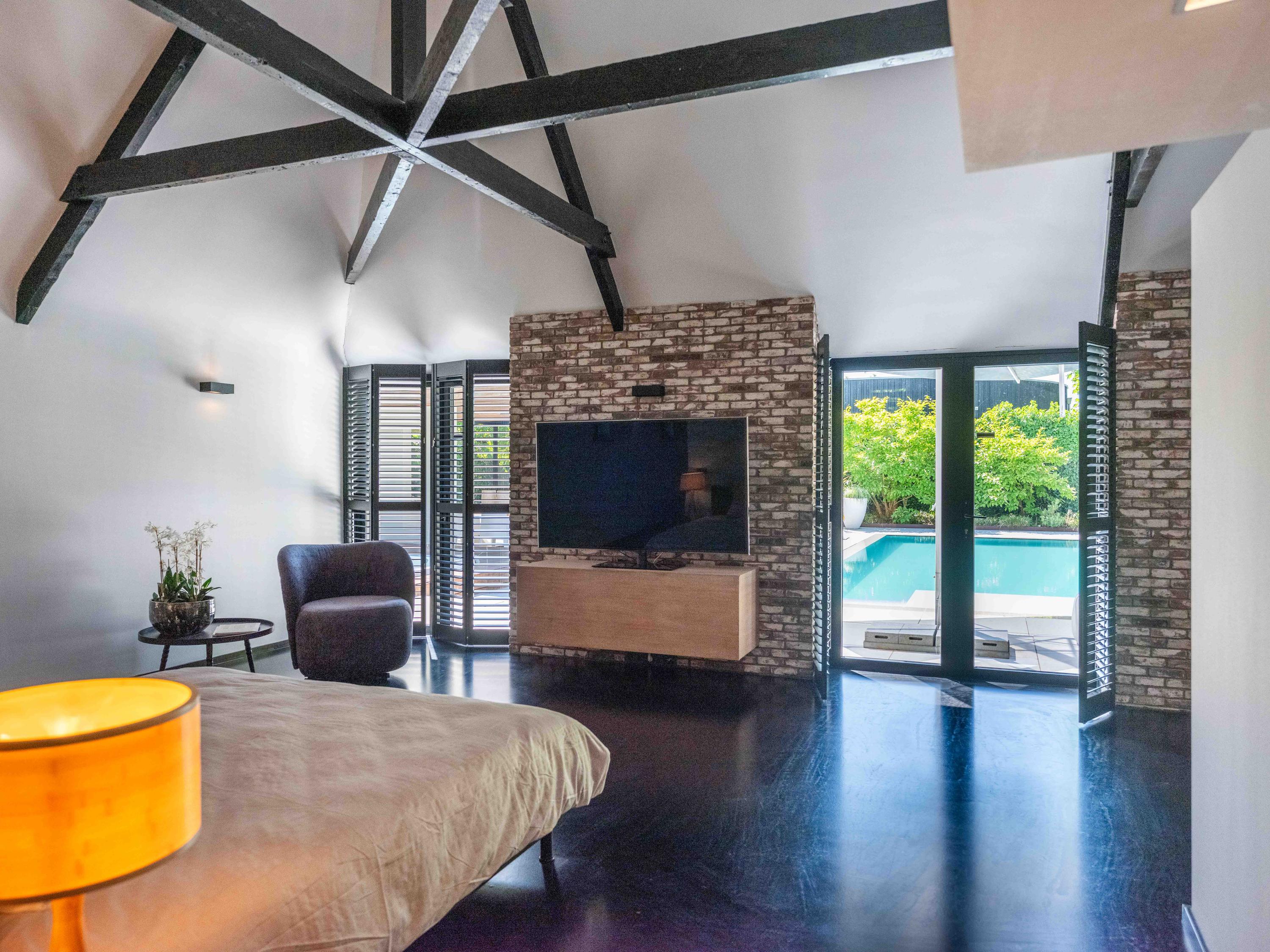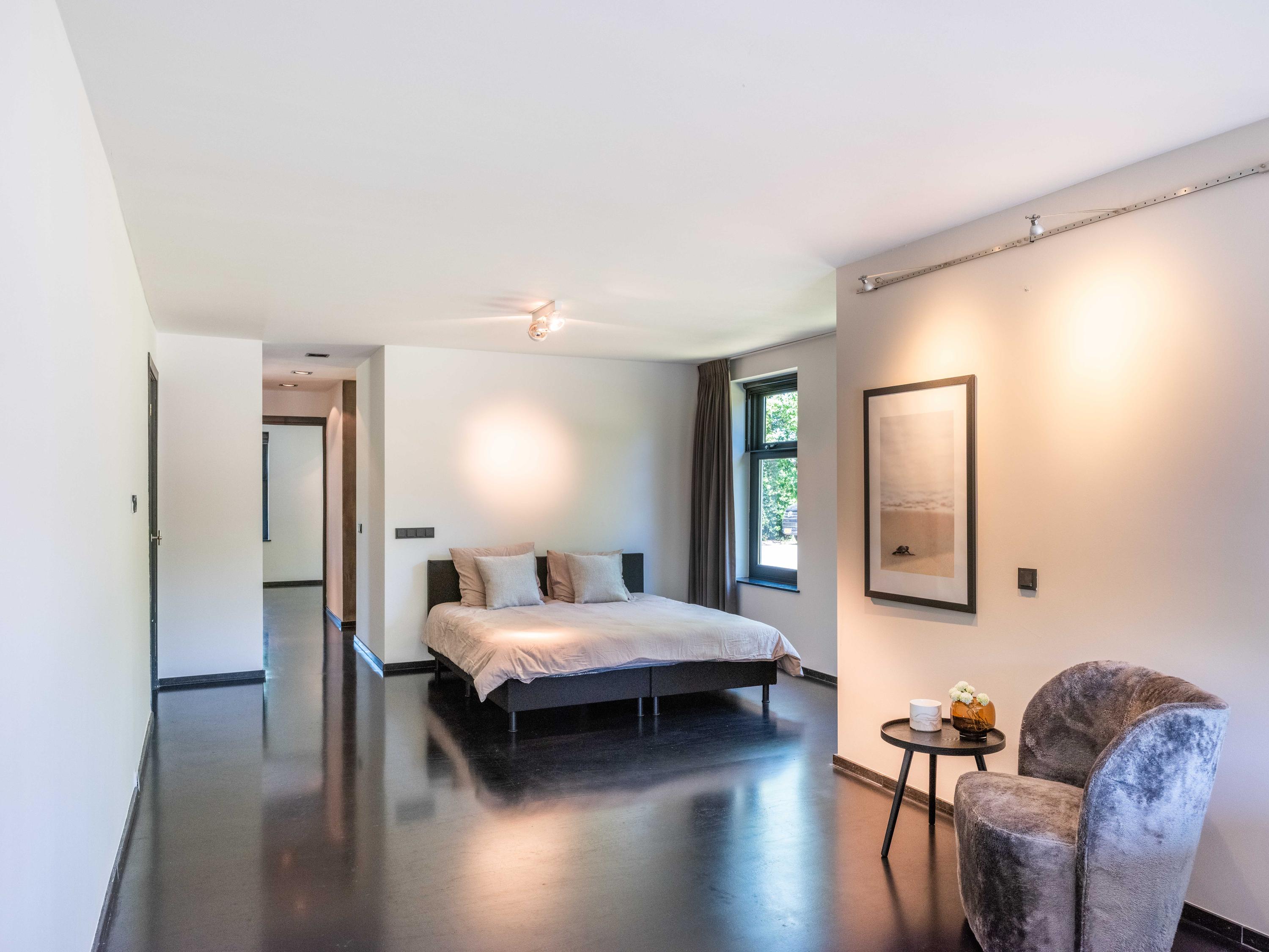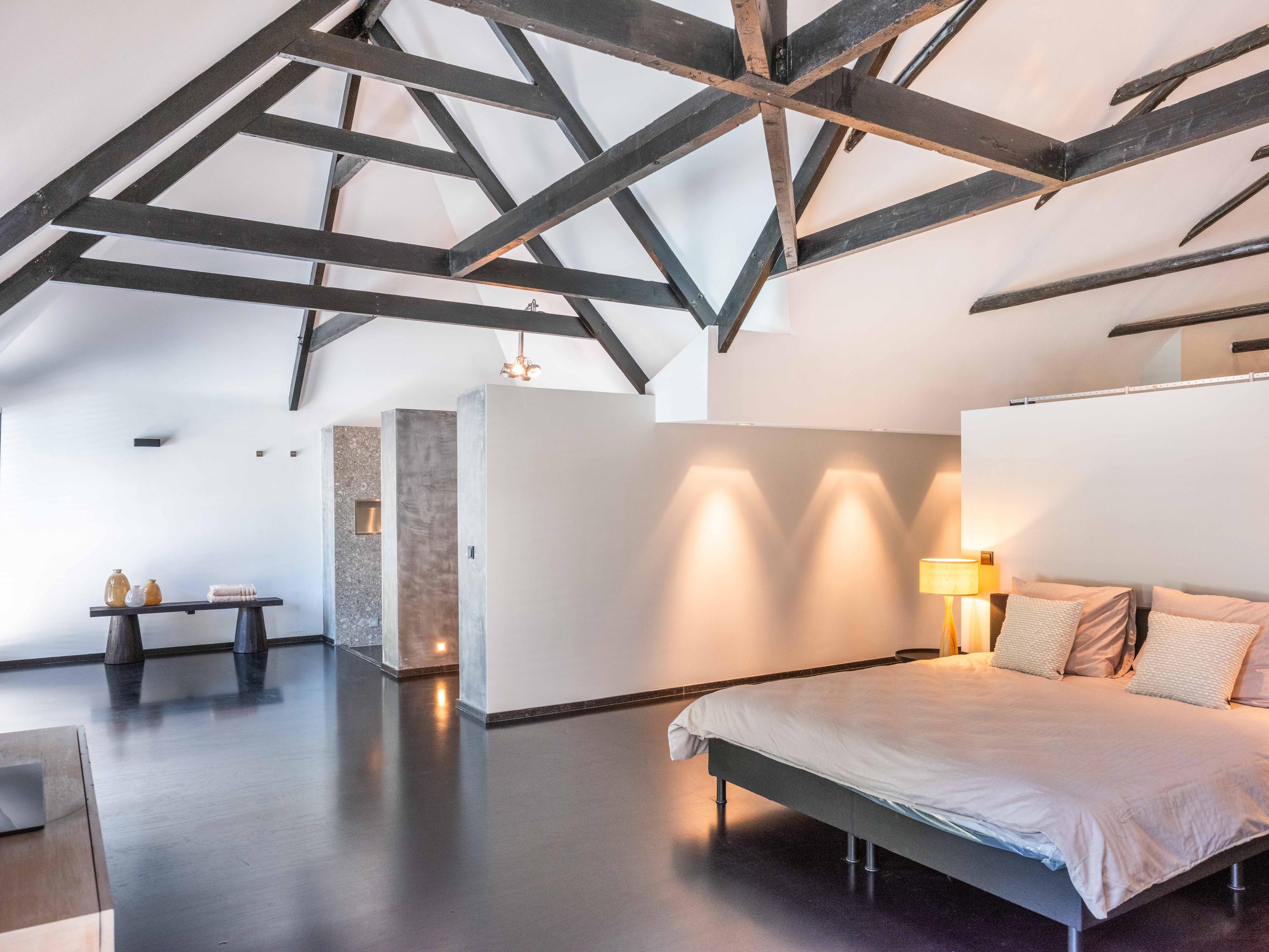 主套房拥有步入式衣帽间和开放式浴室,可饱览泳池景致,进一步提升宁静感。阁楼上方还具备额外办公或静谧空间的潜力。全宅配有地暖、热泵以及A级能效隔热(屋顶、墙体、地面与高效玻璃),确保全年舒适宜居。