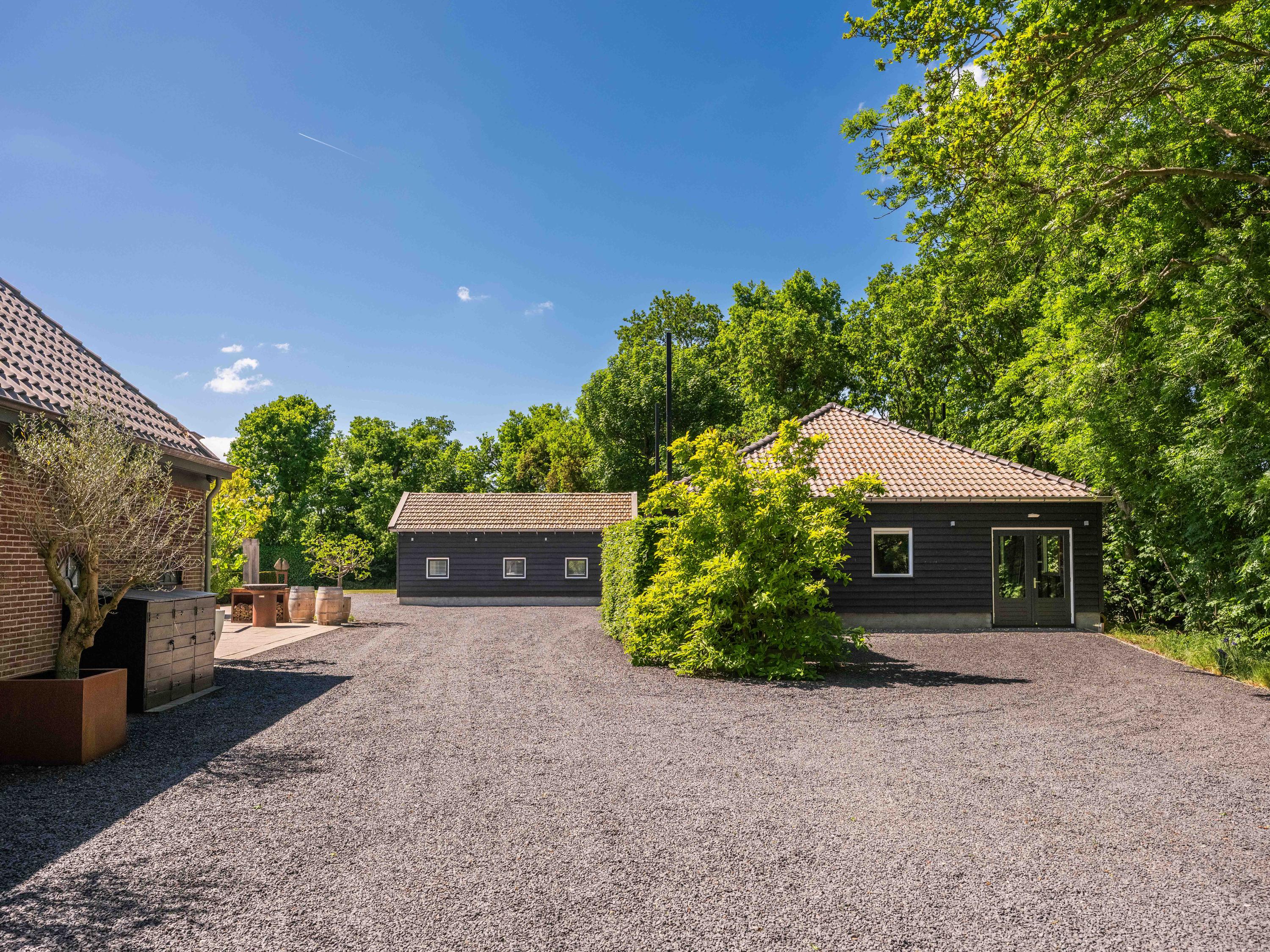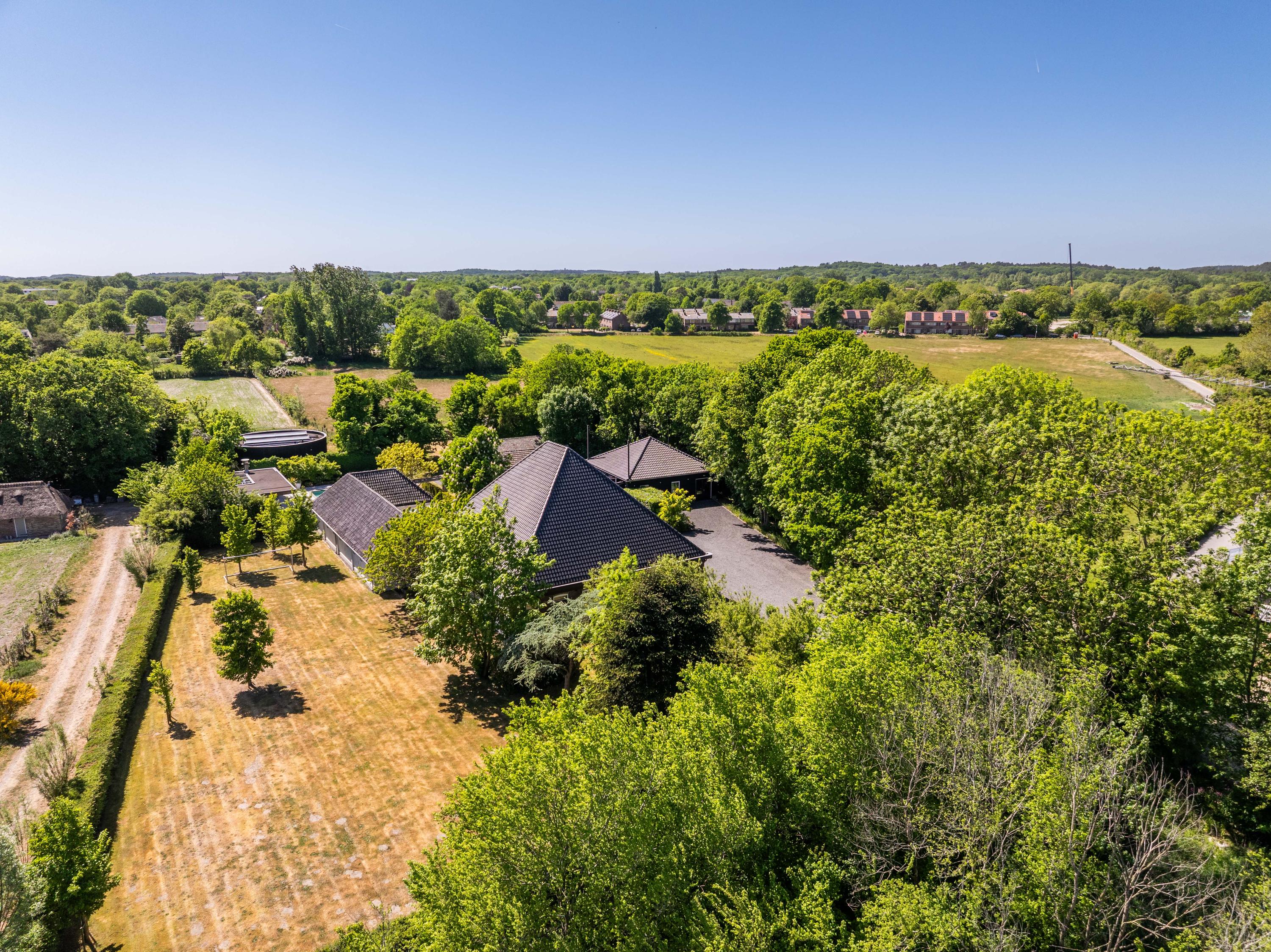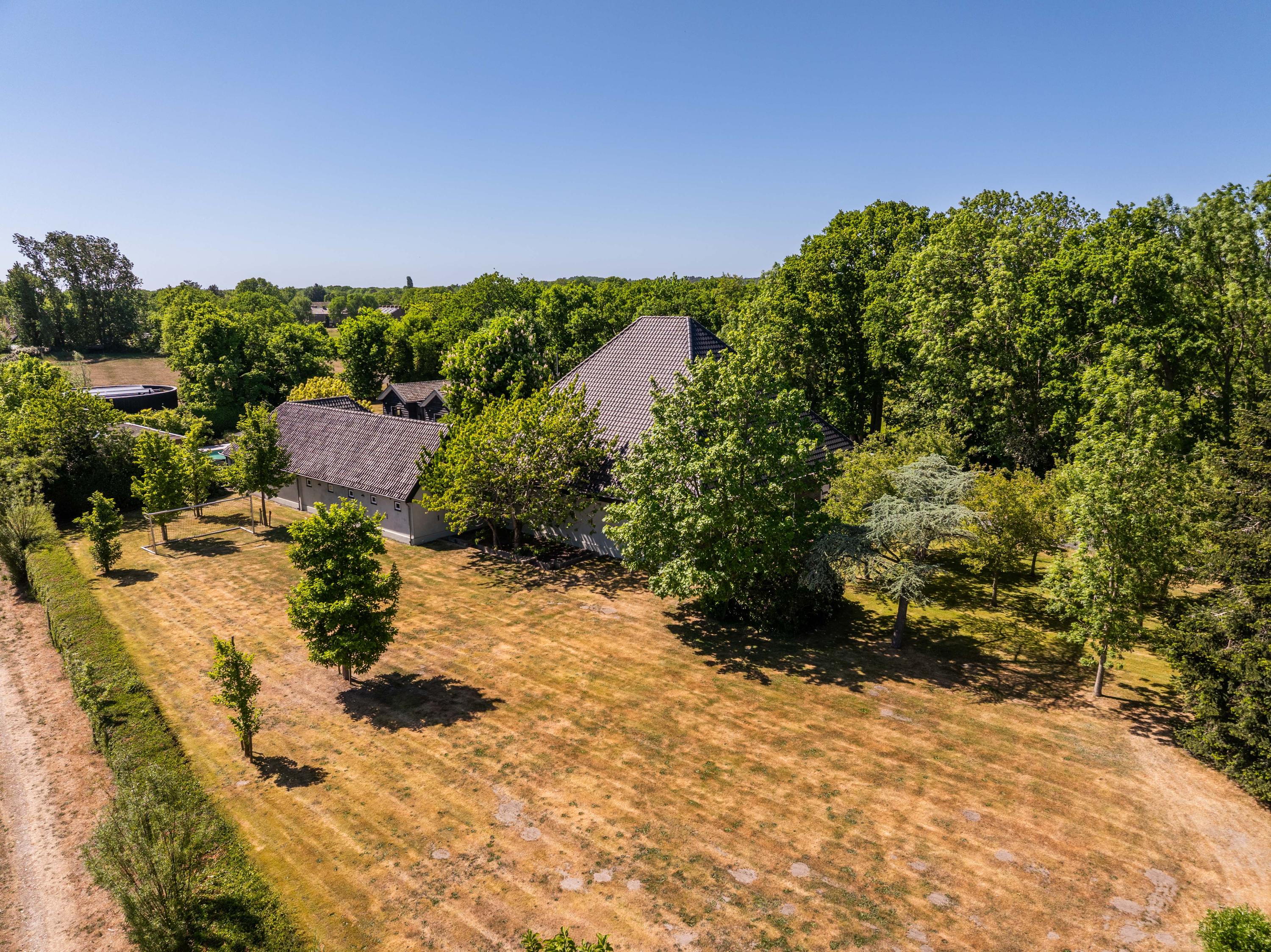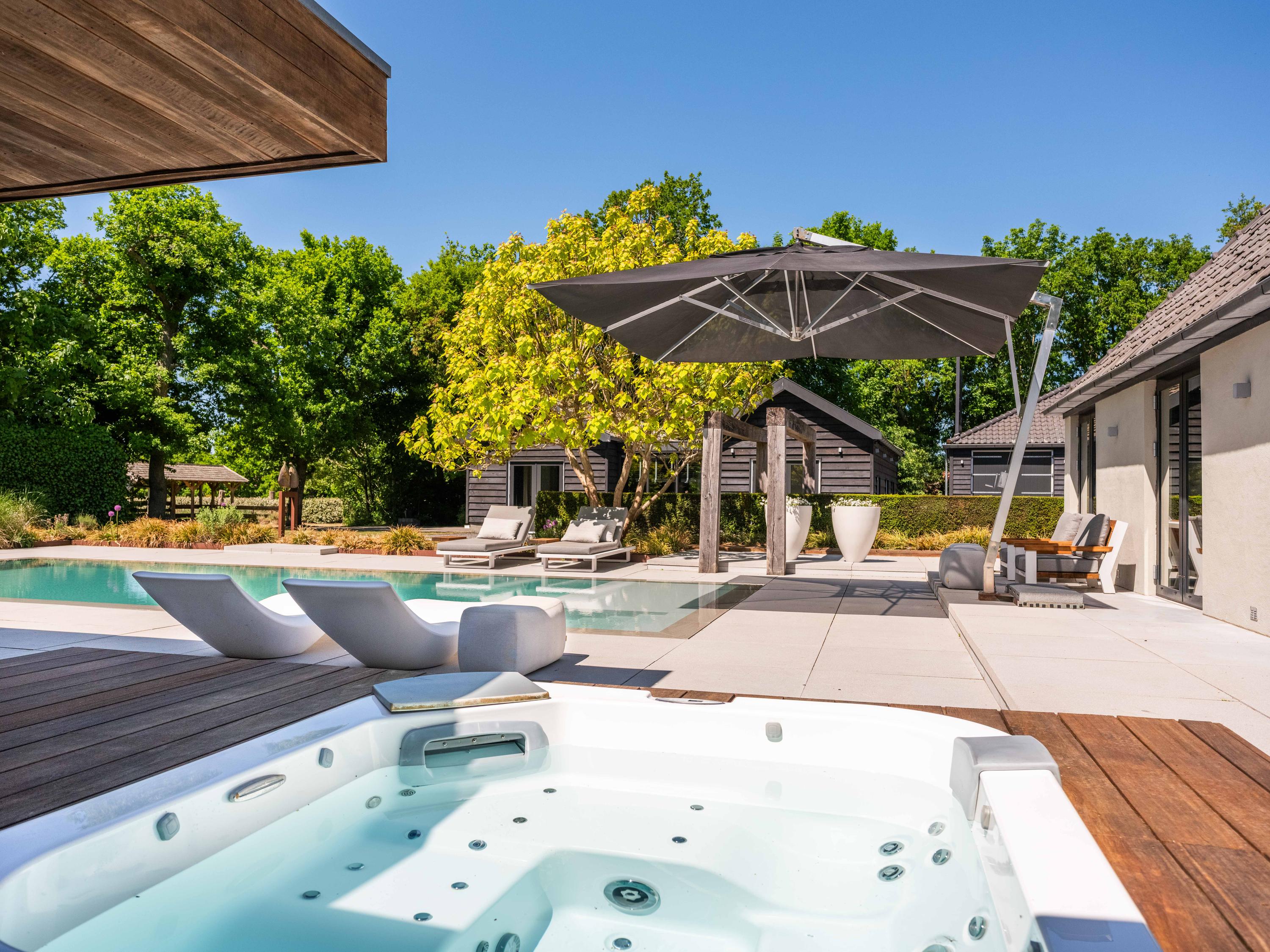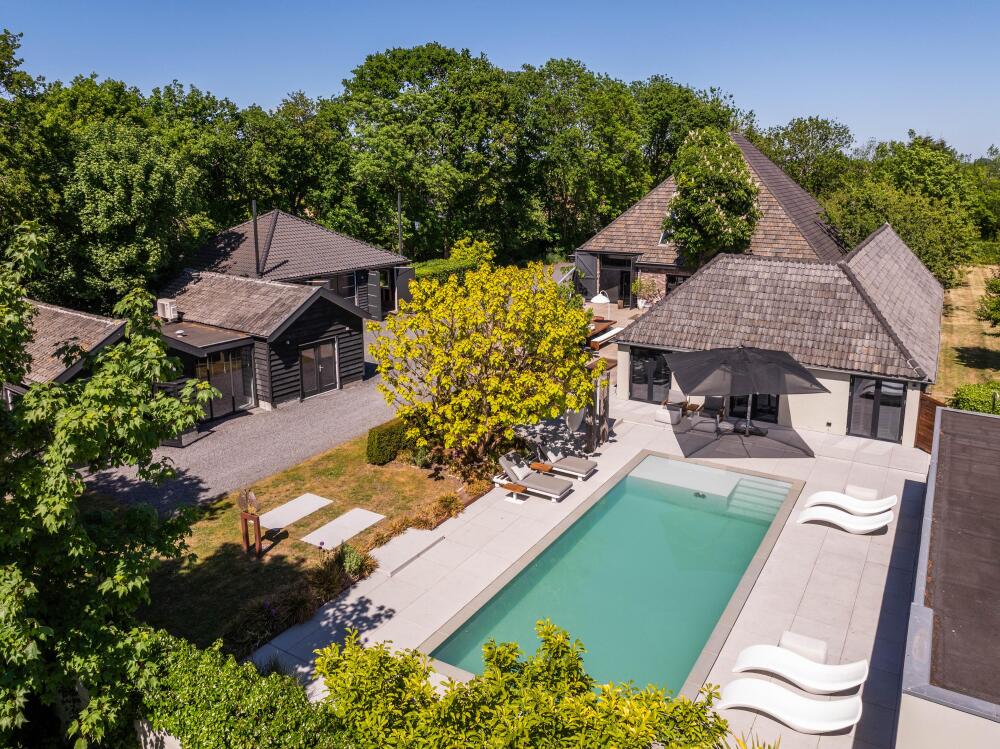 附属建筑包括一个多功能小屋(适合作为办公室、工作坊或看护住宿)、一座三车库并带储藏空间,后方草地上还有一间遮蔽马厩——非常适合马术爱好者或收藏家。花园内设有游泳池、按摩浴缸、桑拿、蒸汽房以及宽敞的休息区,营造私密养生时刻。