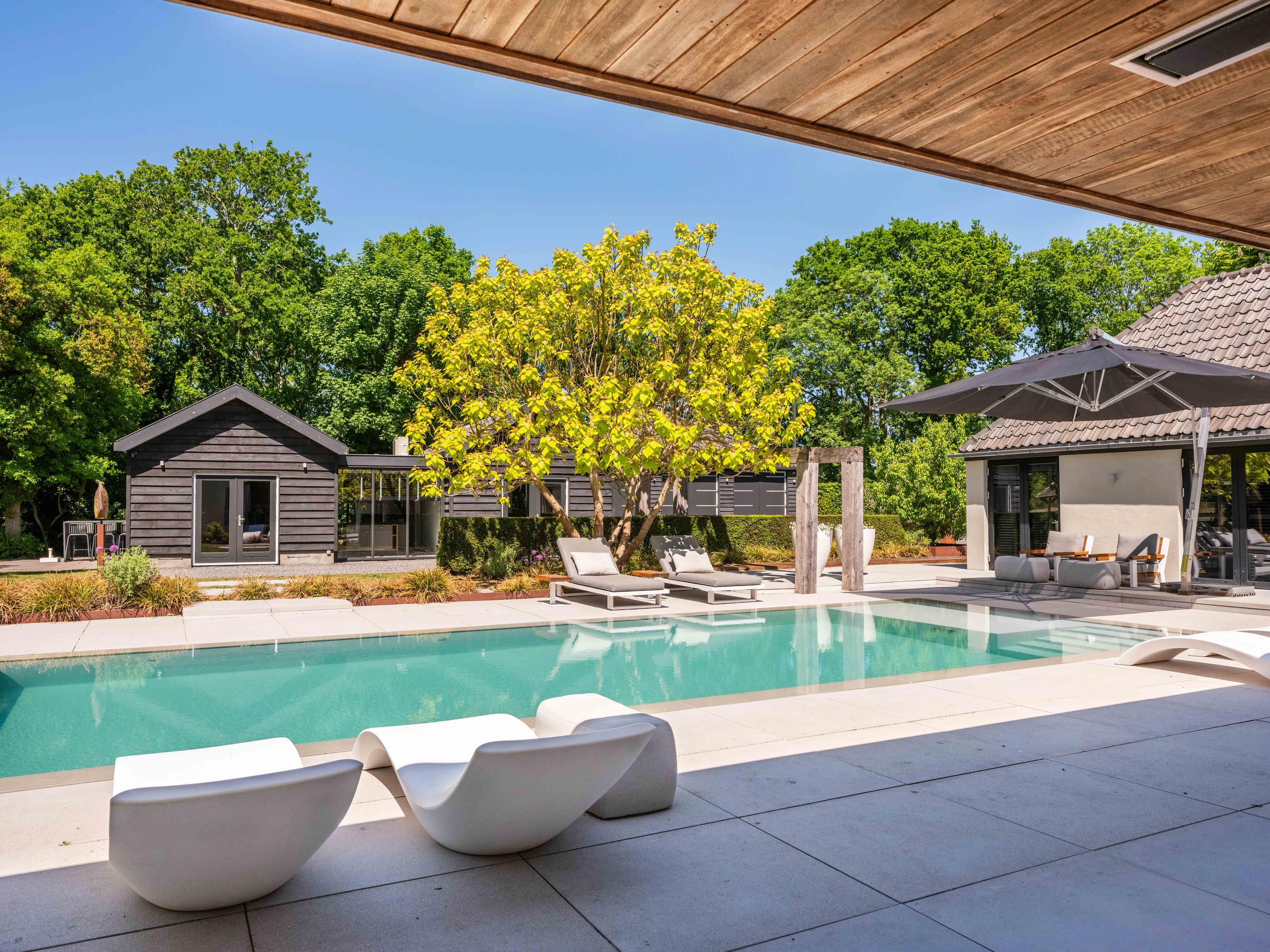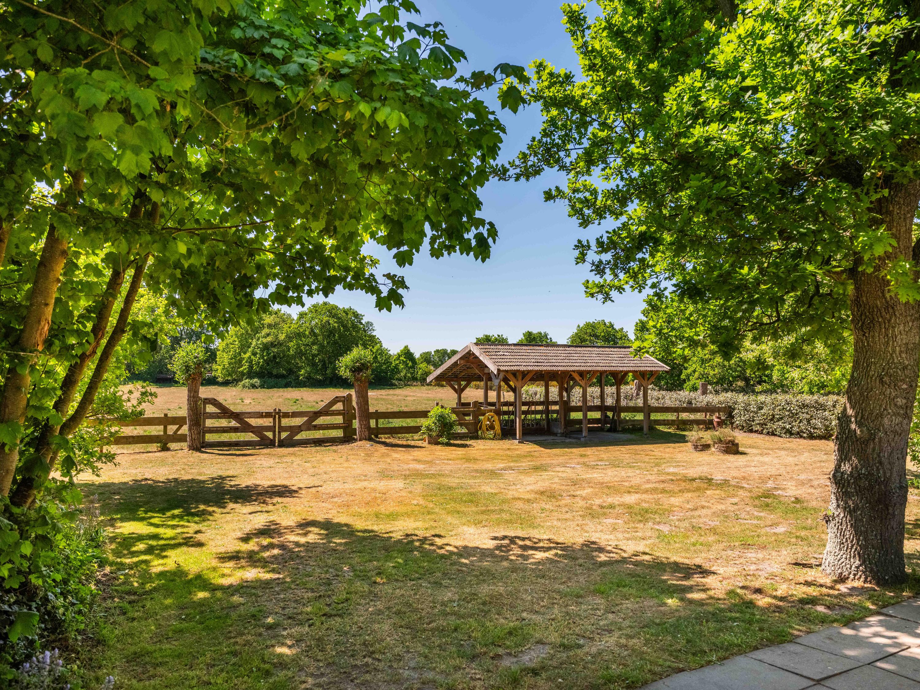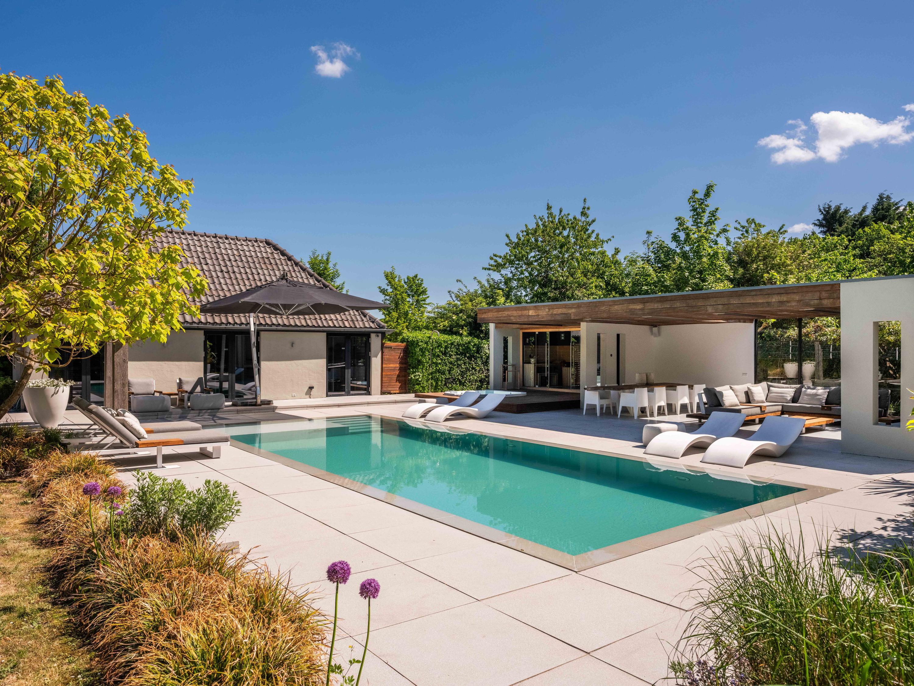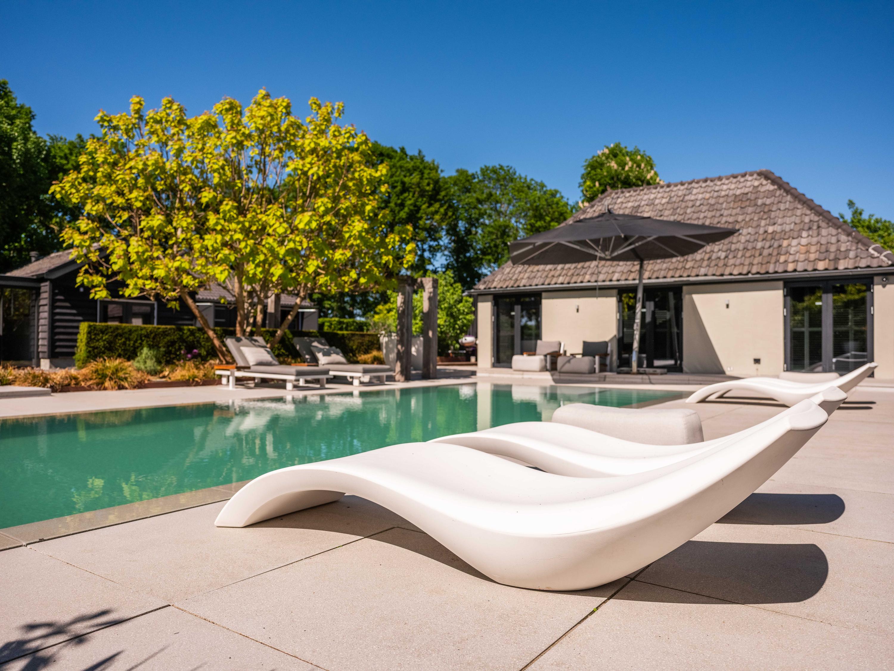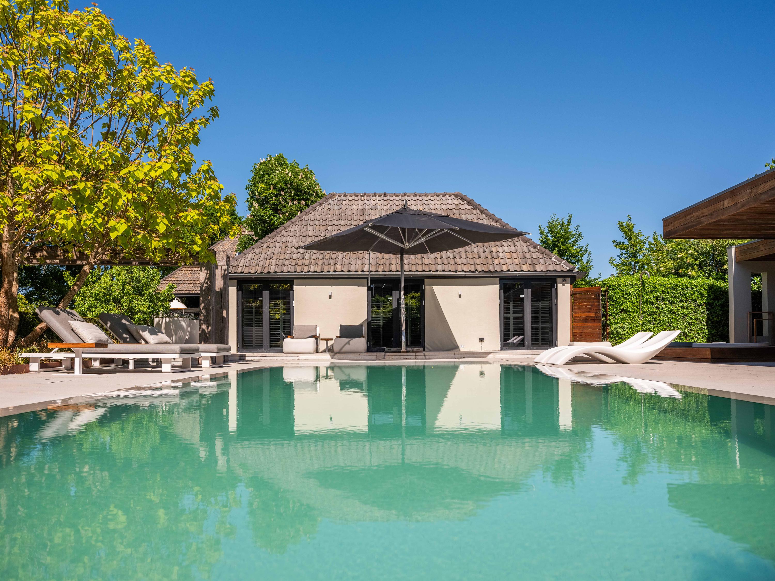 附属建筑包括一个多功能小屋(适合作为办公室、工作坊或看护住宿)、一座三车库并带储藏空间,后方草地上还有一间遮蔽马厩——非常适合马术爱好者或收藏家。花园内设有游泳池、按摩浴缸、桑拿、蒸汽房以及宽敞的休息区,营造私密养生时刻。