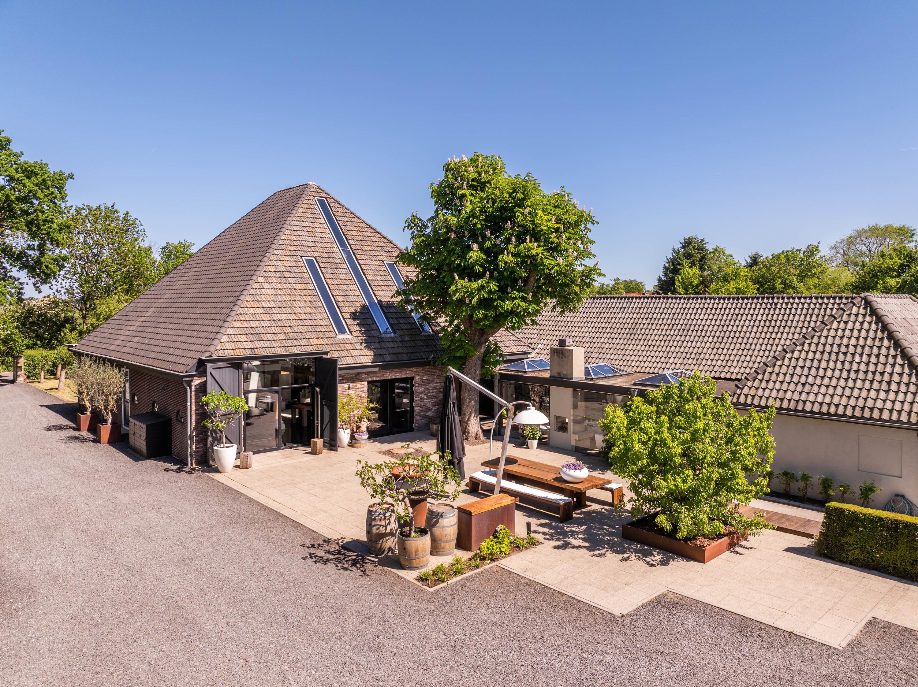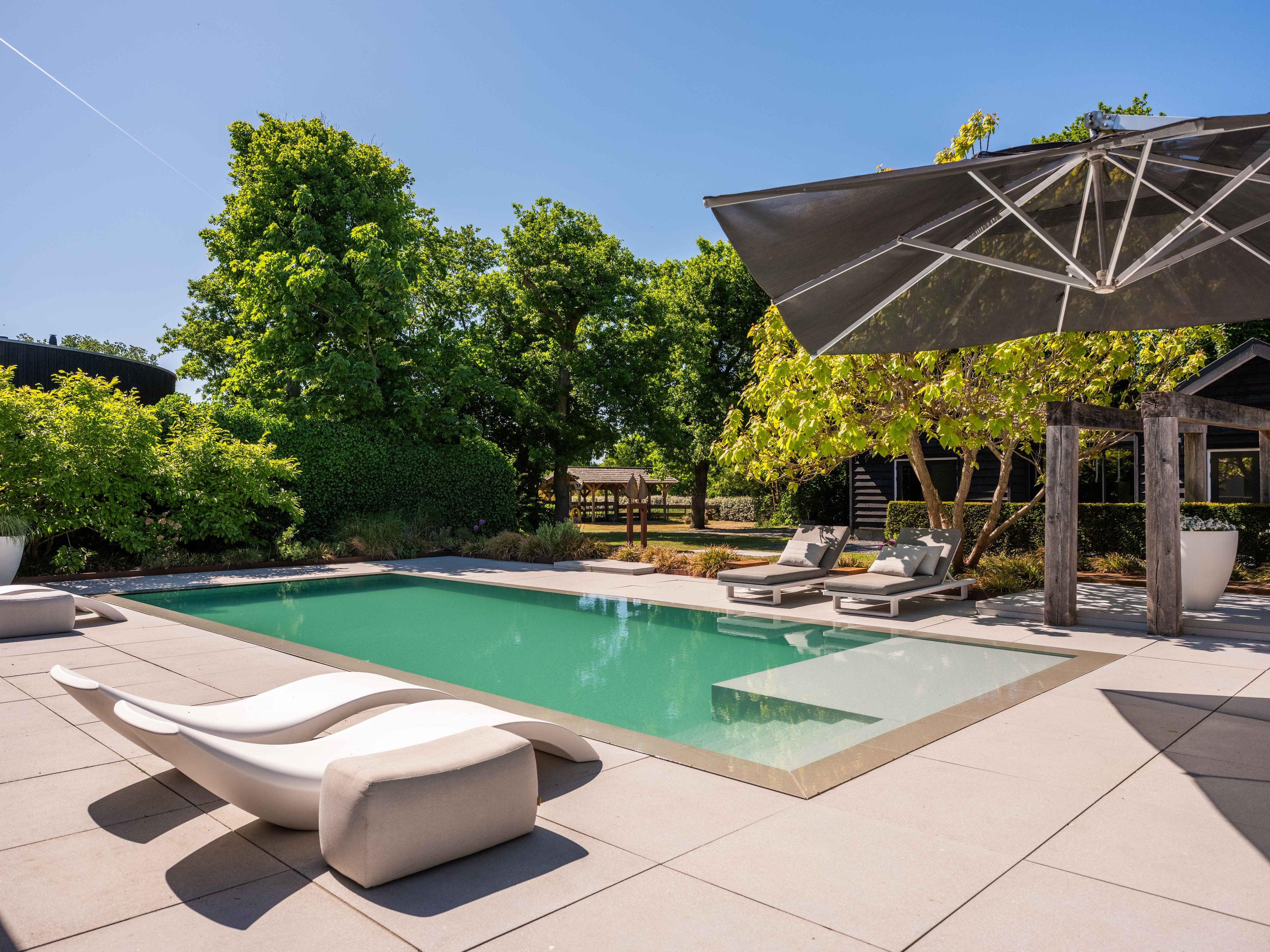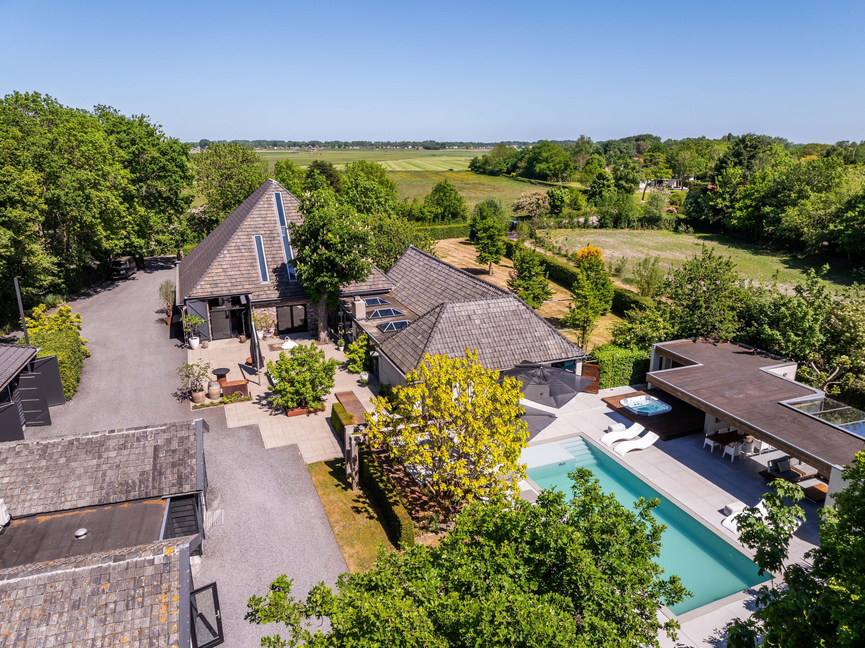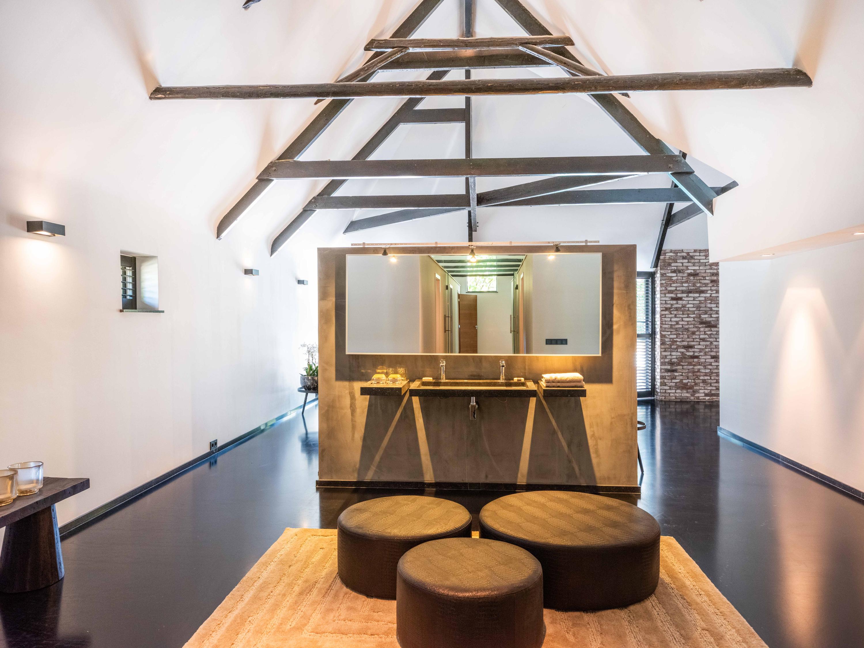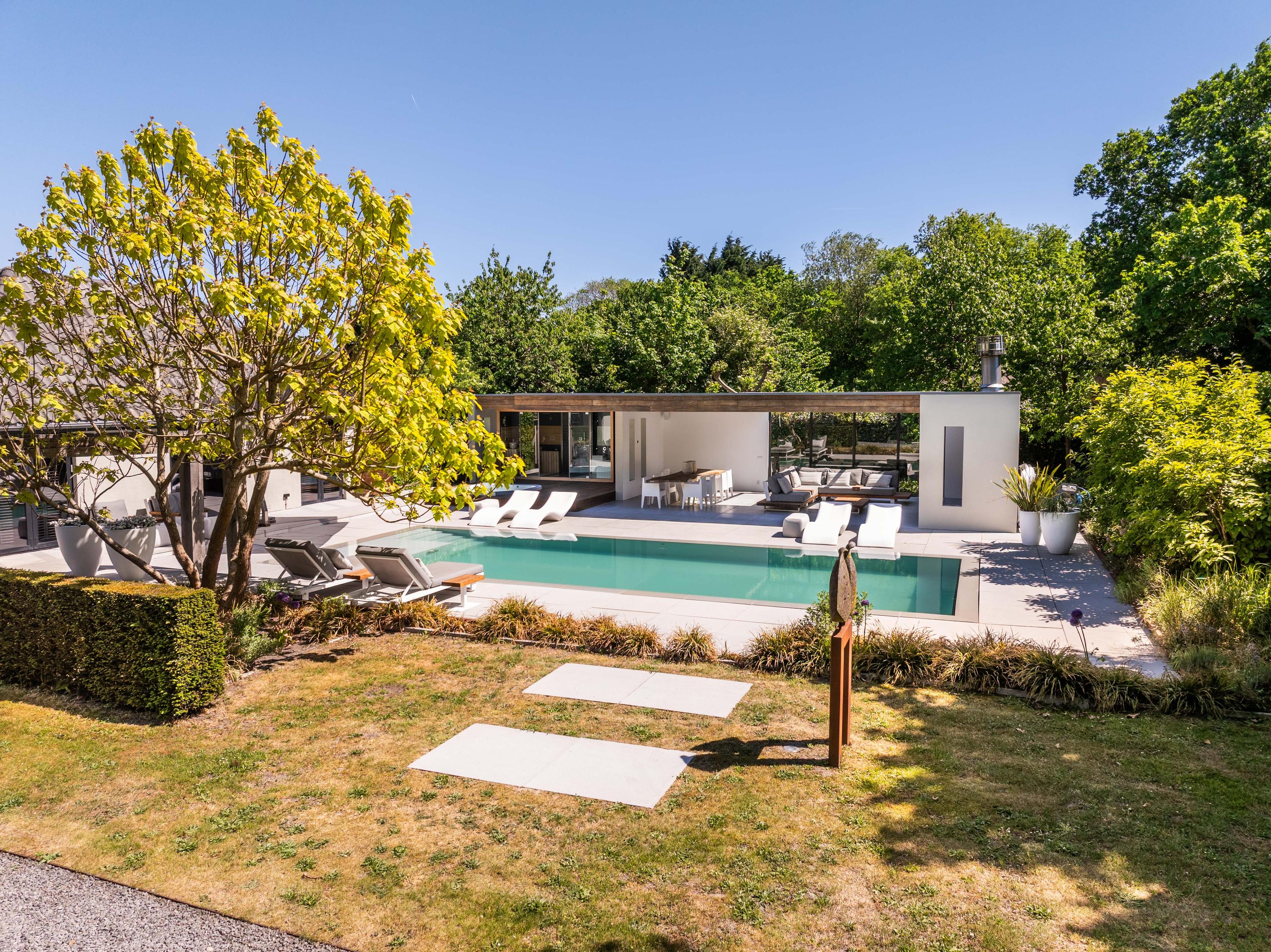 附属建筑包括一个多功能小屋(适合作为办公室、工作坊或看护住宿)、一座三车库并带储藏空间,后方草地上还有一间遮蔽马厩——非常适合马术爱好者或收藏家。花园内设有游泳池、按摩浴缸、桑拿、蒸汽房以及宽敞的休息区,营造私密养生时刻。