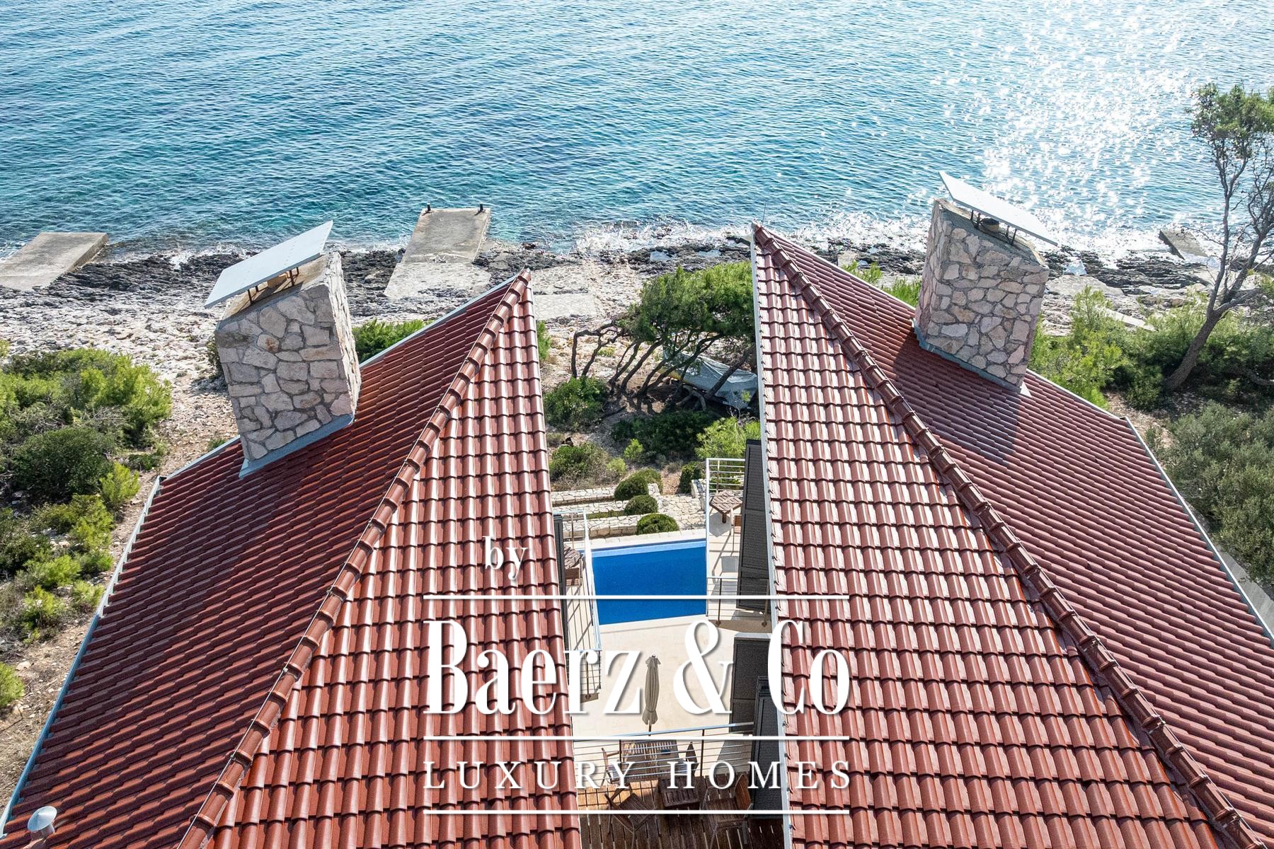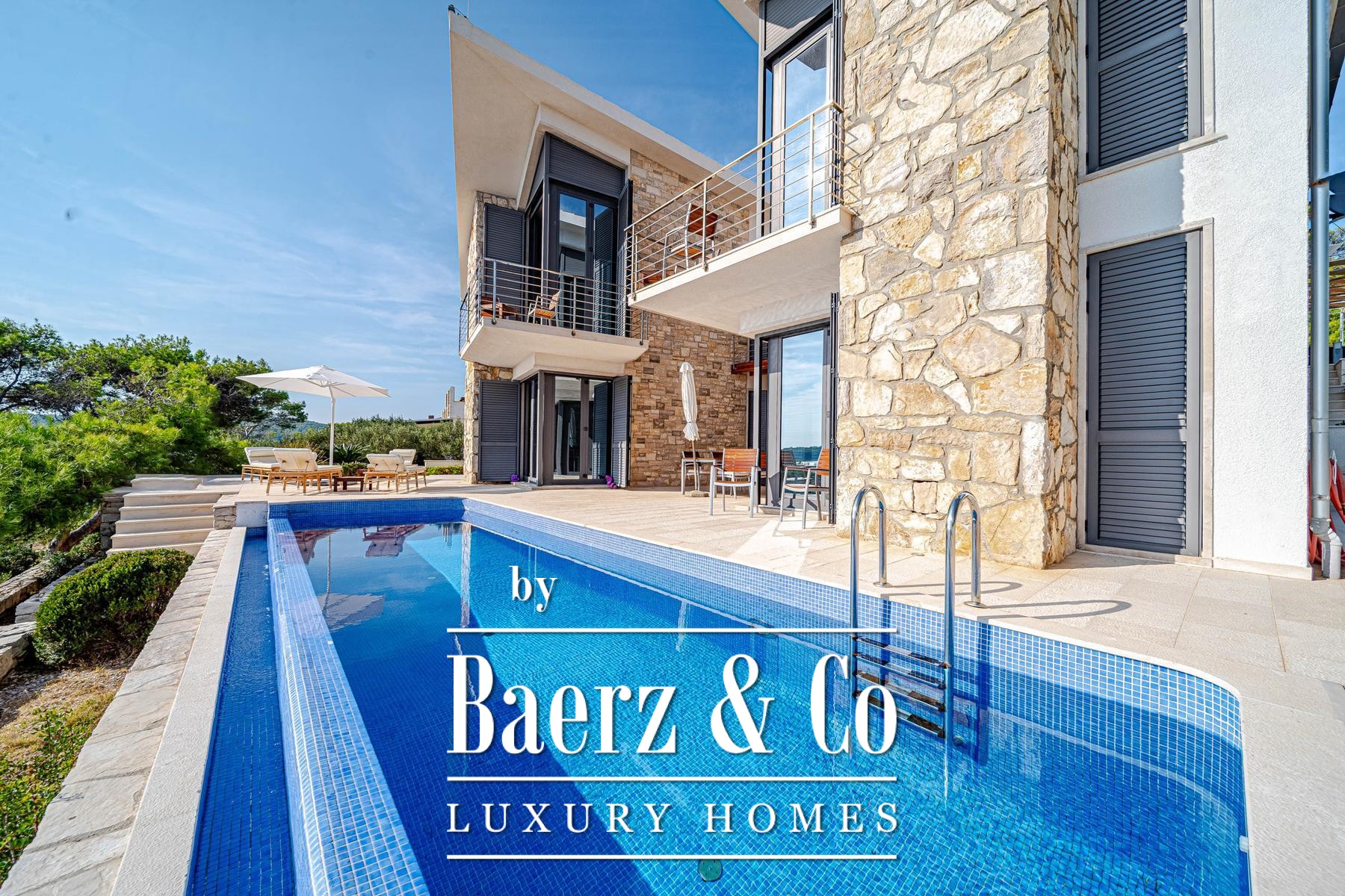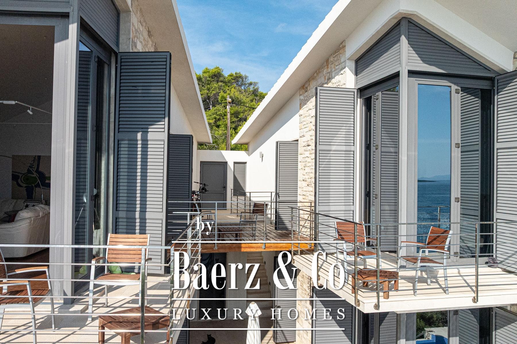 Blato别墅坐落于克罗地亚海岸第一线,占地500平方米,室内面积达260平方米。建筑线条明朗,主体由两座独立单元组成,通过宽敞的露台相连,每套单元都是完整私密的居所。两套单元主层均为开放式客厅、餐厅与厨房组合,上层各设有两间配套卫浴的卧室及专属露台。
