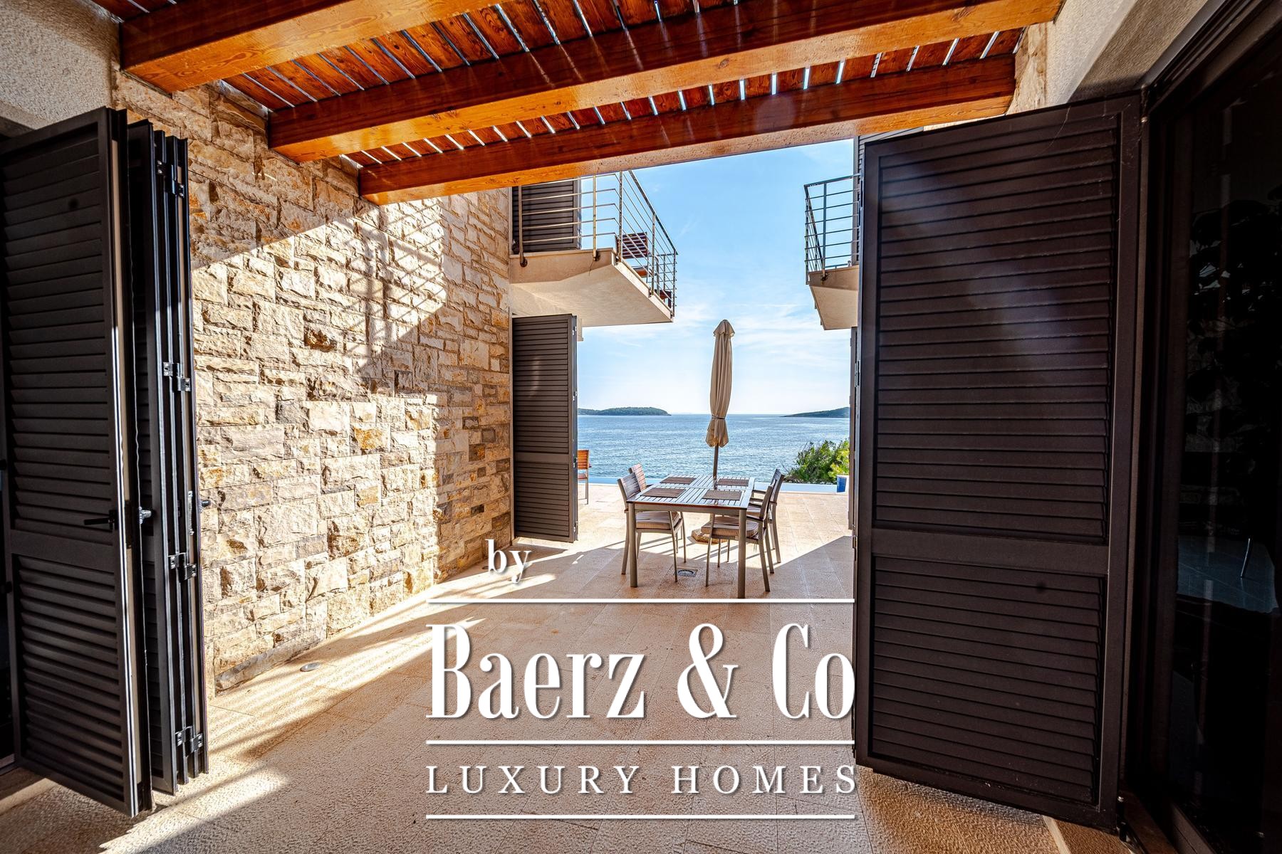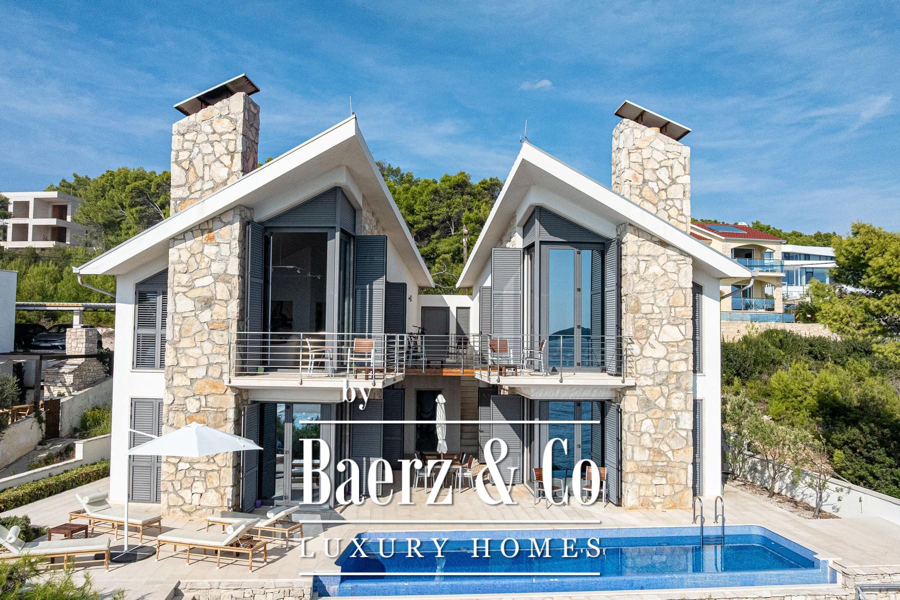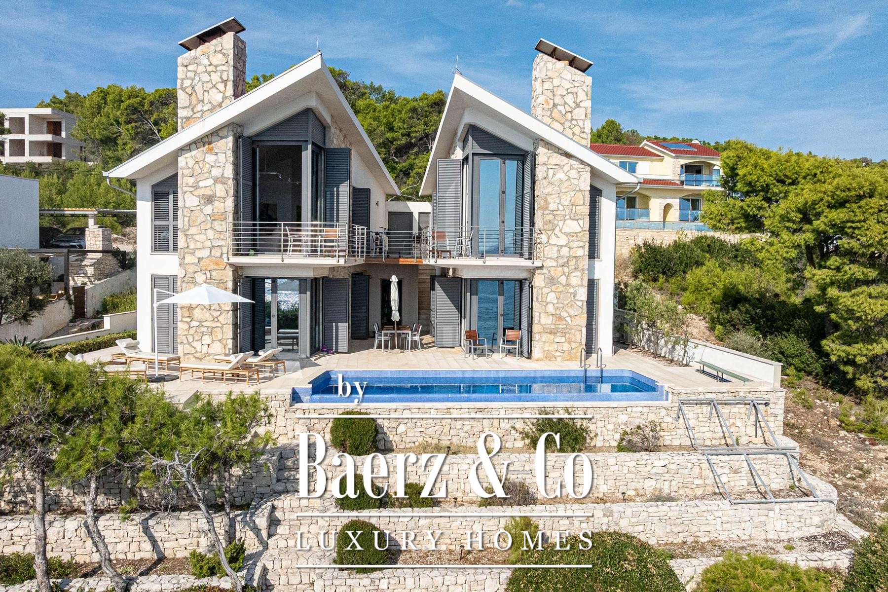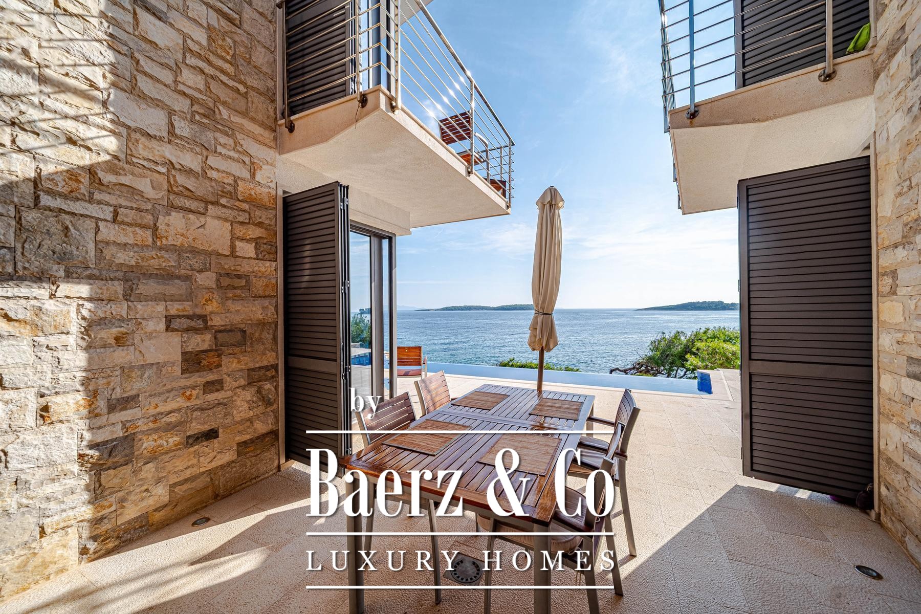 Blato别墅坐落于克罗地亚海岸第一线,占地500平方米,室内面积达260平方米。建筑线条明朗,主体由两座独立单元组成,通过宽敞的露台相连,每套单元都是完整私密的居所。两套单元主层均为开放式客厅、餐厅与厨房组合,上层各设有两间配套卫浴的卧室及专属露台。