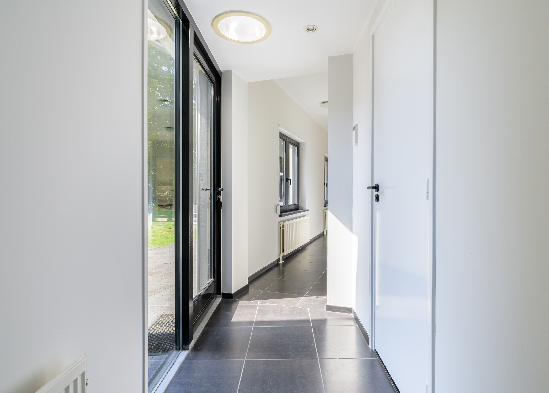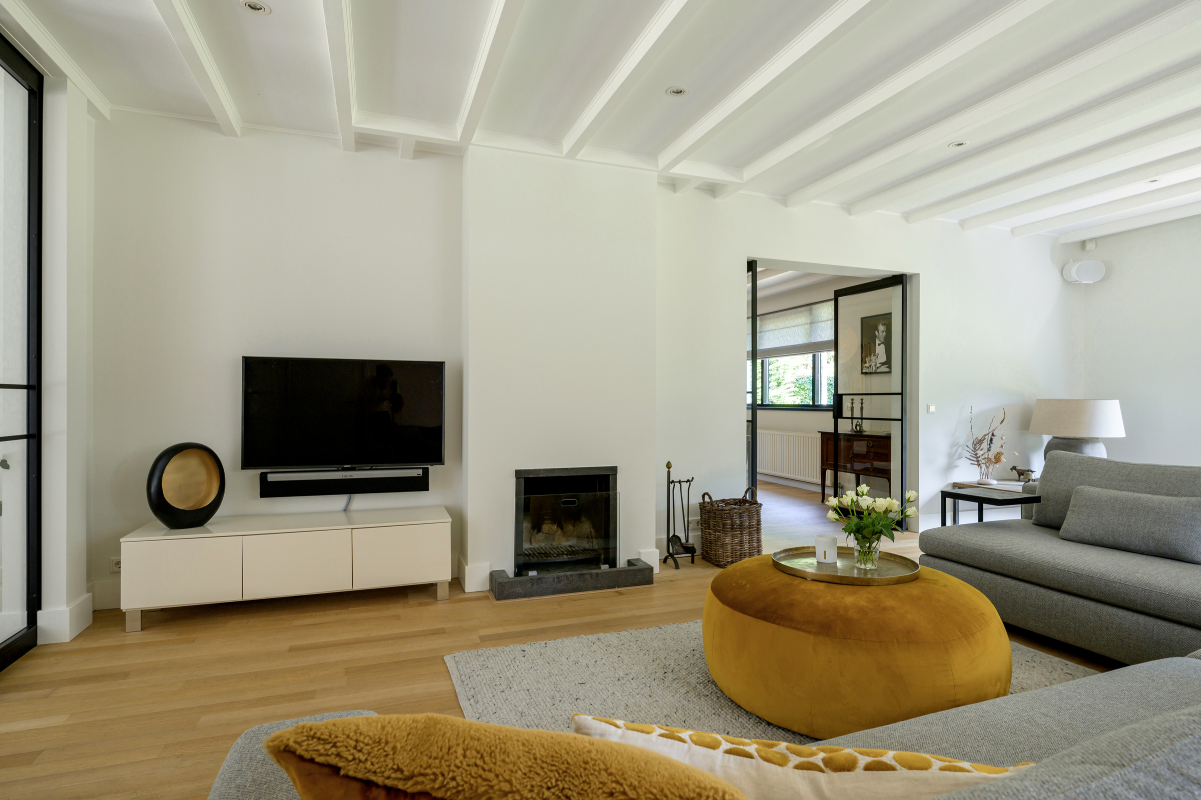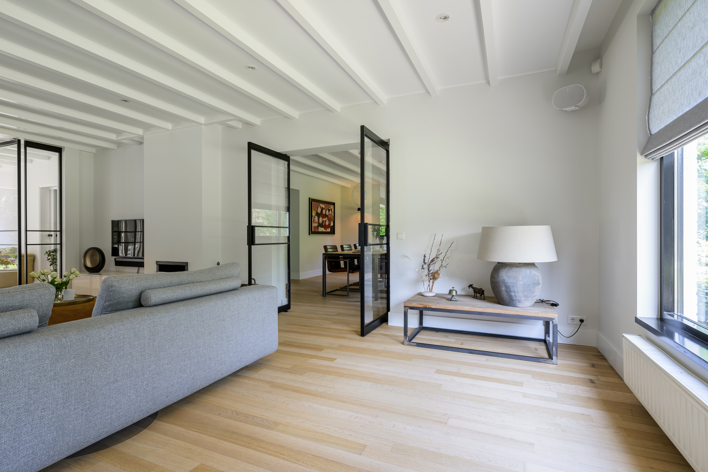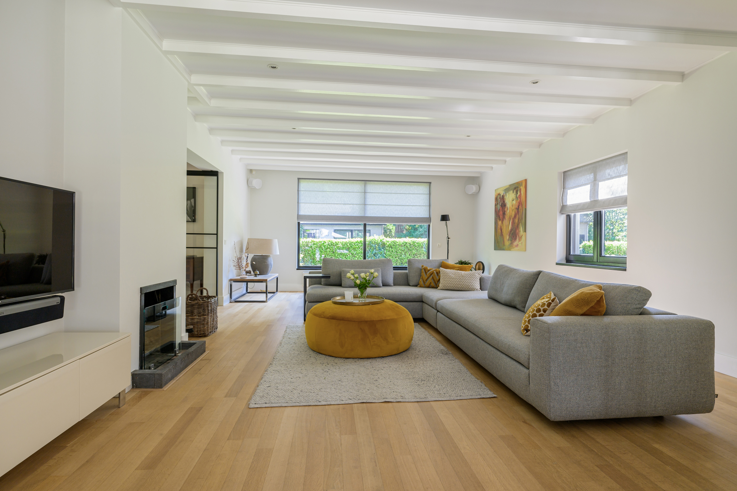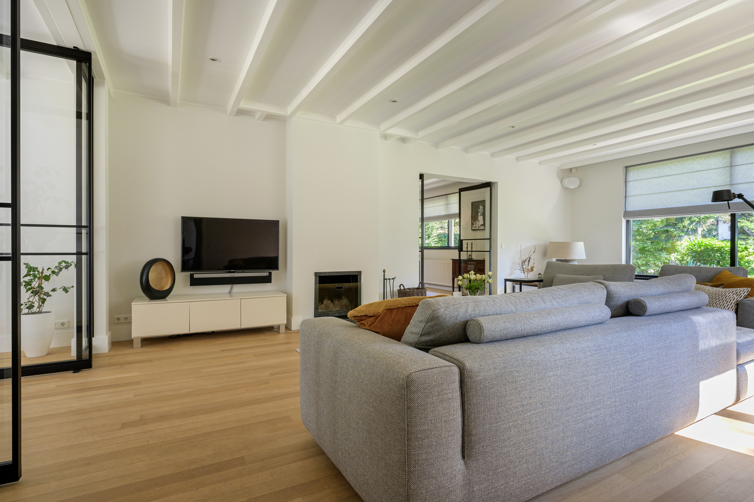 住宅注重实用型可持续发展,配备地板与天花板隔热层、HR++ 玻璃、18 块太阳能板及现代供暖系统,营造高效静谧的居住环境。大尺寸板岩瓷砖、实木地板与拼花地板进一步彰显住宅内敛的格调,横梁天花板与内嵌灯光营造出律动感。起居区自配有壁炉的休息室,通过玻璃门自然延展至花园,并与独立餐厅及设施齐全的厨房(含辅助用房)无缝连接。