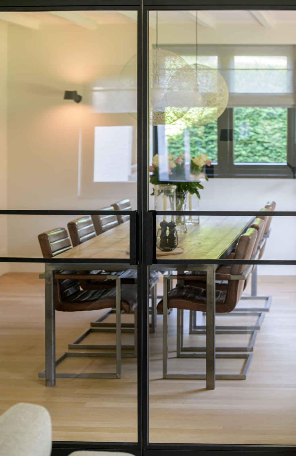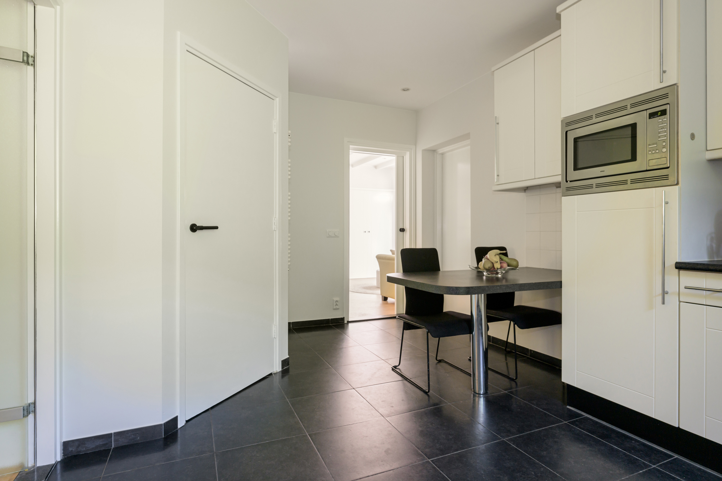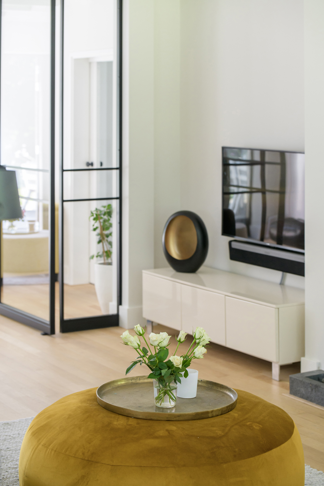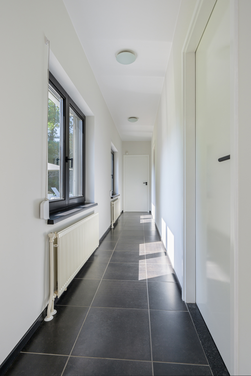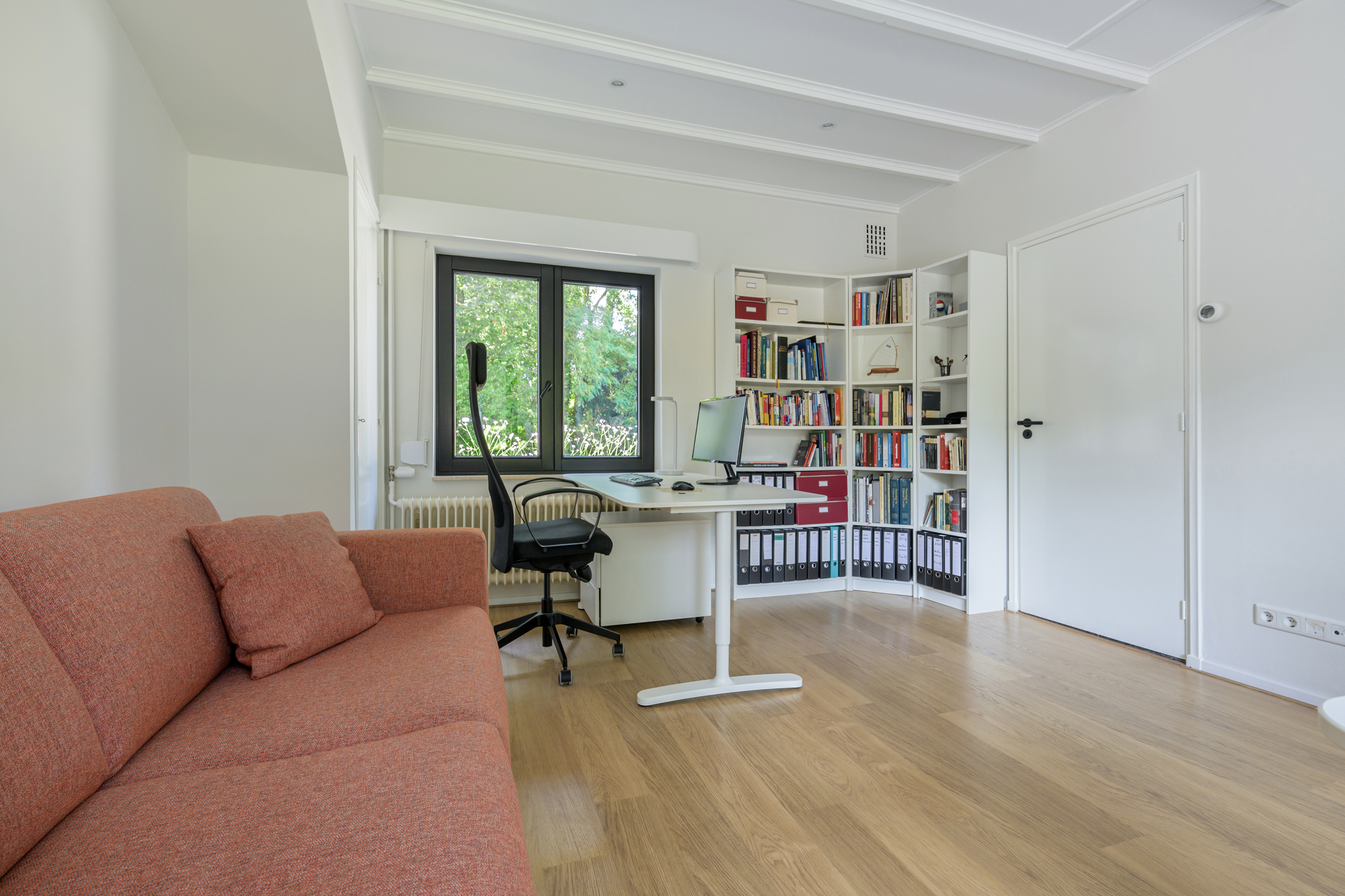 住宅注重实用型可持续发展,配备地板与天花板隔热层、HR++ 玻璃、18 块太阳能板及现代供暖系统,营造高效静谧的居住环境。大尺寸板岩瓷砖、实木地板与拼花地板进一步彰显住宅内敛的格调,横梁天花板与内嵌灯光营造出律动感。起居区自配有壁炉的休息室,通过玻璃门自然延展至花园,并与独立餐厅及设施齐全的厨房(含辅助用房)无缝连接。