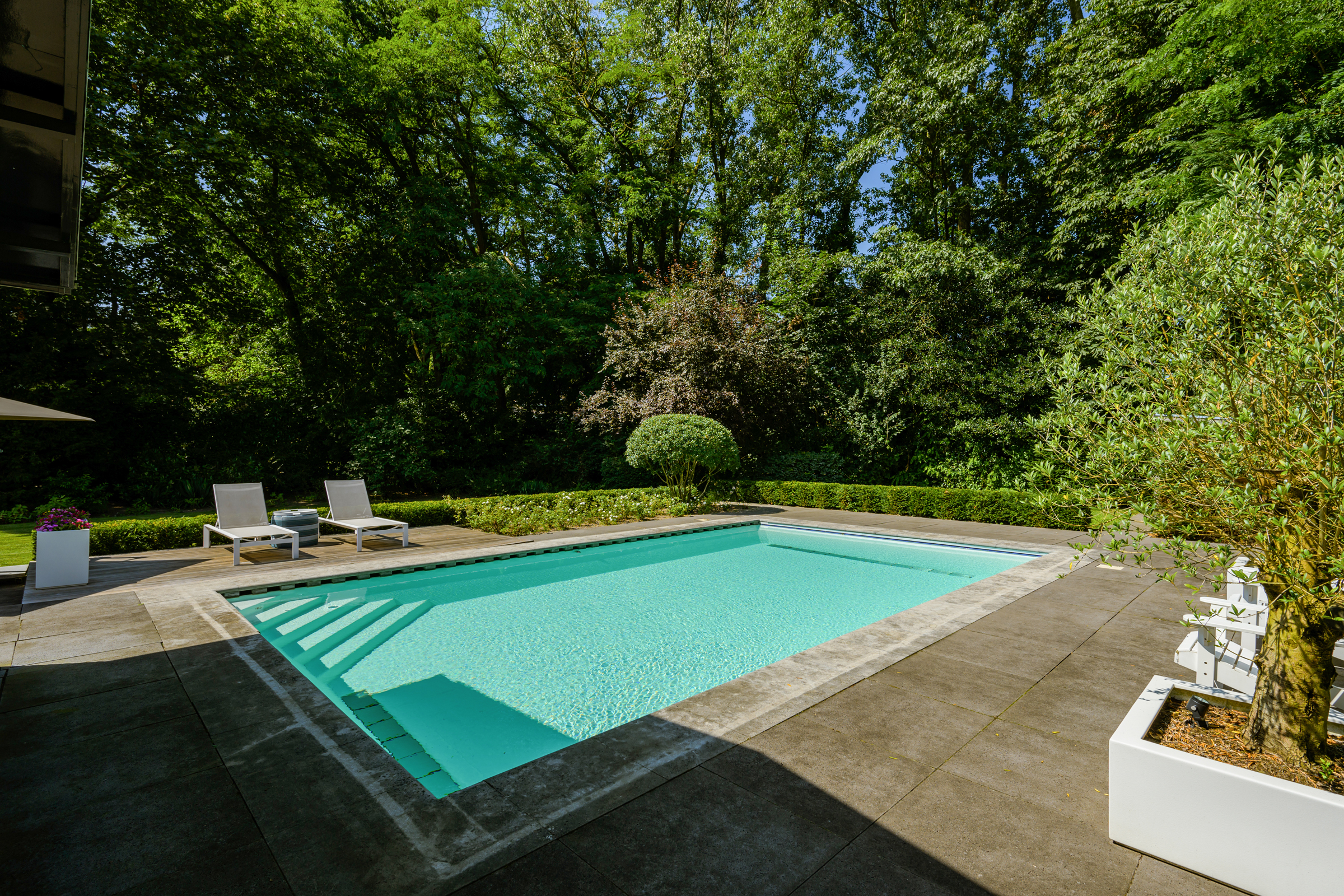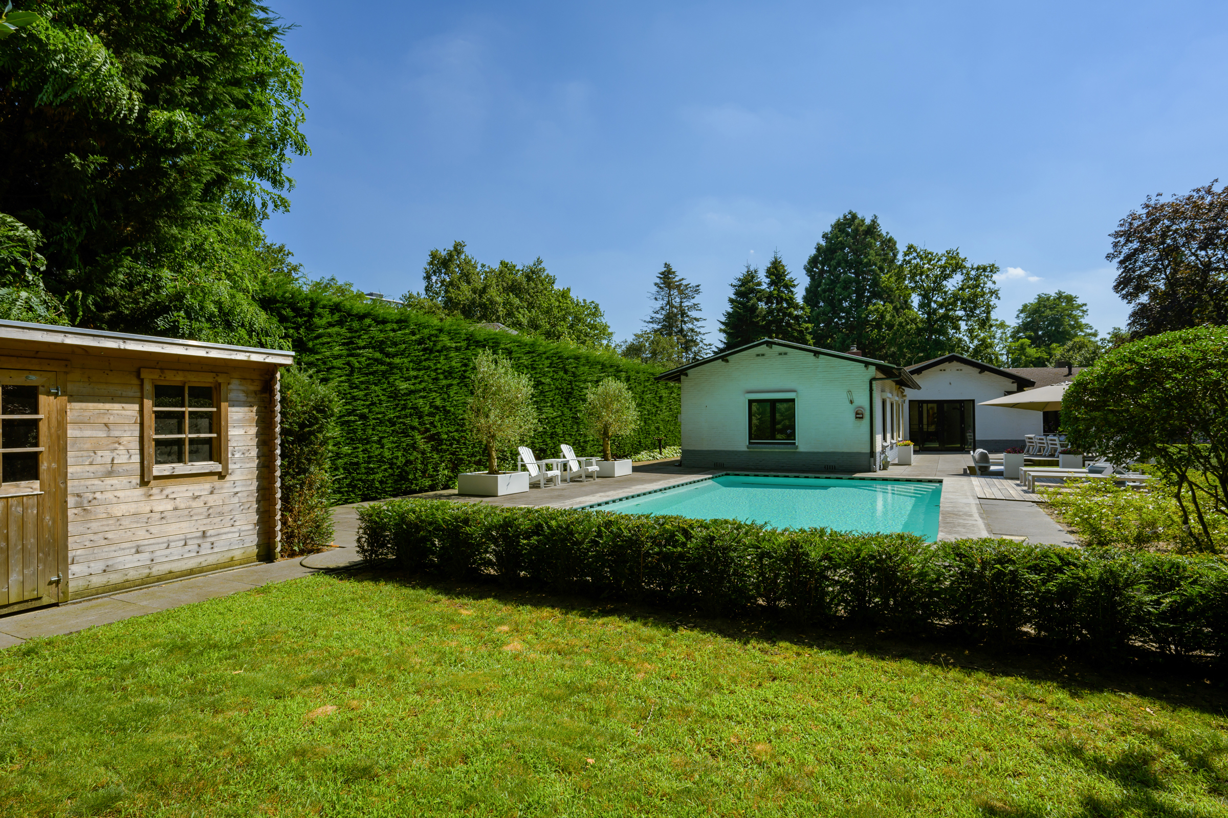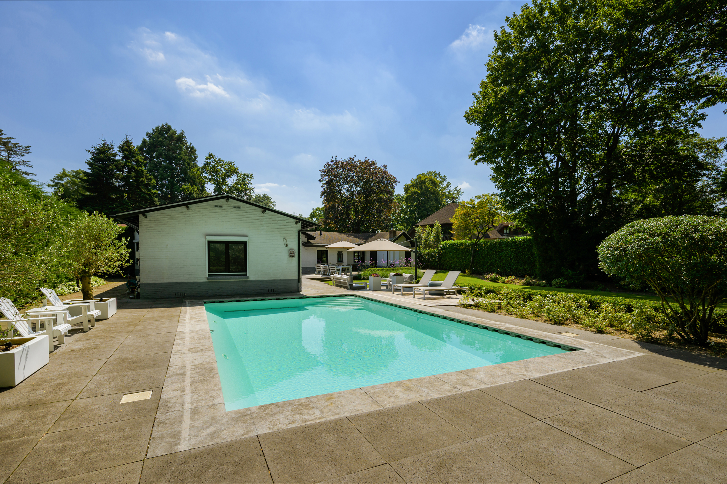 宽敞的景观花园如同私密的静谧绿洲,配有宽阔草坪、多重露台、成熟树木、丰富植被,以及一座 6 x 9.5 米的恒温游泳池。宽敞车库、安保储藏间及隐蔽技术设备(如报警装置、百叶窗、泳池加热及灌溉系统)均体现了对舒适与私密的精心考量。