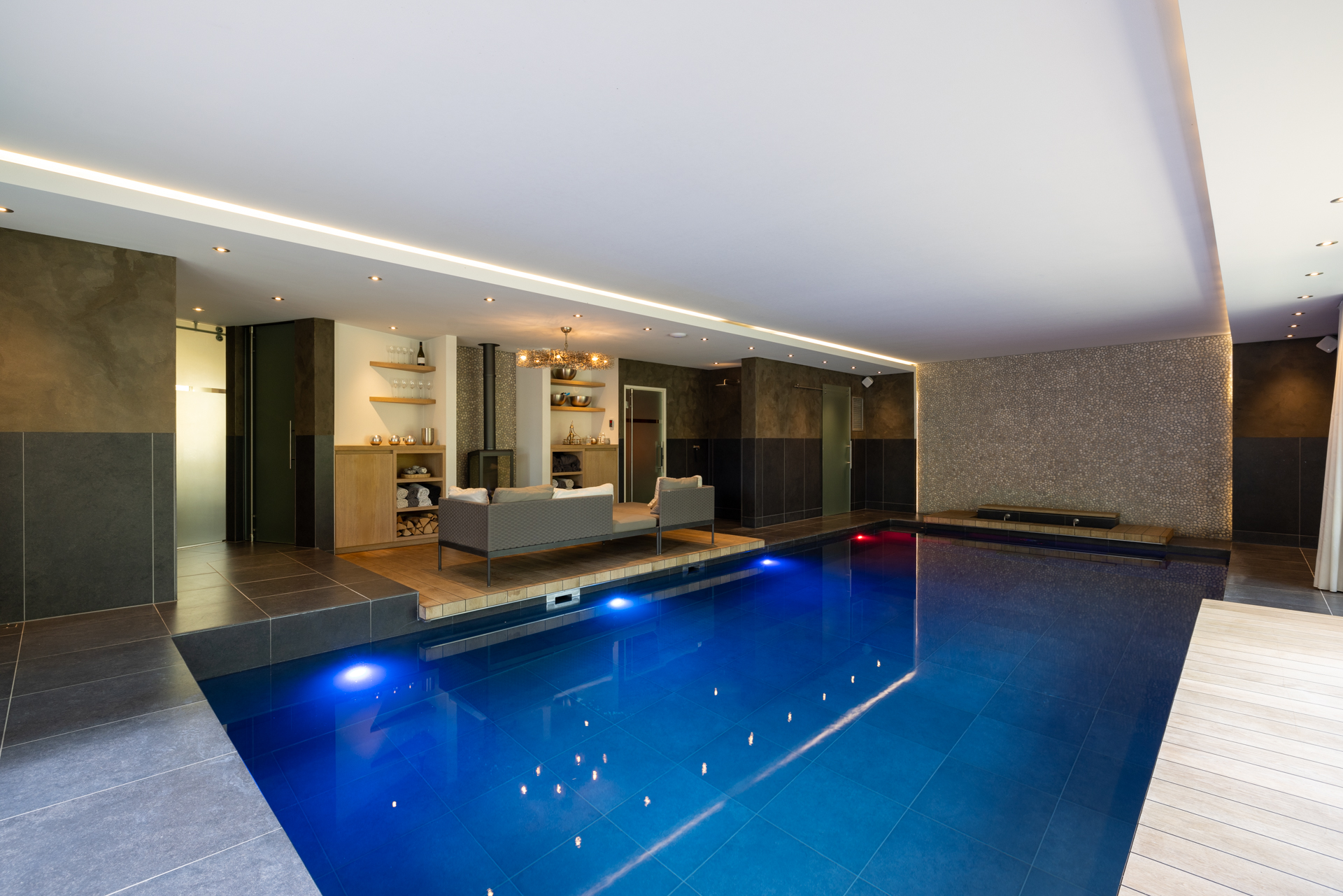 宽敞的起居室通过高大的落地玻璃门通向景观花园,自然光与园景悄然定义着室内氛围。Antonissen定制厨房配备Gaggenau电器,既是日常仪式和节庆活动的中心,也与户外厨房、带燃气壁炉的覆盖式露台休息区无缝连接。专属康体区设有加热室内泳池、桑拿、雨淋花洒和充裕的休憩空间。
