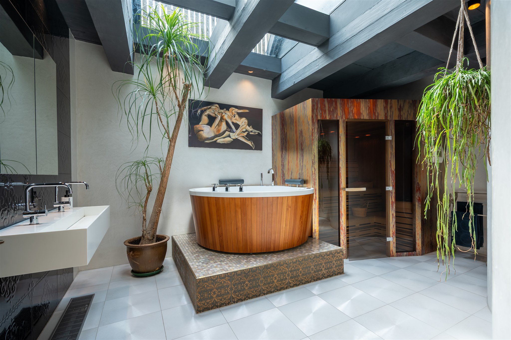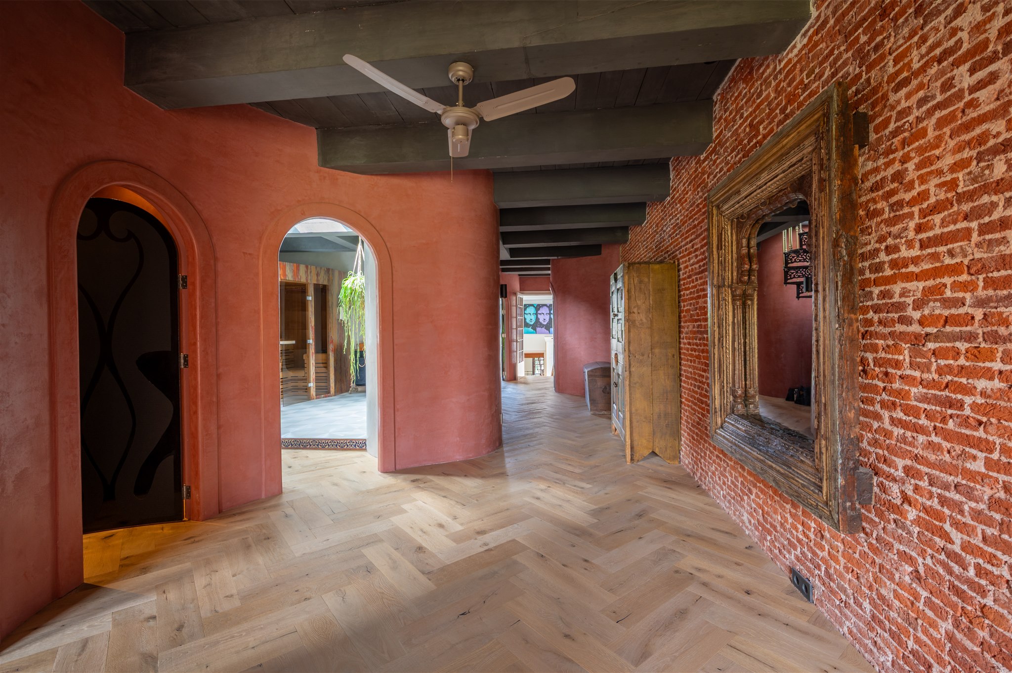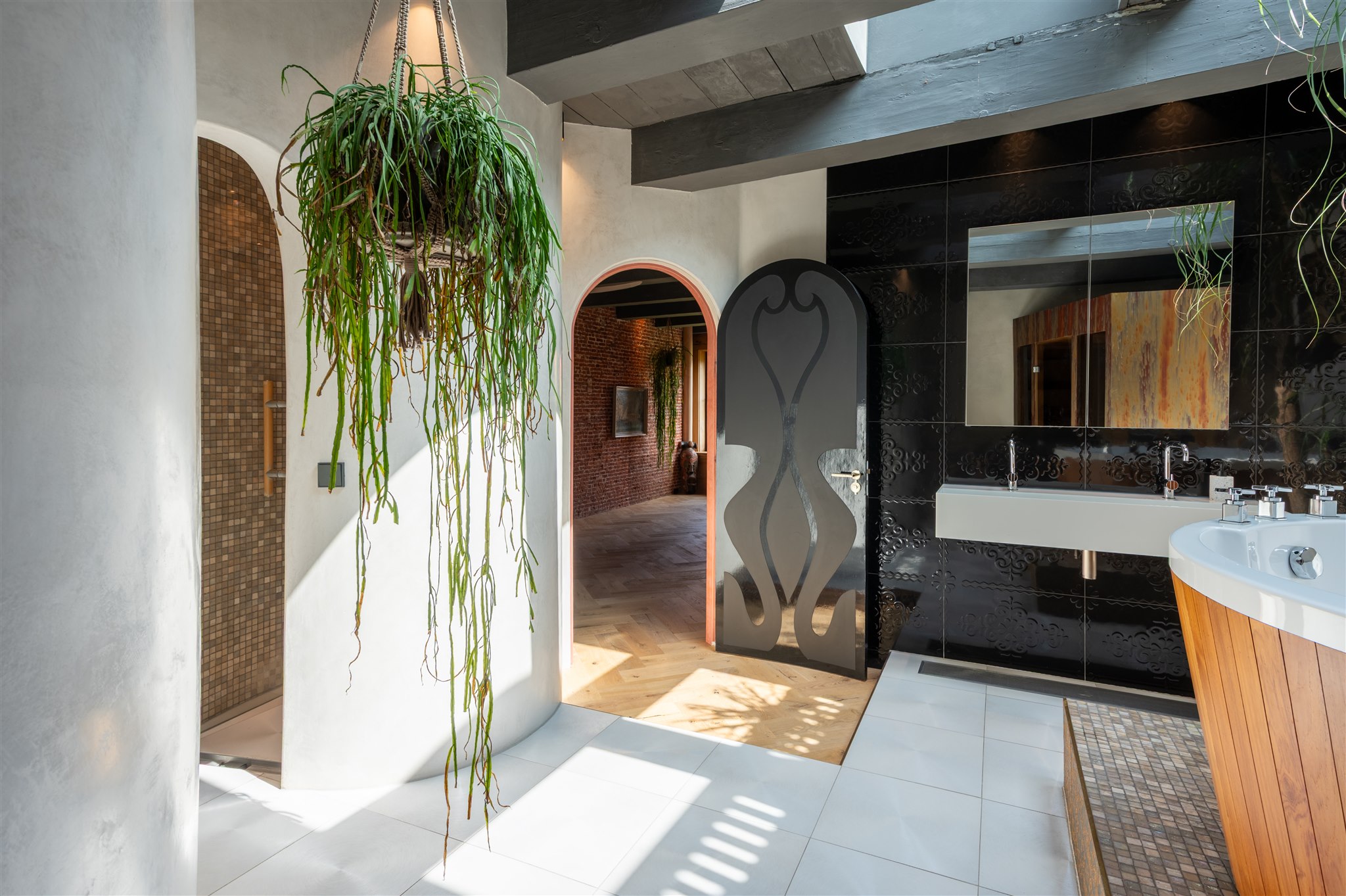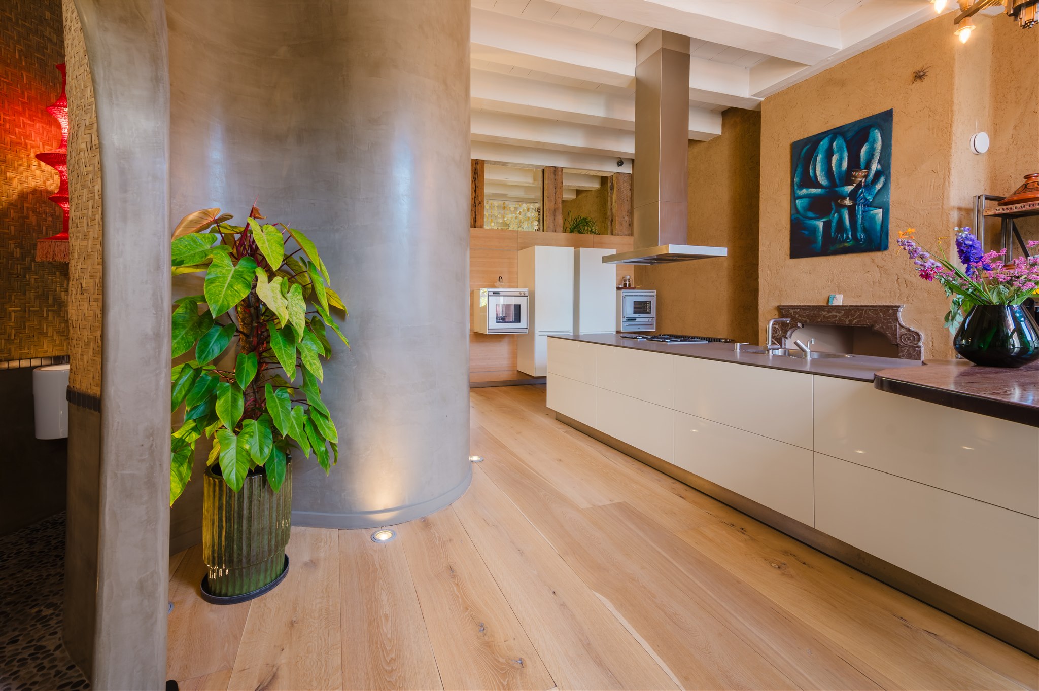底层以大理石门厅、庄重的办公区及拱形地窖迎宾,通向 100 平方米的热带园林,配备石制储物间,并有隐蔽通道通往三个私人停车位。花园房配备地暖与画作般的墙面,自然衔接室内外。家居与待客生活在铺设橡木地板、四米高顶的起居室中展开,后部为配备 Gaggenau 器具的 Bulthaup 厨房。