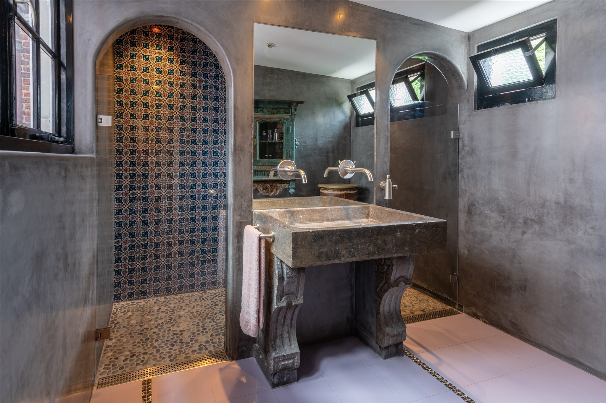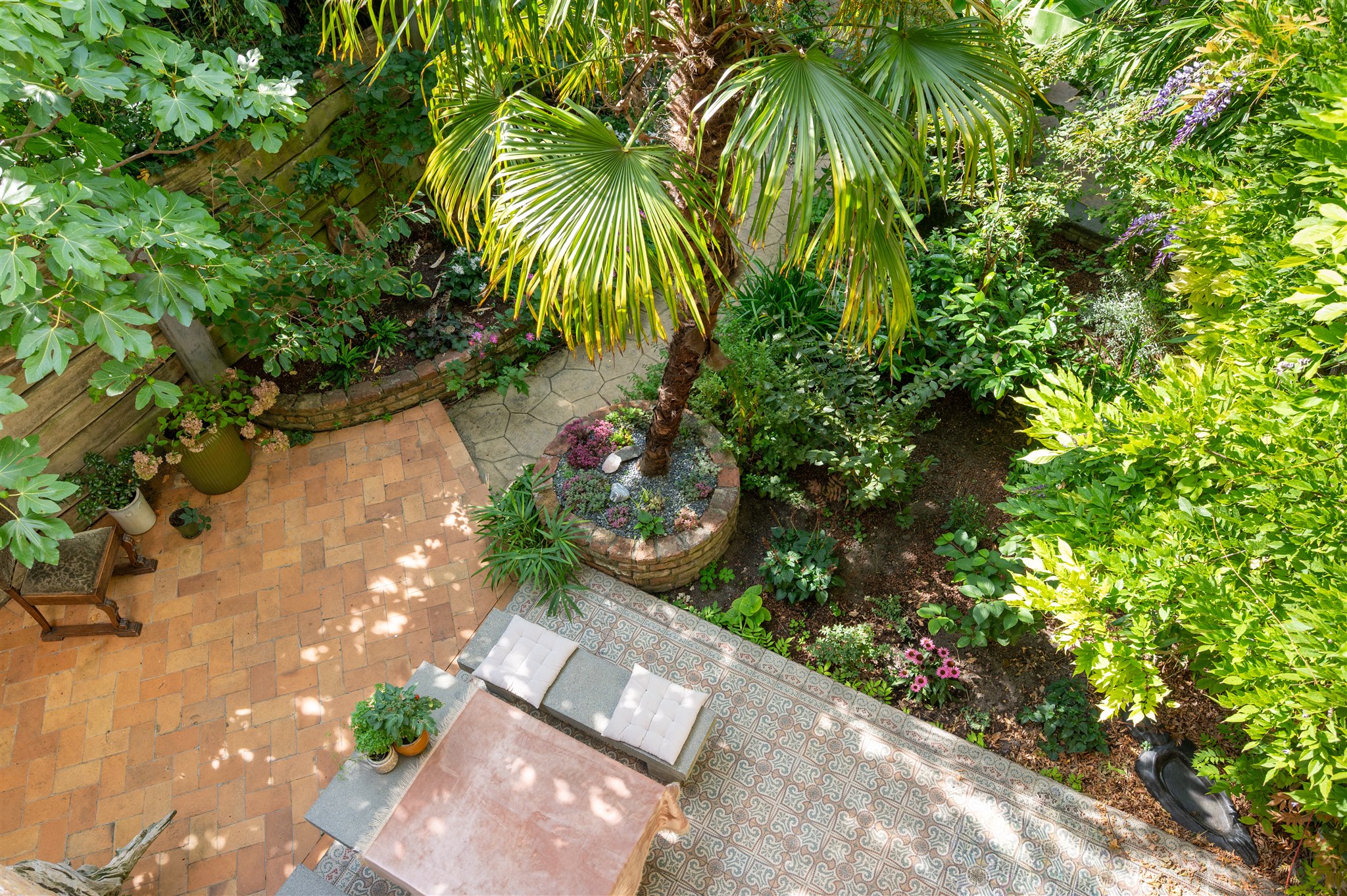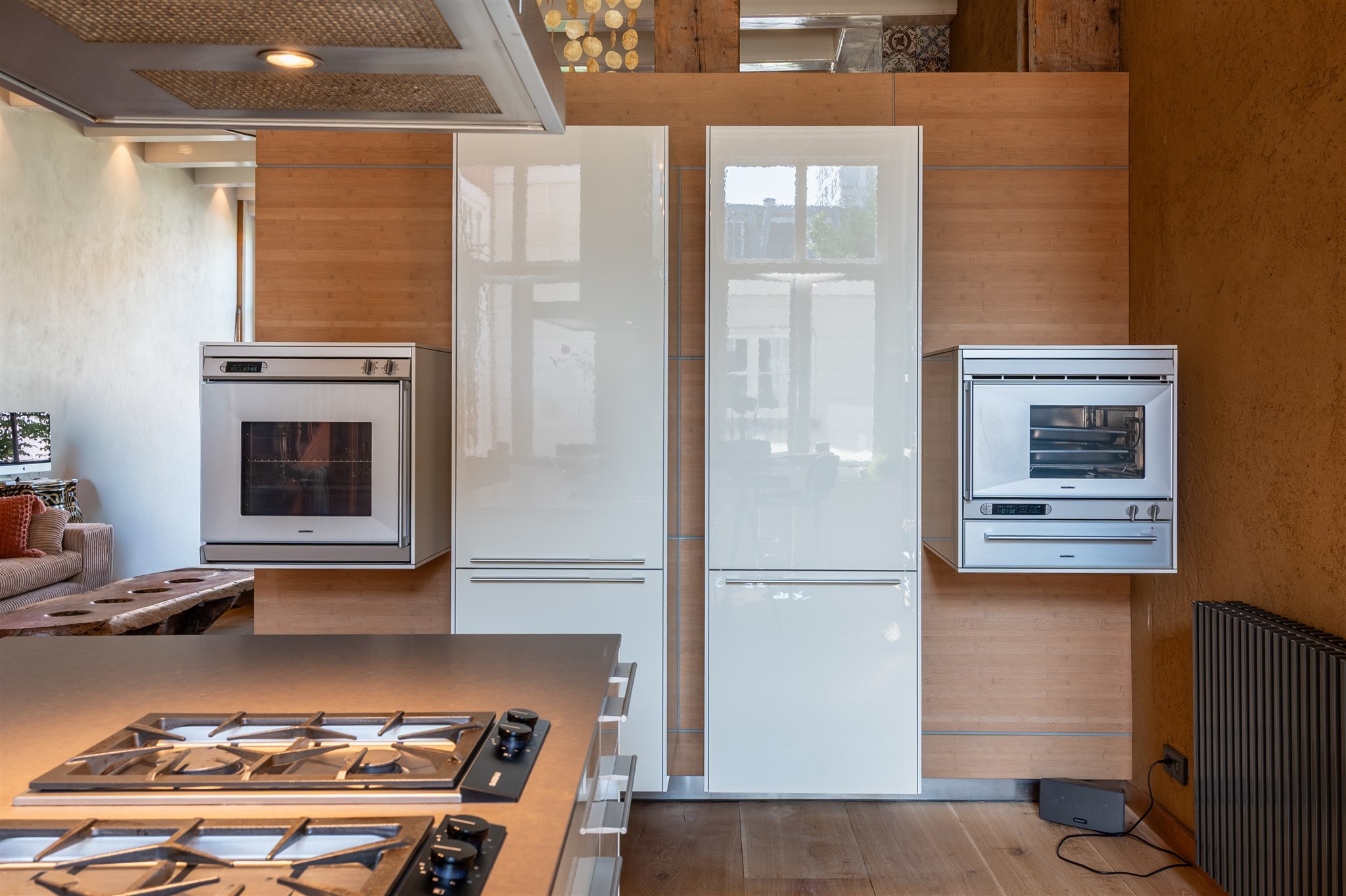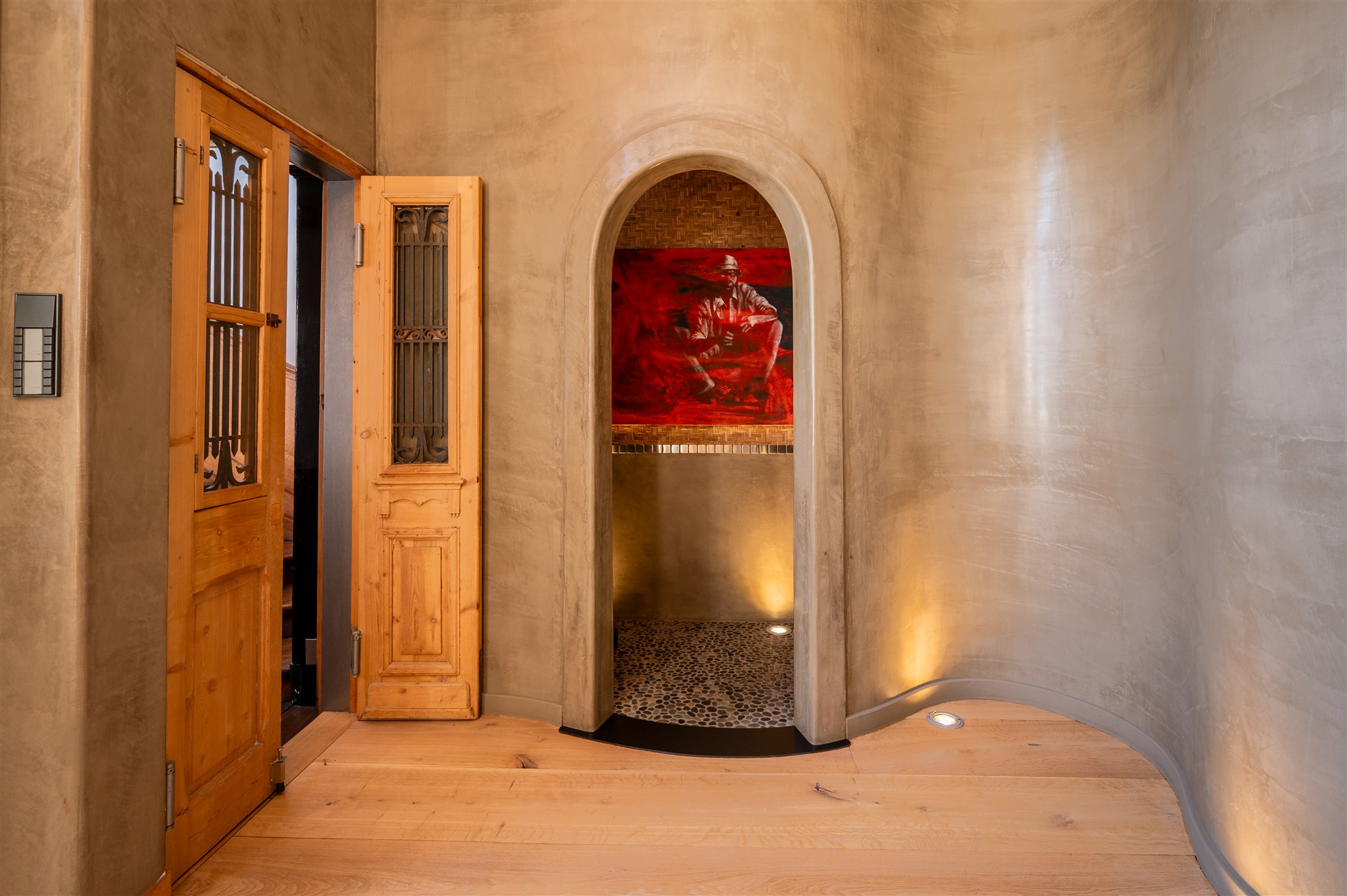 底层以大理石门厅、庄重的办公区及拱形地窖迎宾,通向 100 平方米的热带园林,配备石制储物间,并有隐蔽通道通往三个私人停车位。花园房配备地暖与画作般的墙面,自然衔接室内外。家居与待客生活在铺设橡木地板、四米高顶的起居室中展开,后部为配备 Gaggenau 器具的 Bulthaup 厨房。