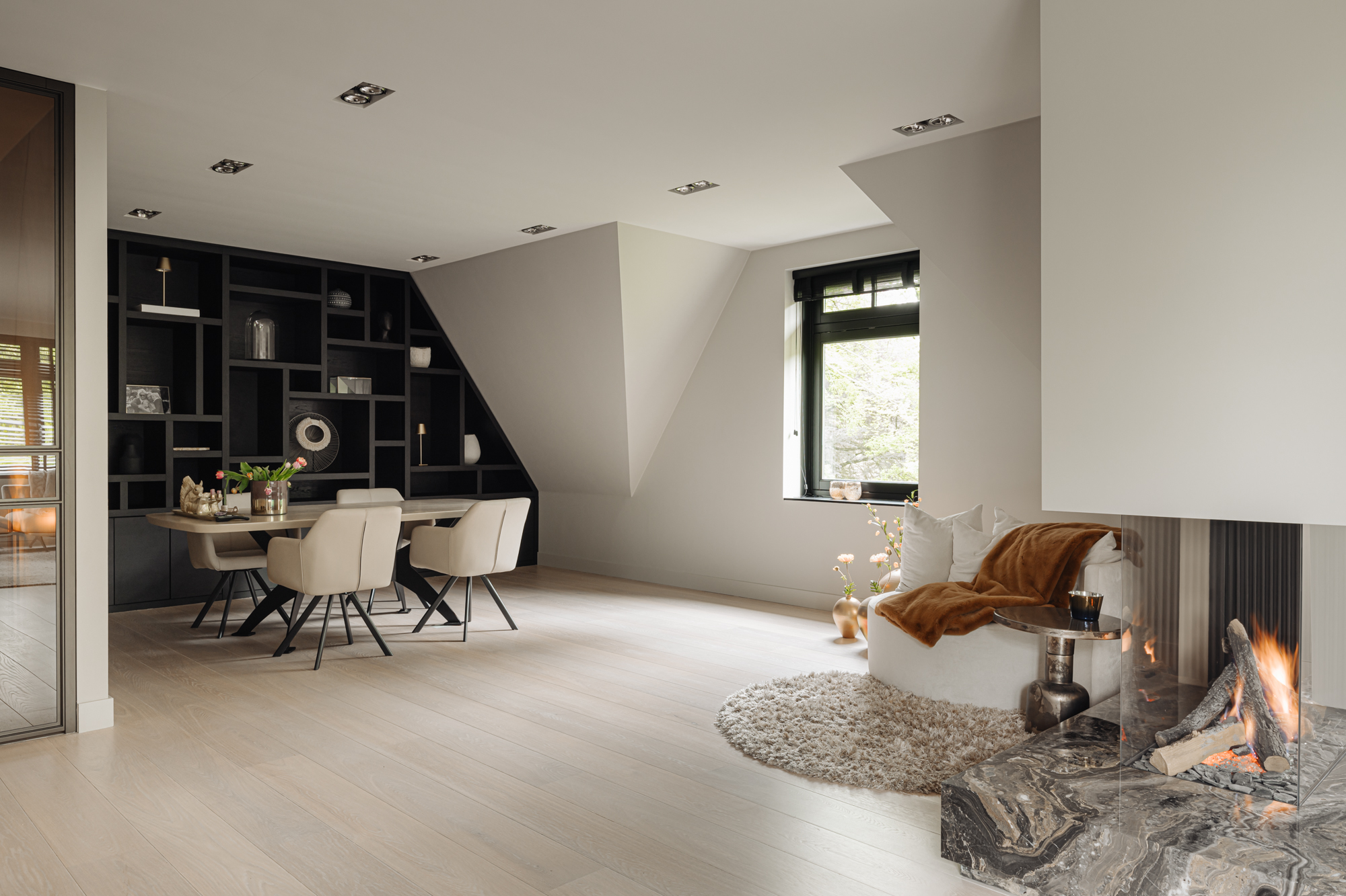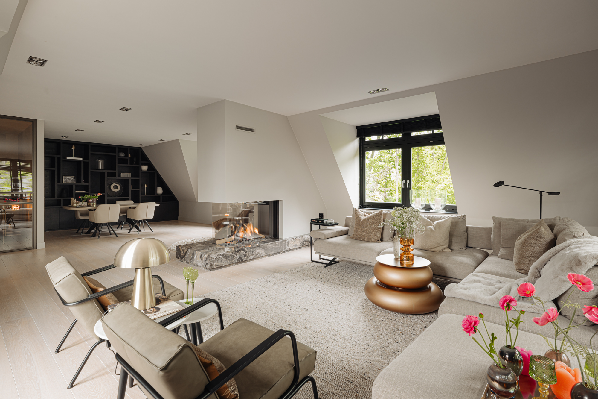 步入双开铜制法式门,明亮的光线洒满开放式客厅,并延伸至西南朝向的屋顶露台。以大理石包裹的燃气壁炉巧妙划分宽敞的休息区与用餐区,使家的夜晚安静自得。厨房为美食家精心打造,配备 Miele 品牌电器、大理石中岛、XL 号酒柜,且可直通露台,室内外生活随心切换。