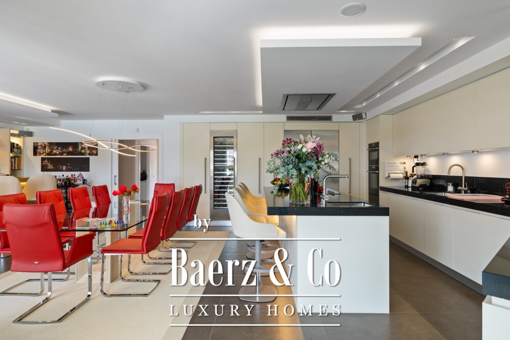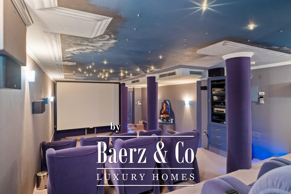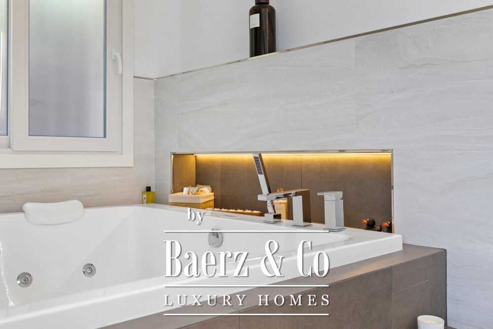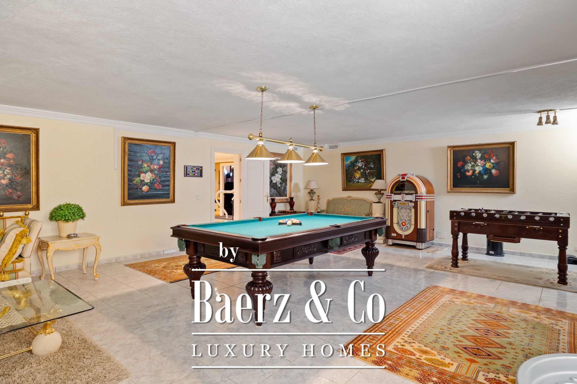 底层以宽大的客厅为中心,挑高天花板与壁炉营造奢雅氛围,辅以餐厅区域及配备 Siemens 与 Neff 电器的开放式厨房。四间客卧配备独立卫浴,设有家庭办公室、访客卫生间、洗衣房和休闲酒吧,将功能性与舒适感完美结合。带顶和开放式露台延展至精心打造的花园和比例得当的恒温泳池。