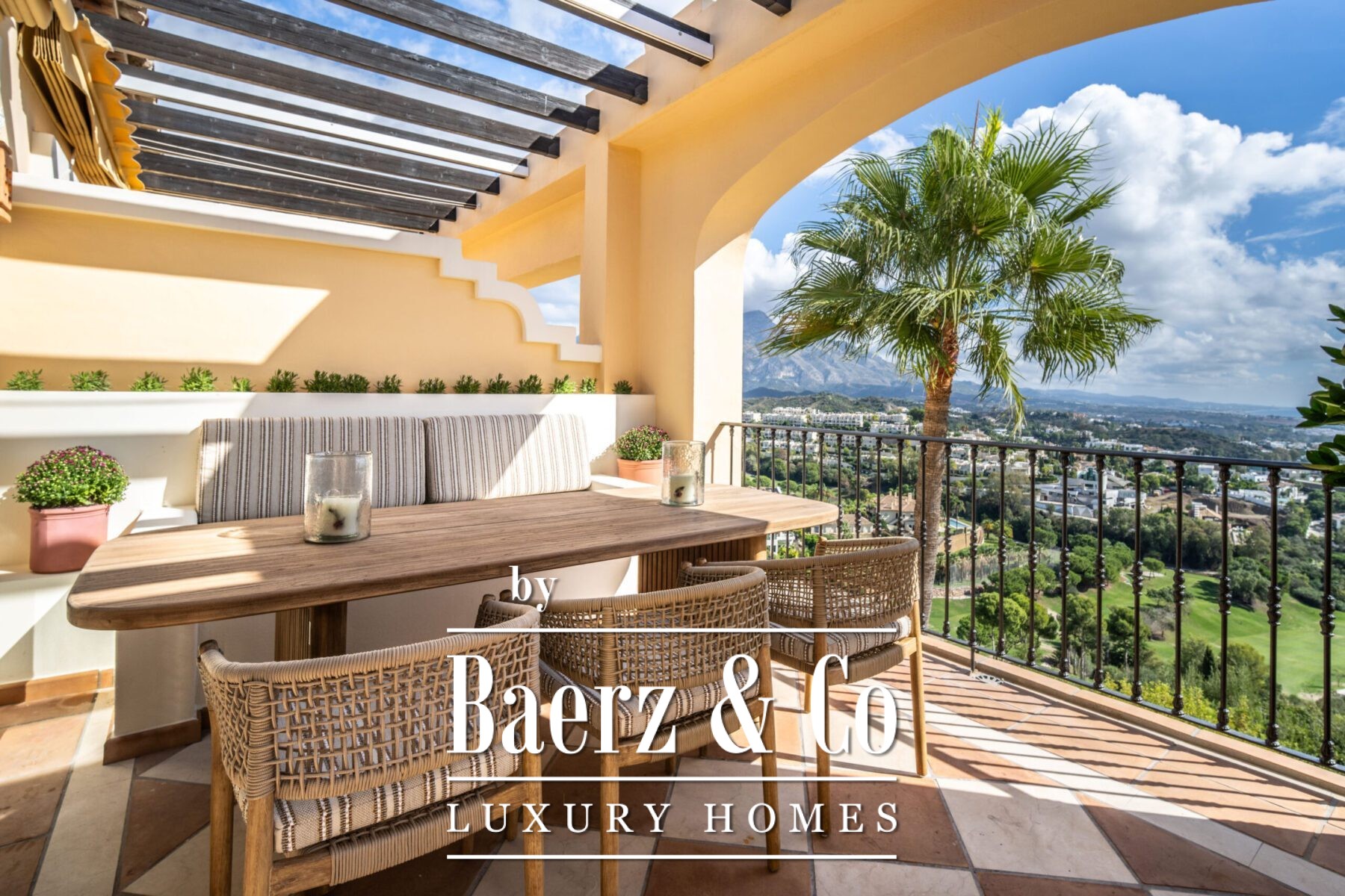 这套位于马贝拉La Quinta的顶层公寓以开阔视野俯瞰海洋、群山以及翠绿的高尔夫球场,为景观增添尊贵气息。全季露台邀您全年舒居,日出时的宁静与傍晚柔和的光线在此交汇,非常适合私密用餐或静谧休憩。