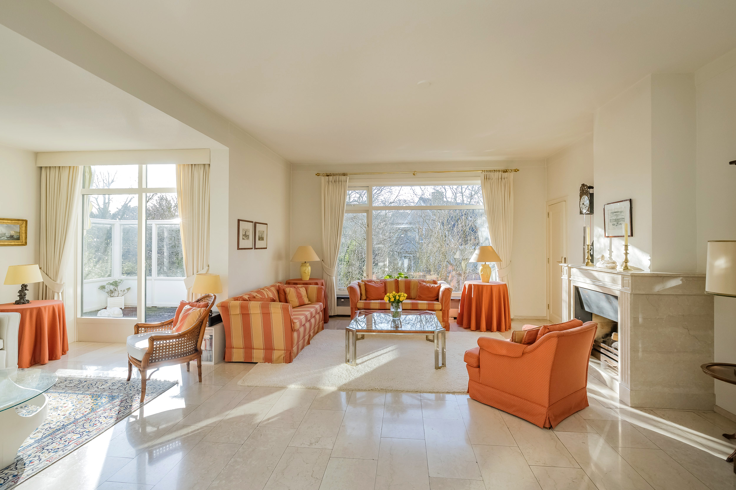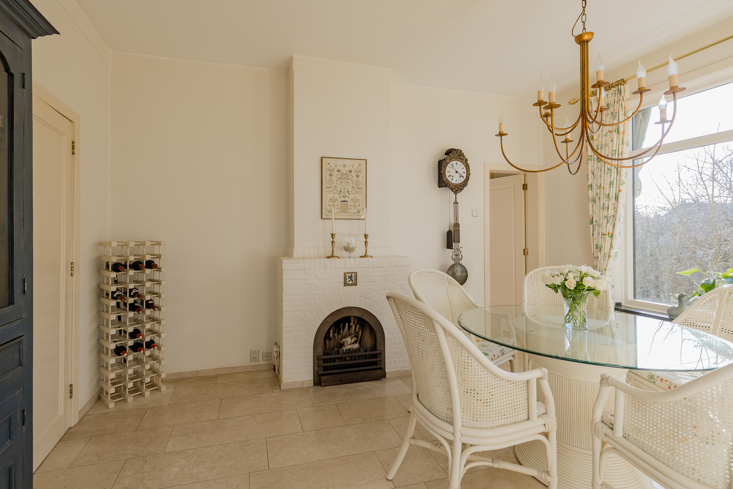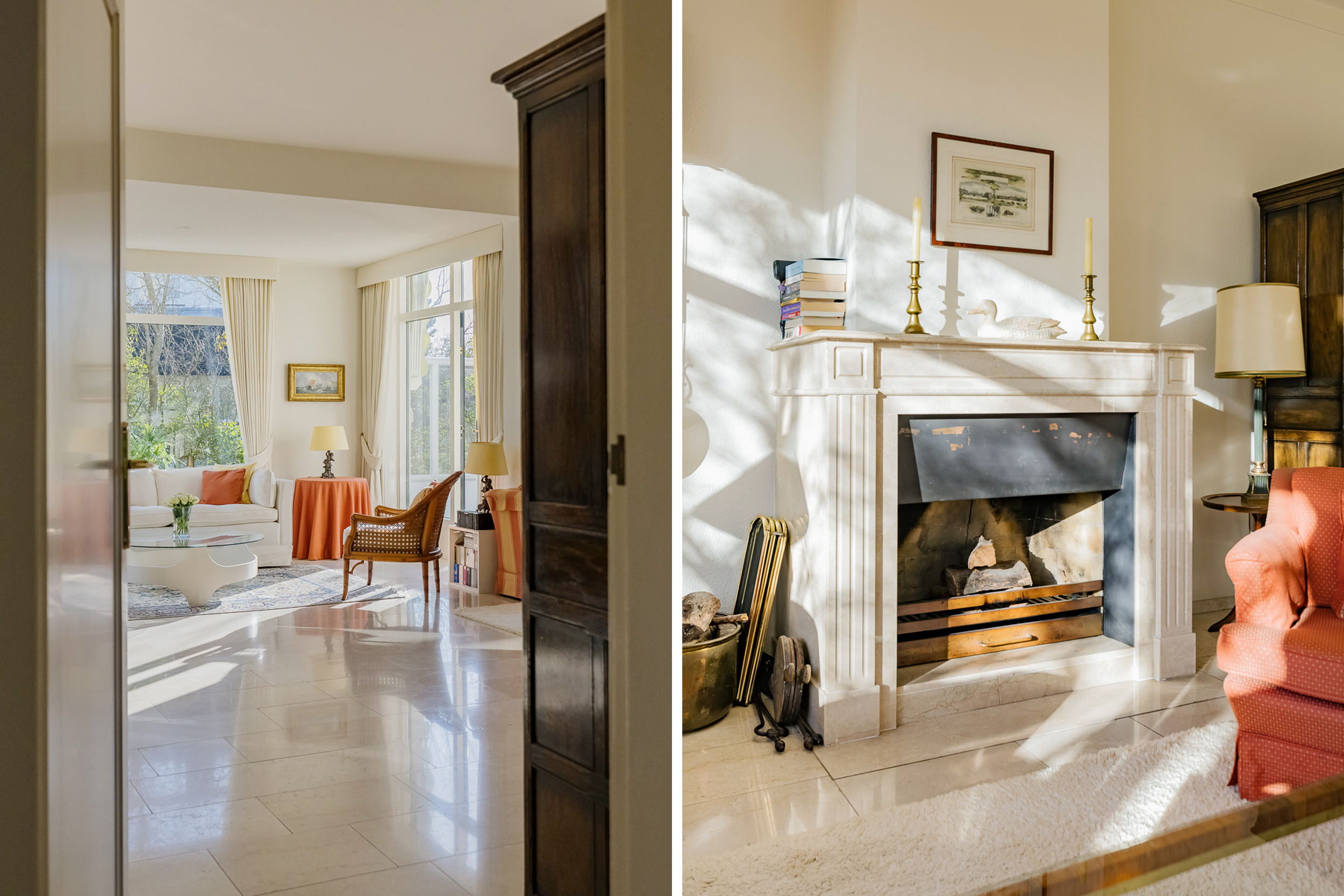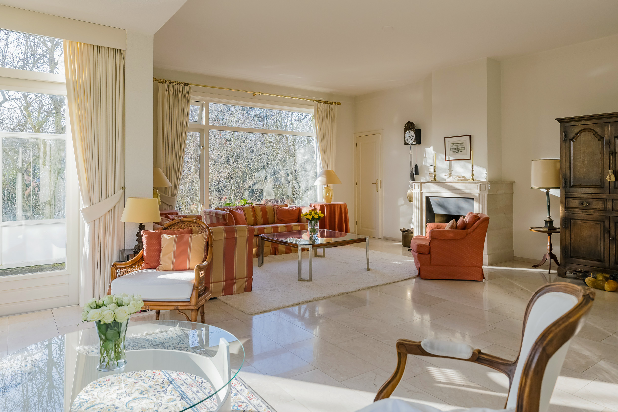 宽敞的客厅配备壁炉及地暖,营造温馨氛围,配以大理石地板和明亮的花园景观,空间静谧怡人。优雅的连体餐厅自然而然地延伸,阳光充沛、全景玻璃封闭的露台迎接清晨第一缕阳光。厨房为社交聚会而设计,配备燃气壁炉和现代化电器。