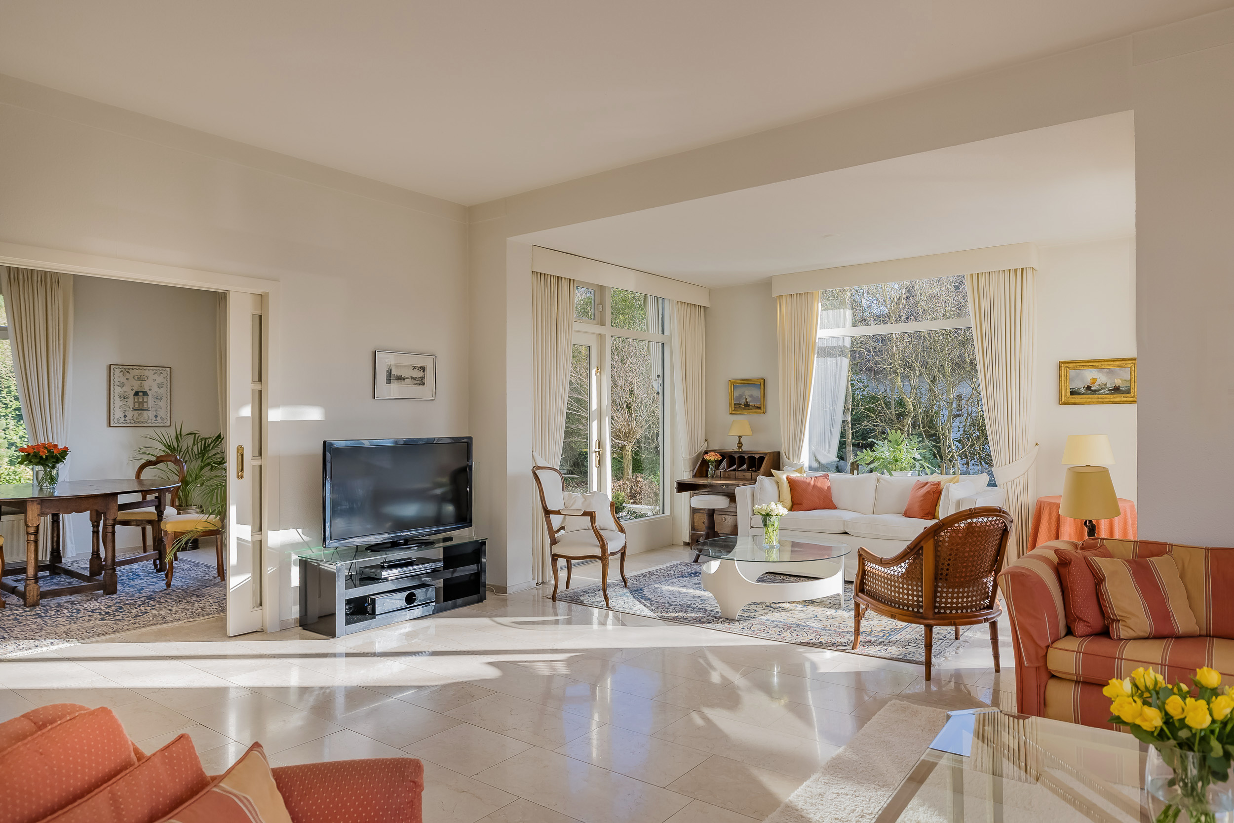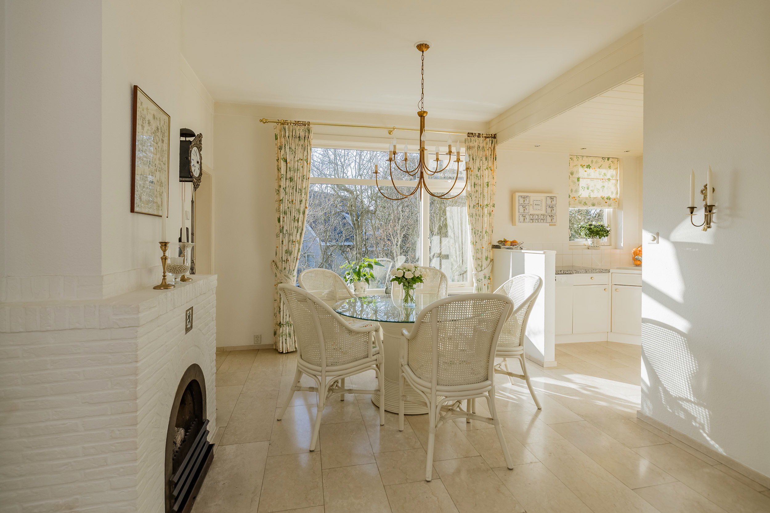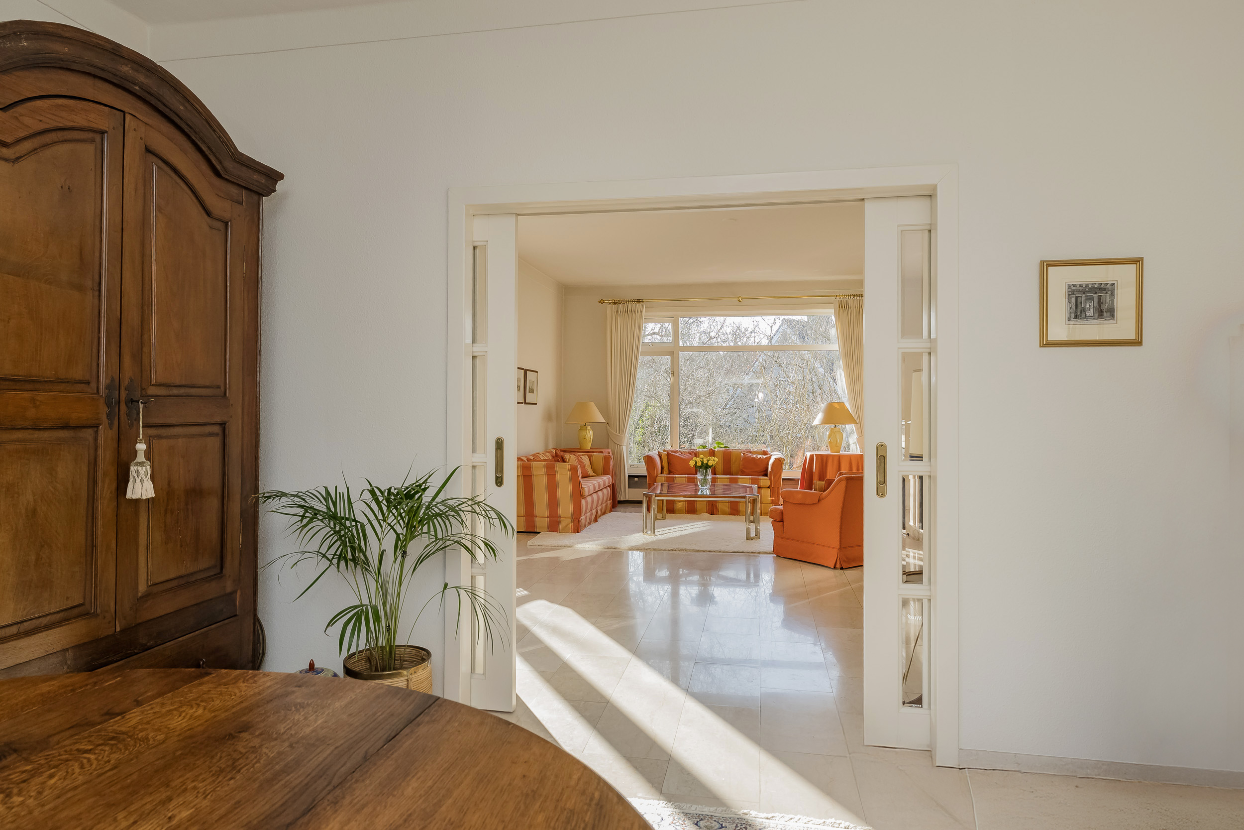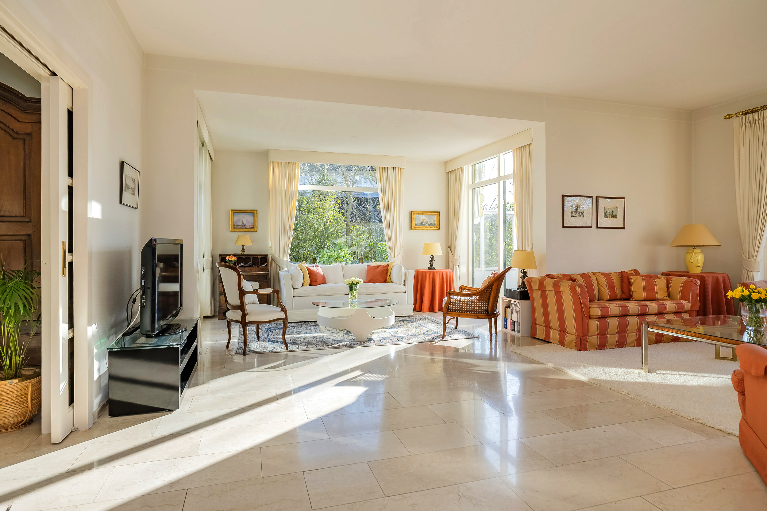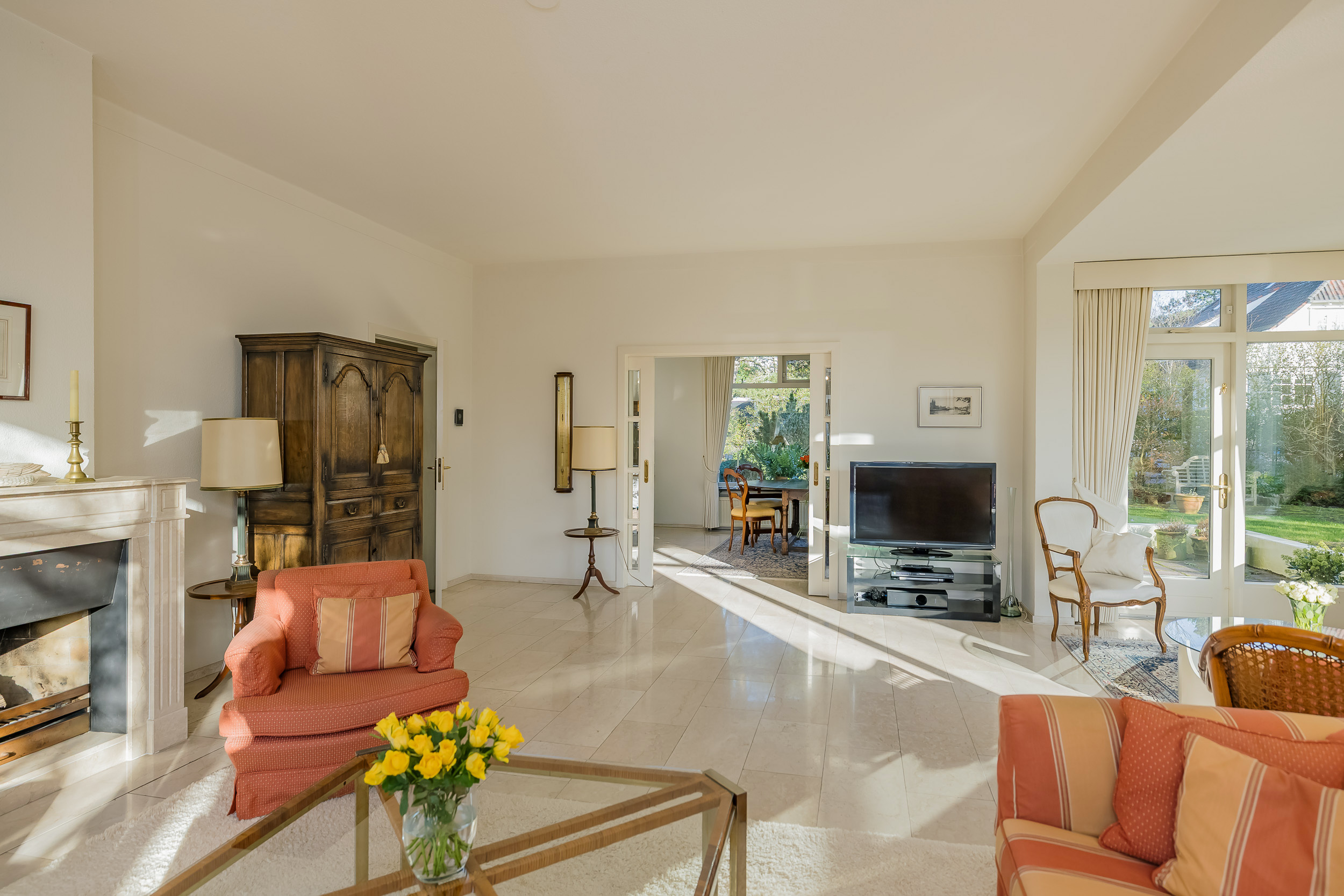 宽敞的客厅配备壁炉及地暖,营造温馨氛围,配以大理石地板和明亮的花园景观,空间静谧怡人。优雅的连体餐厅自然而然地延伸,阳光充沛、全景玻璃封闭的露台迎接清晨第一缕阳光。厨房为社交聚会而设计,配备燃气壁炉和现代化电器。