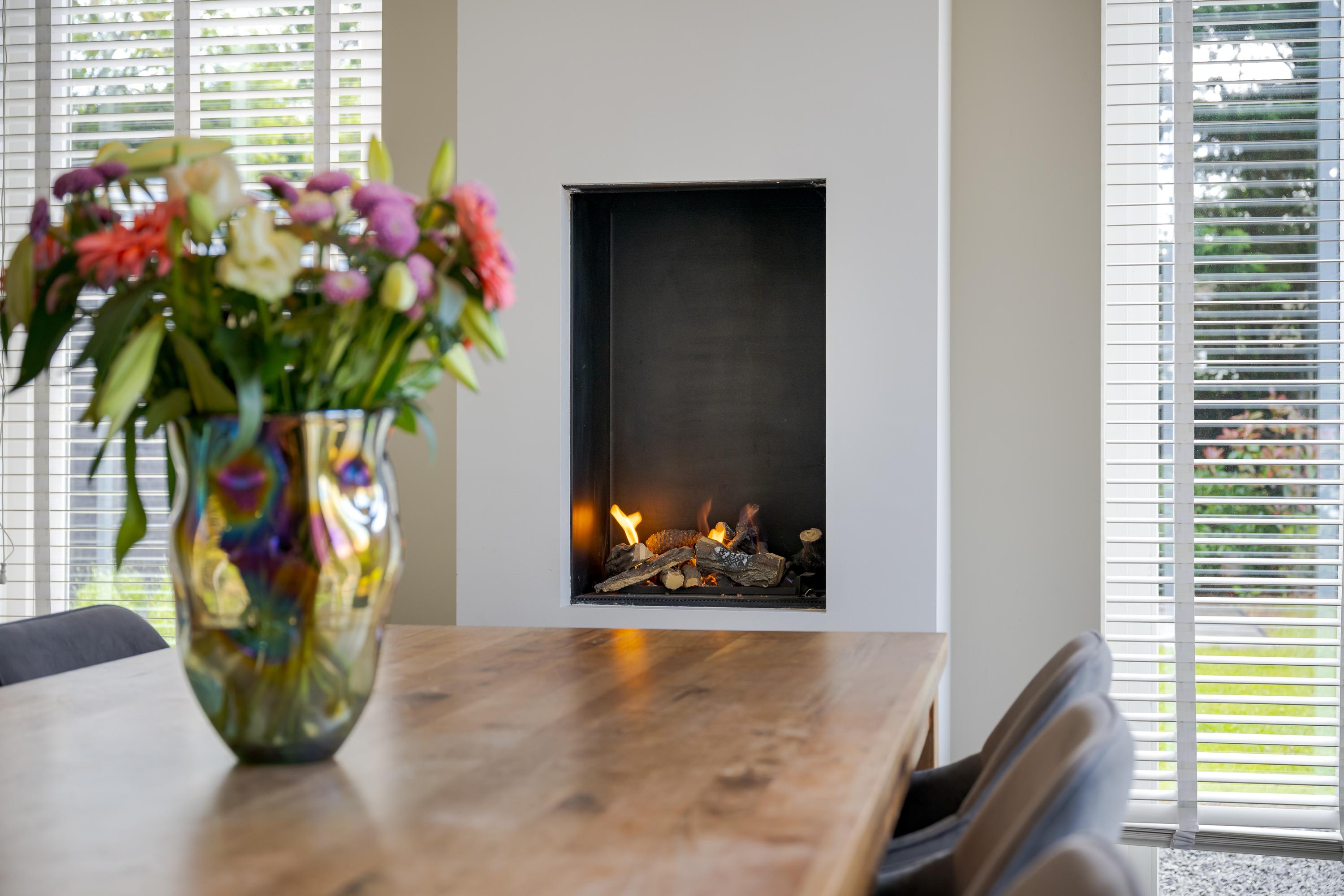 进入别墅后,宽敞的玄关与客厅相连,客厅设有现代壁炉与开阔视野。厨房配备高品质家电、带双水槽的岛台以及设于燃气壁炉旁的正式餐区。推拉门可选择保持厨房与邻近书房的独立或连通,杂物间直通花园,便利日常生活。