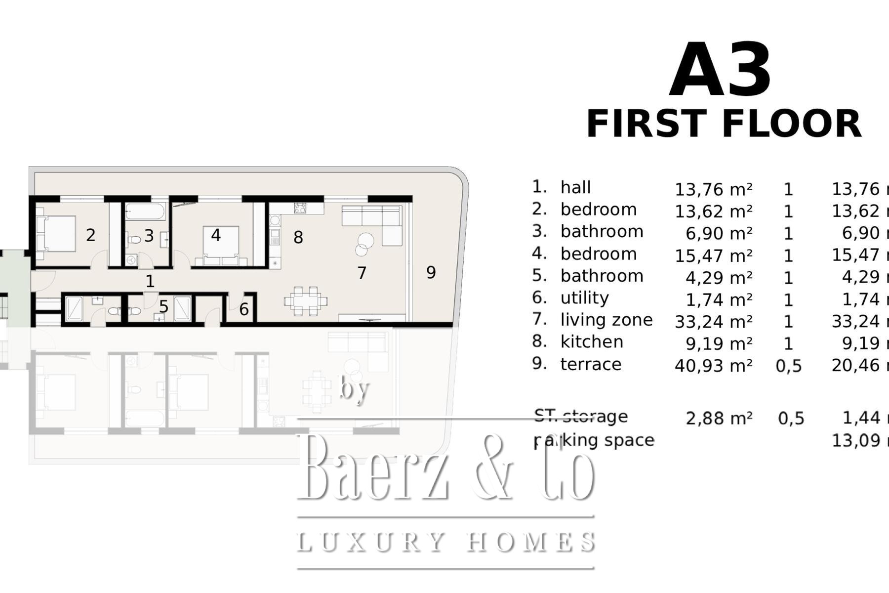 A3公寓总面积为120平方米,98.21平方米的室内生活空间布局合理,兼顾舒适与实用。格局包括入户玄关、储藏室,两间宽敞卧室,以及两间现代化卫浴。开放式生活区流畅衔接厨房与餐饮空间,通向一座宽达40.93平方米的慷慨露台,可饱览迷人的海景。