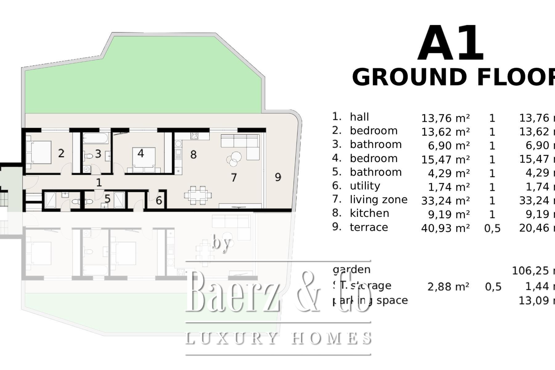 住宅着重于现代建筑美学与持久品质,包括入口门厅、两间宽敞卧室、两间现代卫浴,以及开放式起居区结合厨房与餐厅。宽大玻璃门将室内起居空间与 40.93 平方米的露台相连,流畅延伸至户外,尽揽全景海景。106.25 平方米私人花园,为静谧休憩或沿海宴请营造出独享绿意空间。