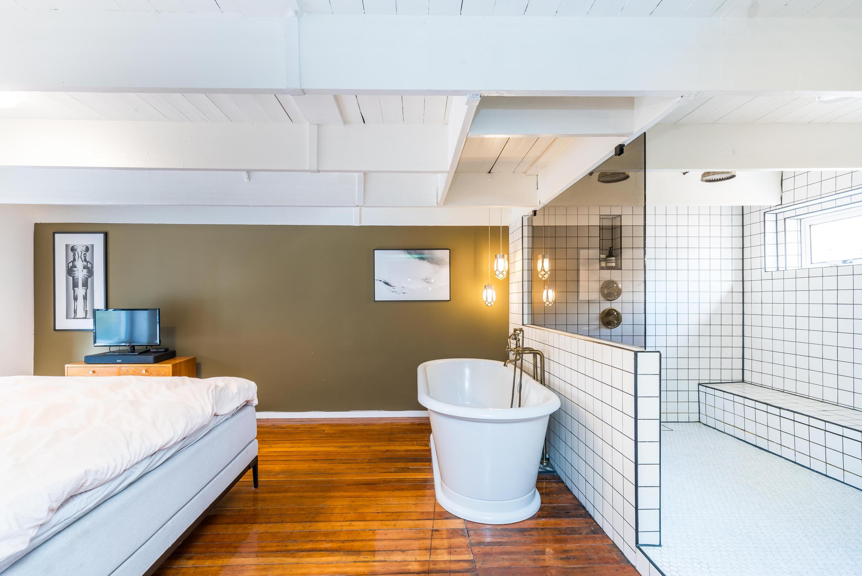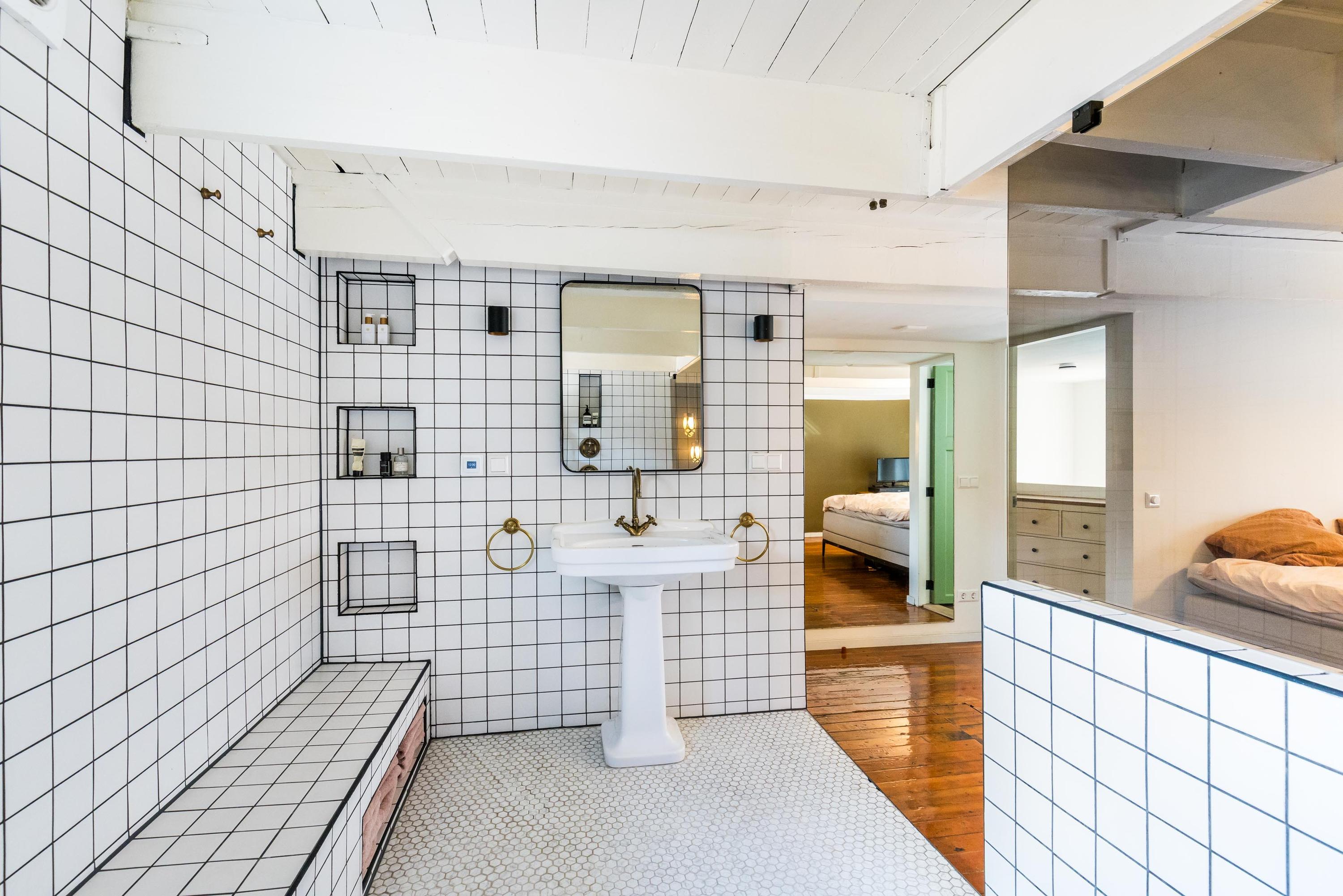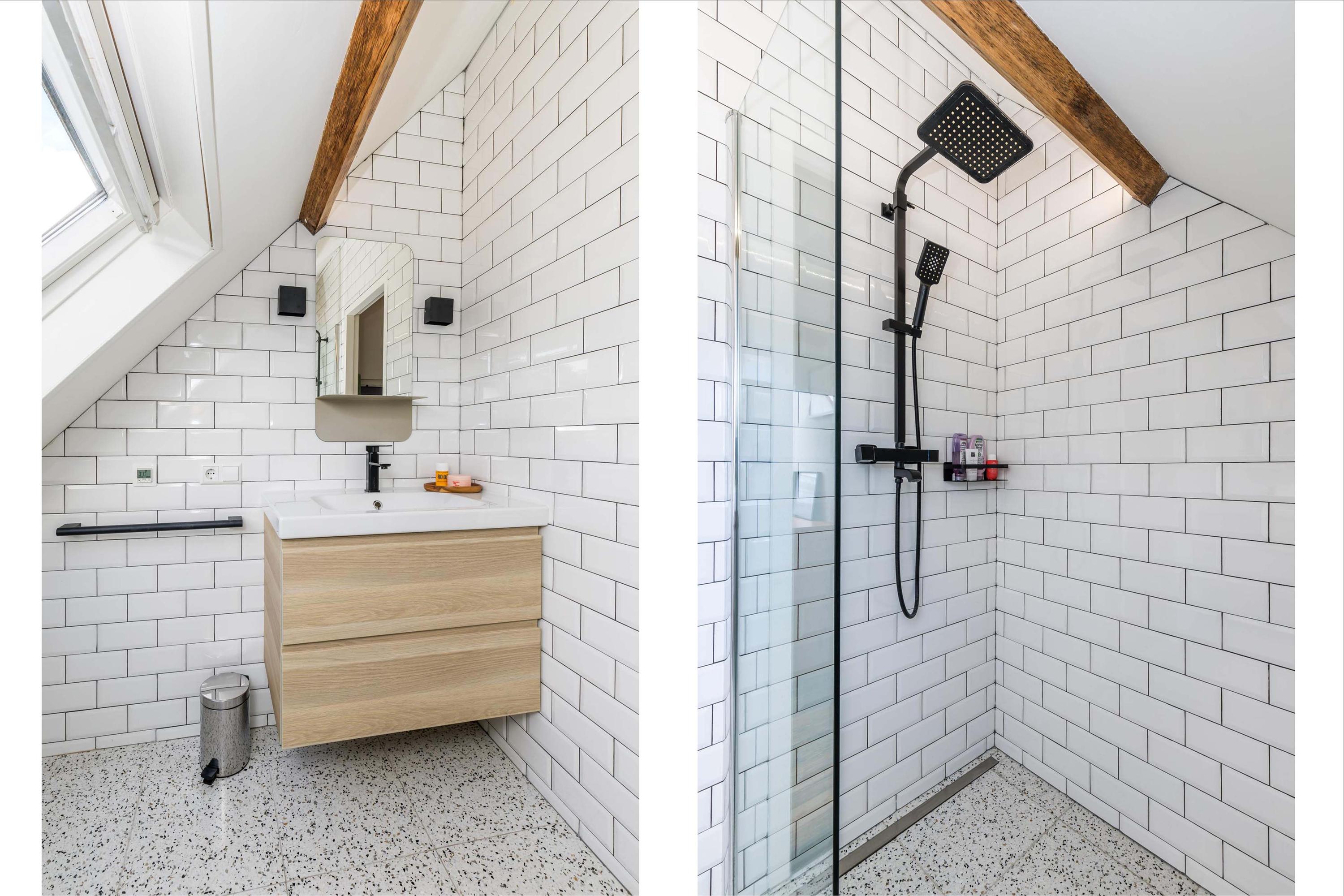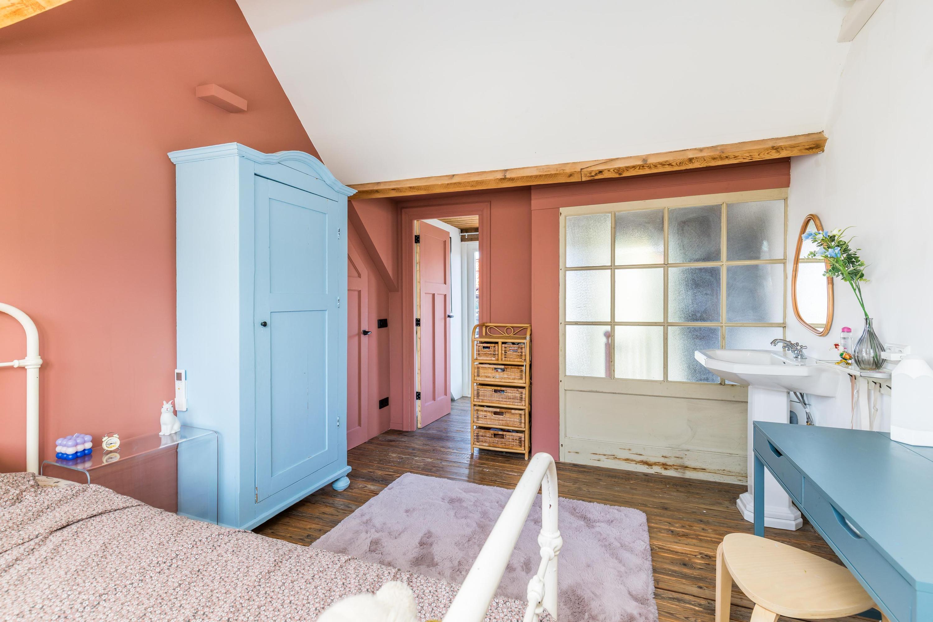 On the first floor, you’ll find a large bedroom with generous built-in wardrobes, a separate toilet, and a comfortable bathroom with a bathtub and double shower.