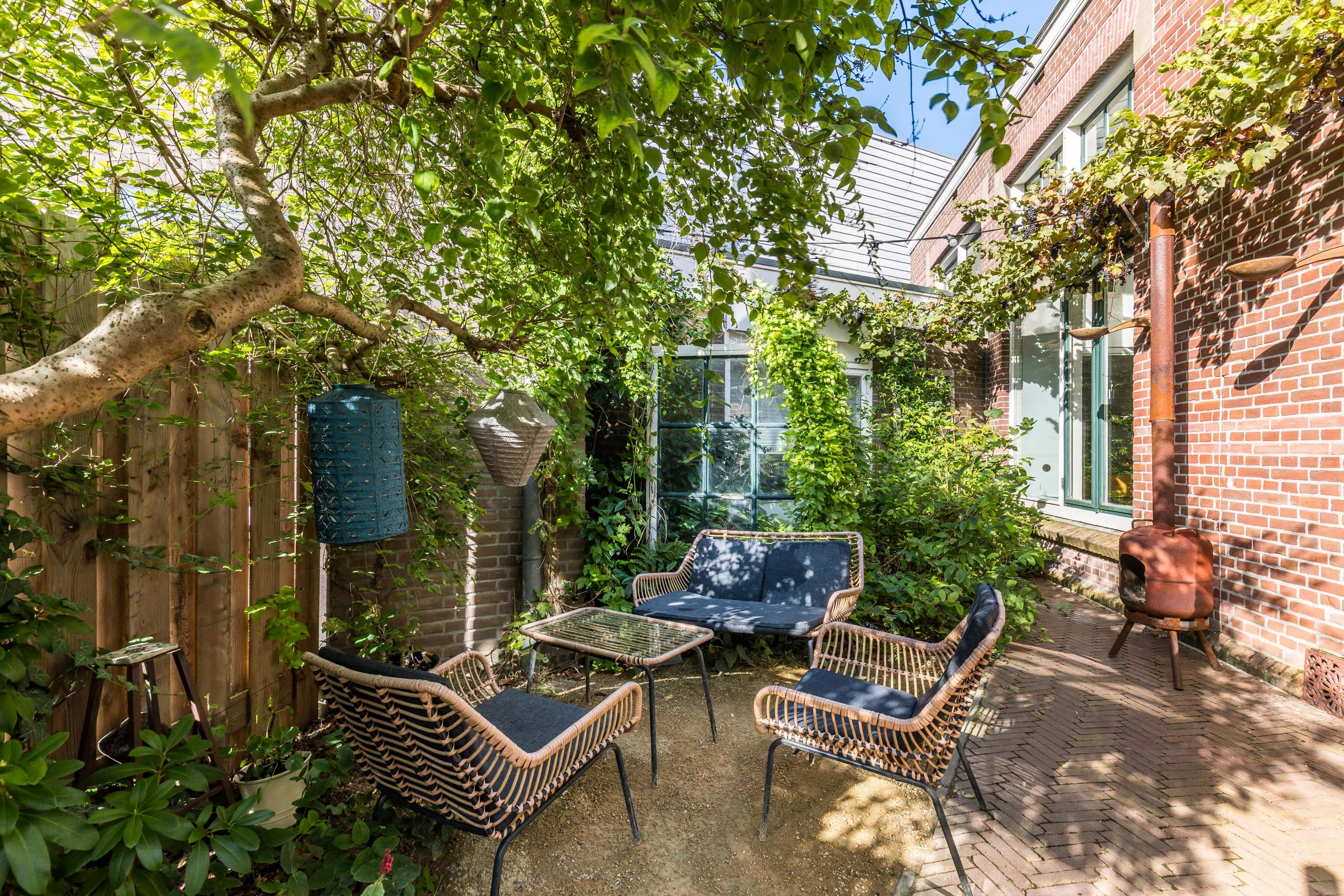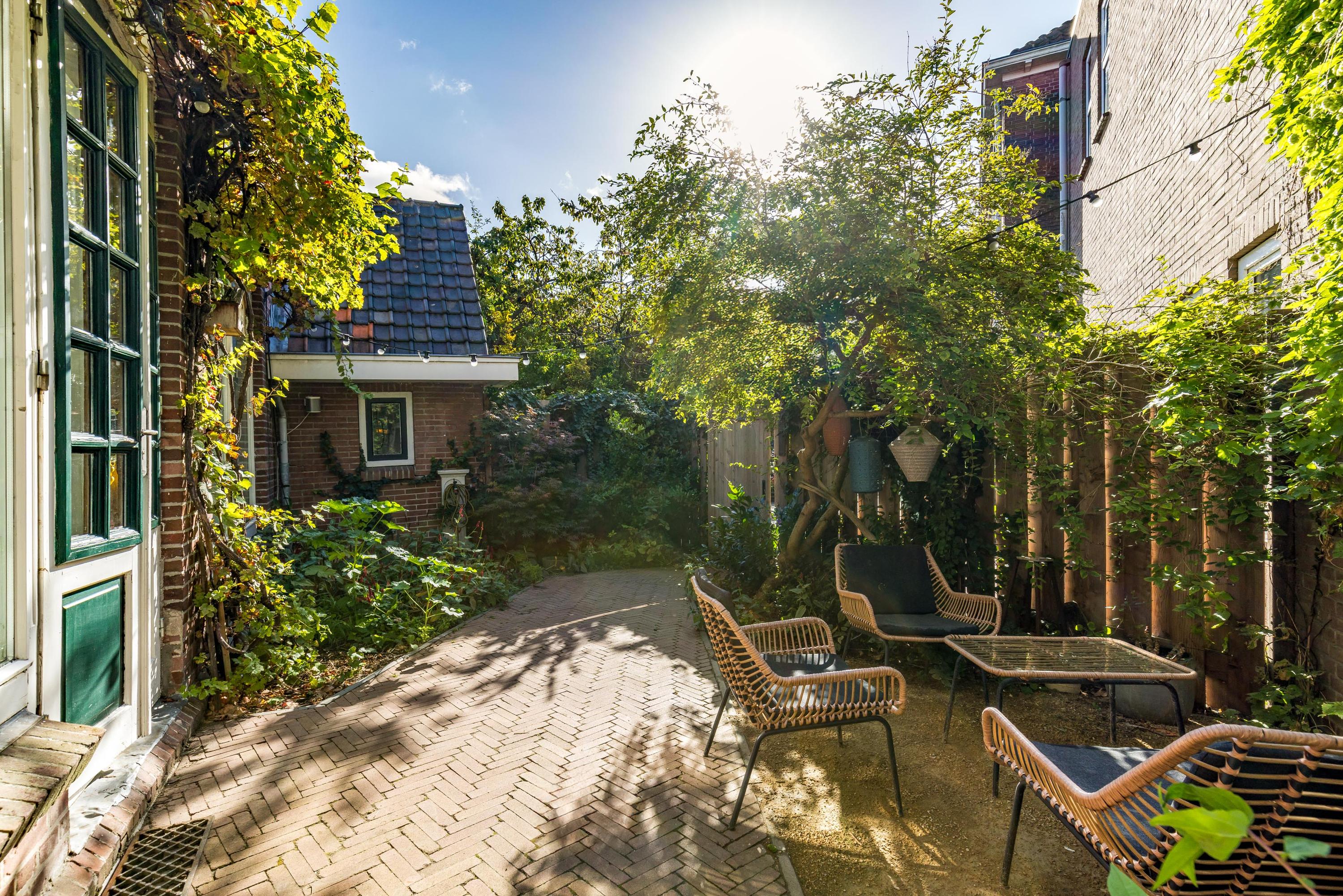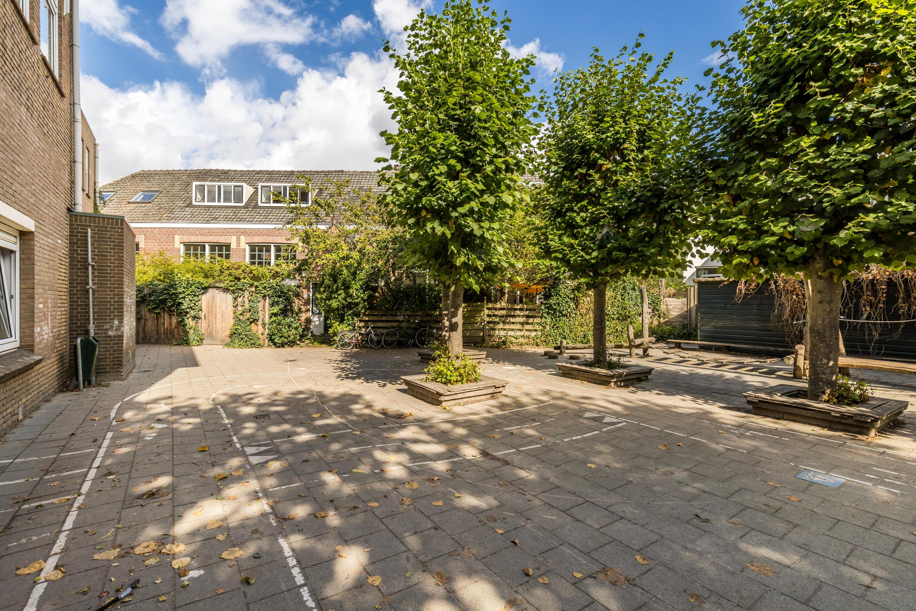 At the front lies a green, secluded garden where you can enjoy peace and privacy in the morning and afternoon sun. A gate provides access to the adjacent schoolyard, which residents are allowed to use as a play area for children or for casual gatherings and barbecues with friends.