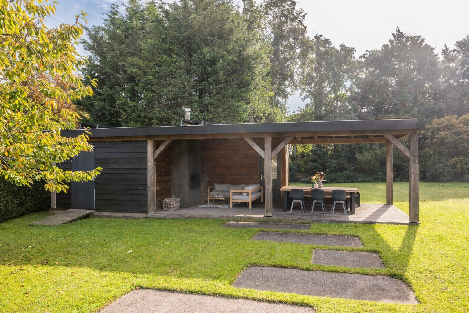 The back garden is very spacious and well landscaped. There is a lovely veranda with a wood-burning stove, seating area, storage space, electricity, lighting and (cold) water. There is also a spacious chicken coop in the garden, which will remain.