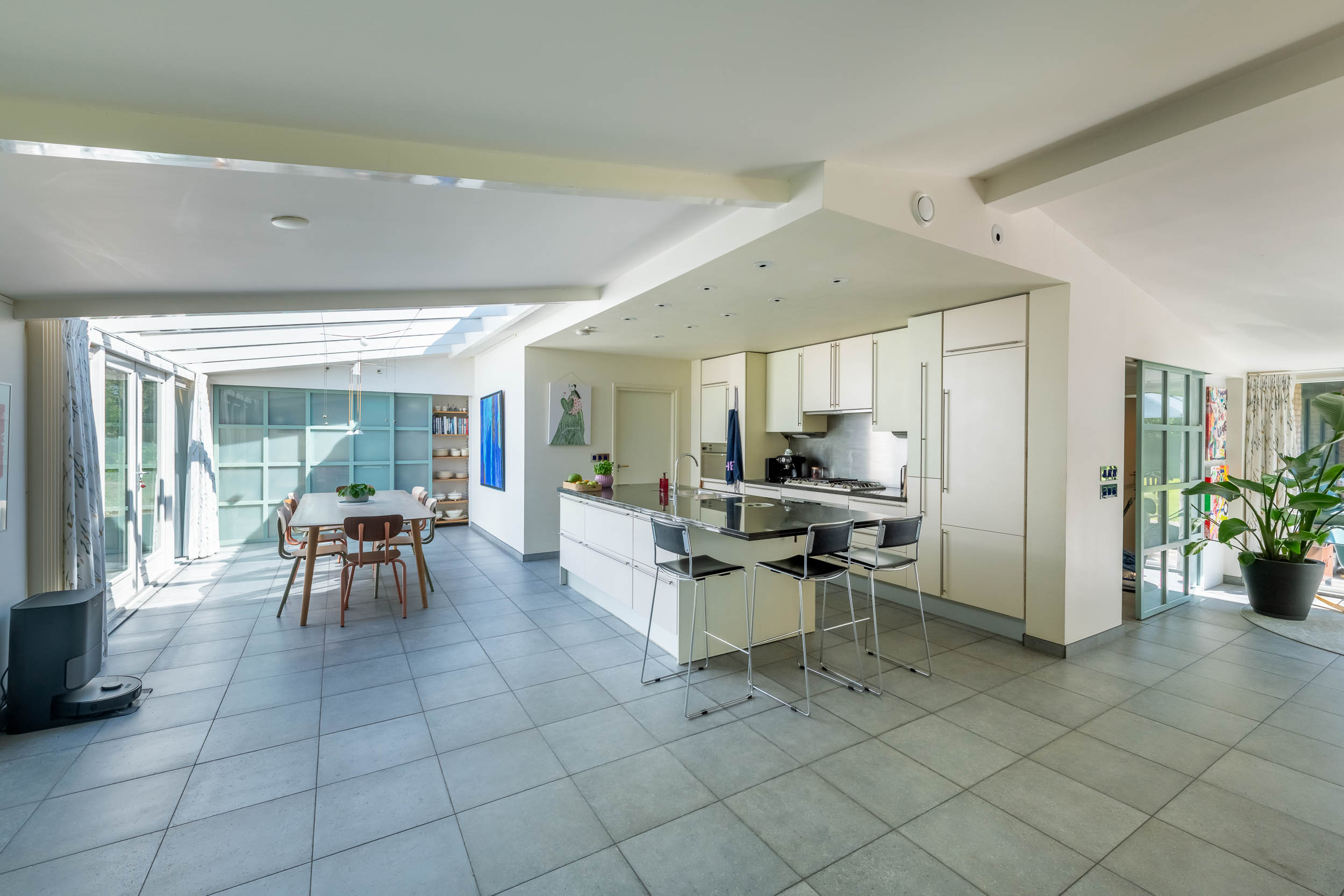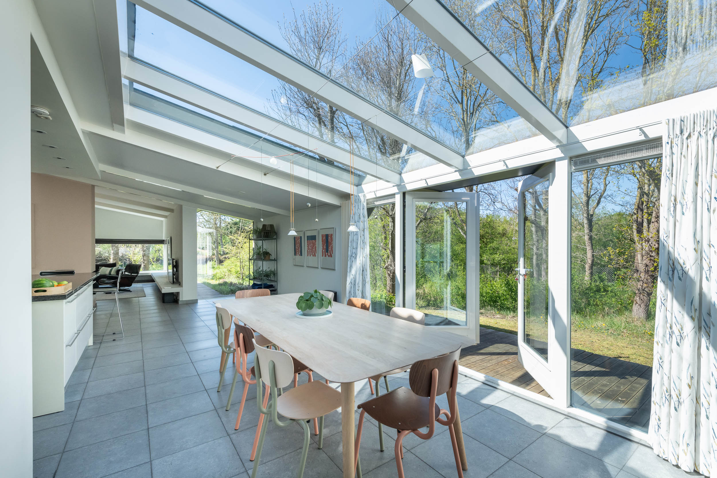 The home is approached by a long driveway with plentiful parking and features an airy living room, illuminated by large windows and two sliding doors, opening onto a sunny terrace with sweeping views of the surrounding dune garden. The wood burning stove, underfloor heating, and careful insulation including double glazing and facade insulation contribute to year round comfort, reflected in its energy class C status.