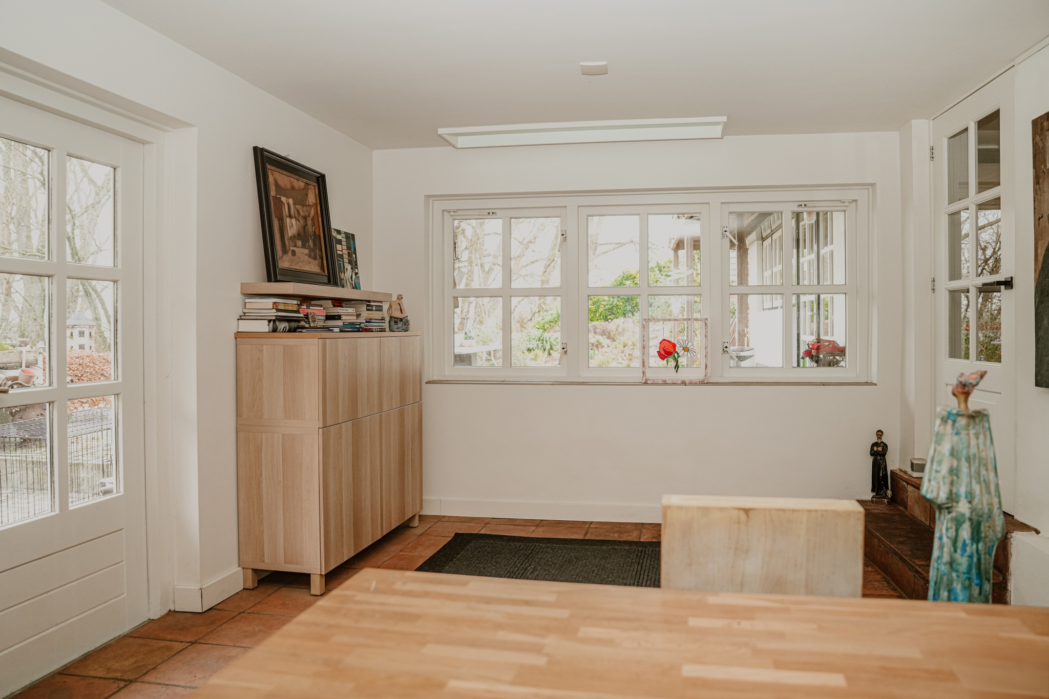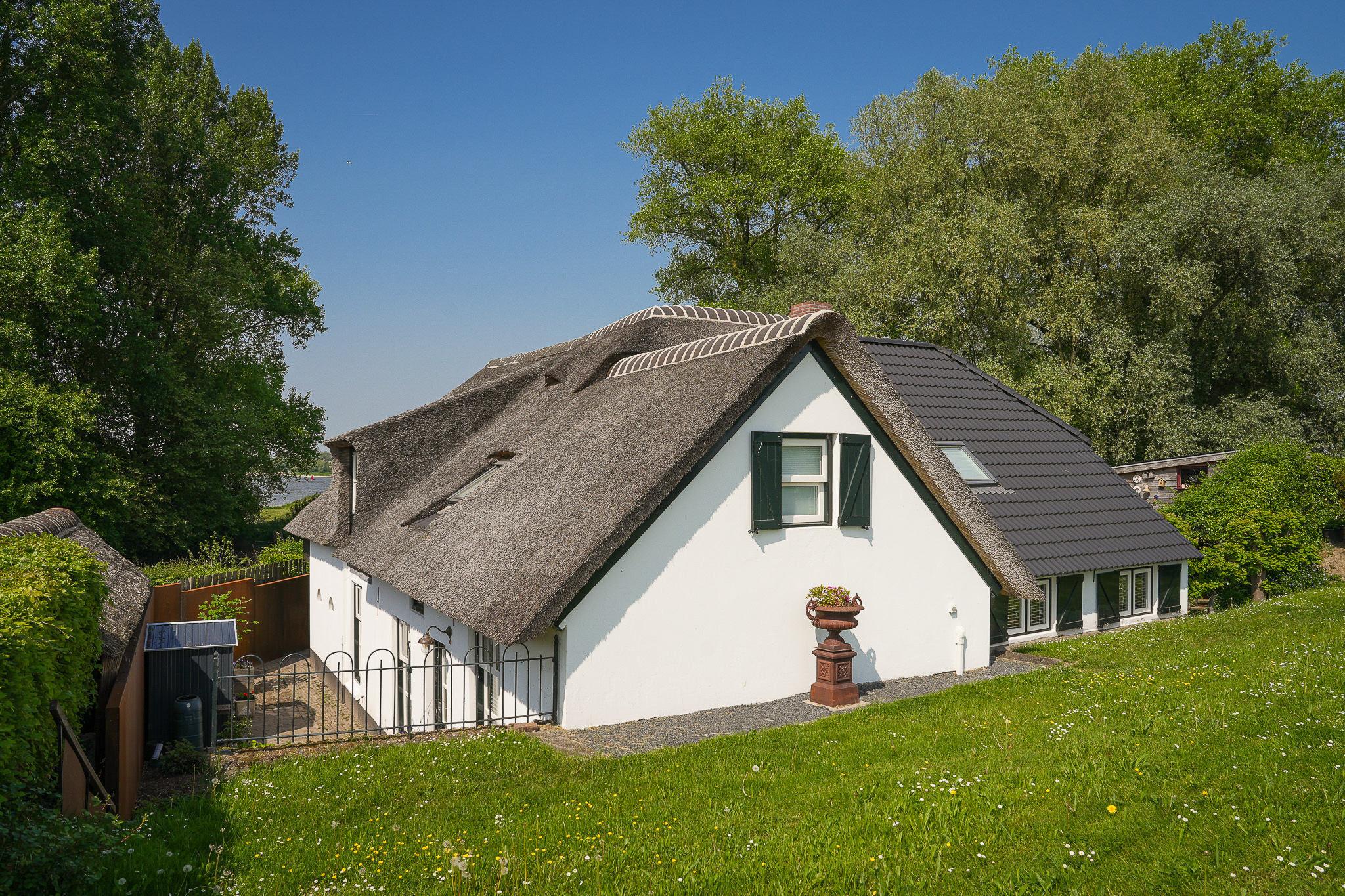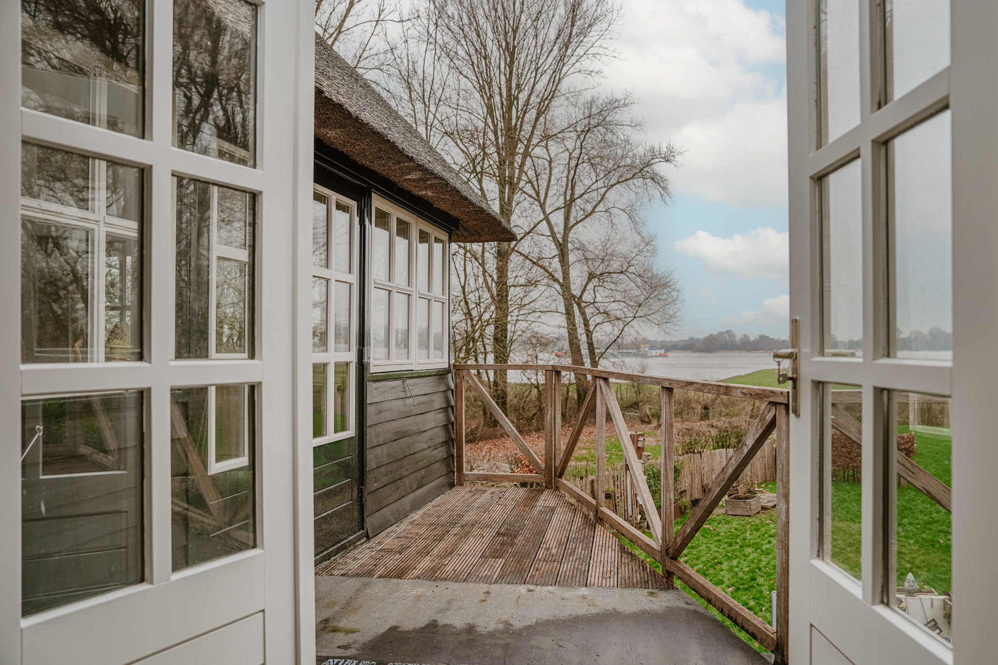 楼下空间布局包含一间卧室、全新奢华浴室、实用的杂物间,以及通过经典法式双开门通往专属露台的花园房。复古红色修道院地砖和地暖兼顾舒适与历史韵味。楼上,橡木地板与裸露木梁为临河起居室营造安静私密的氛围,而法式门通向屋顶露台,开阔美景彰显此地的独特格调。2003年加建部分提供宽敞的第二起居空间或工作室,落地窗环绕,尽揽河流与天空。